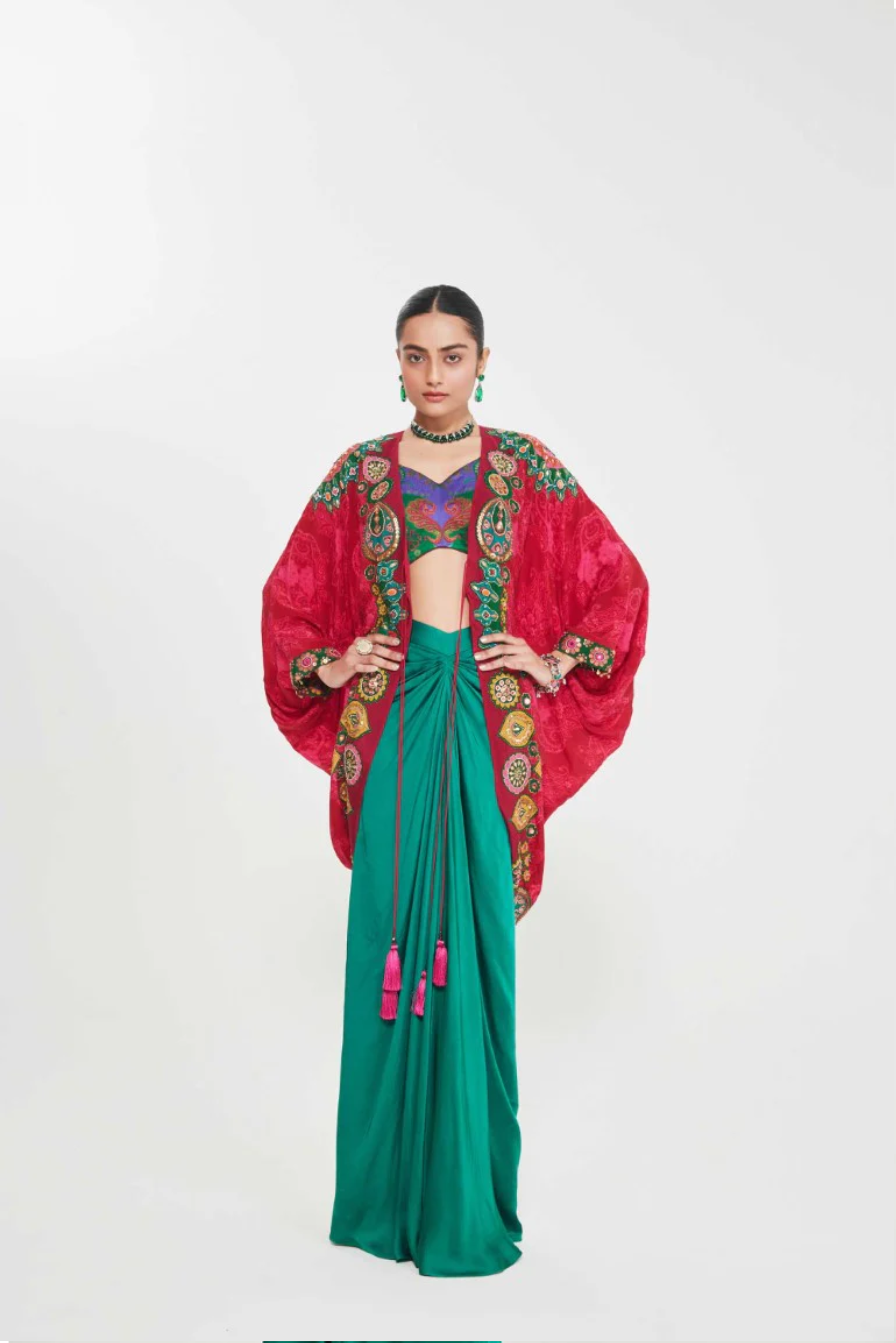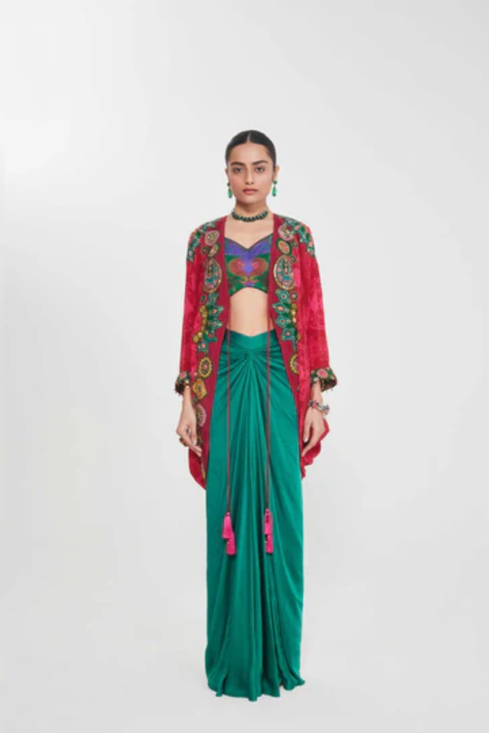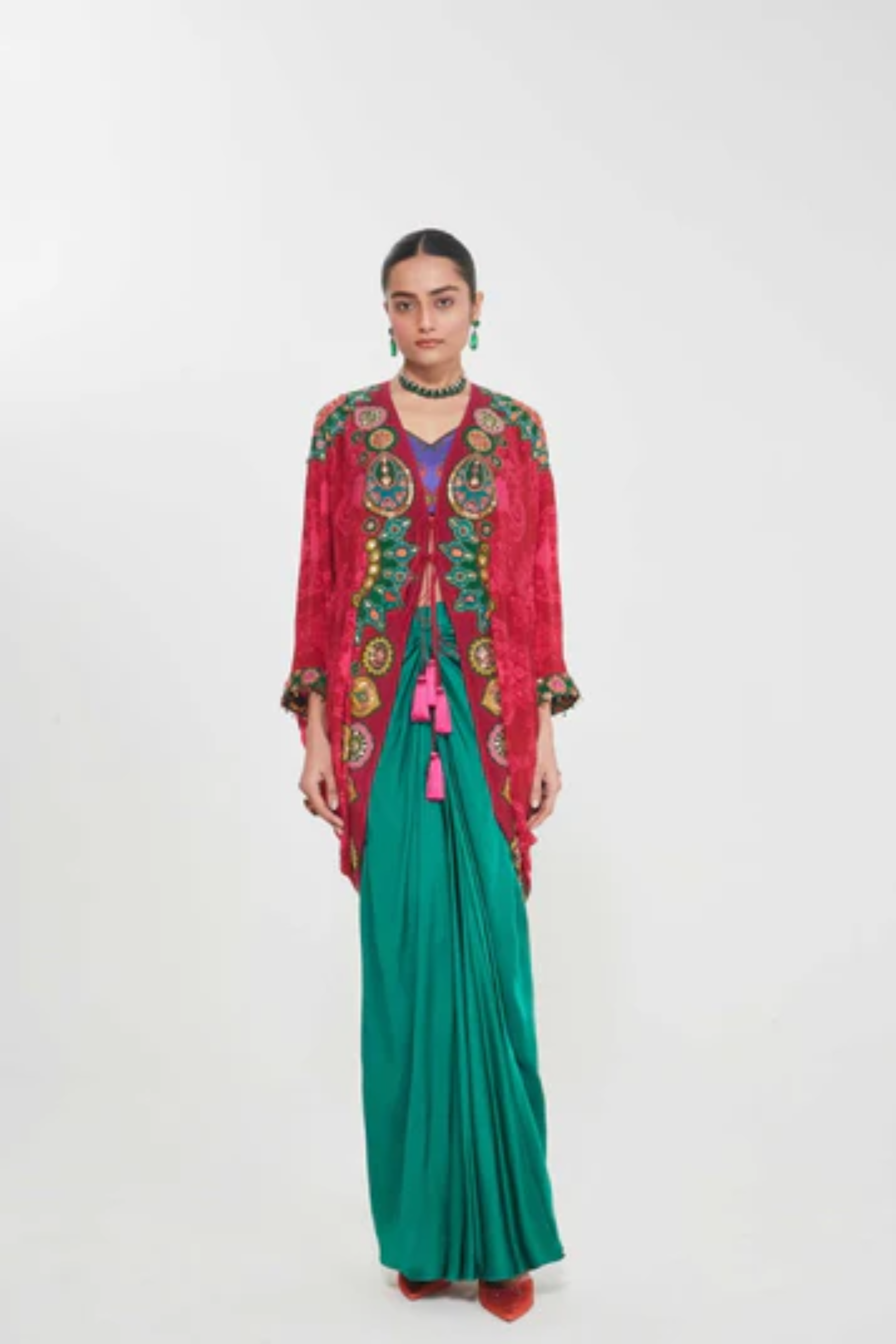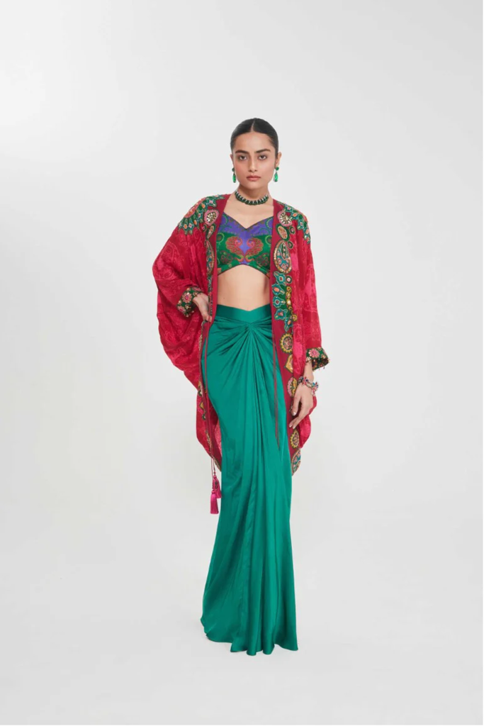Description Sb Signature Salsa Red Shrug Set With Intricate Jewel Tone Hand Embellised Border Paired With Printed Blouse And Drape Skirt. Product Code