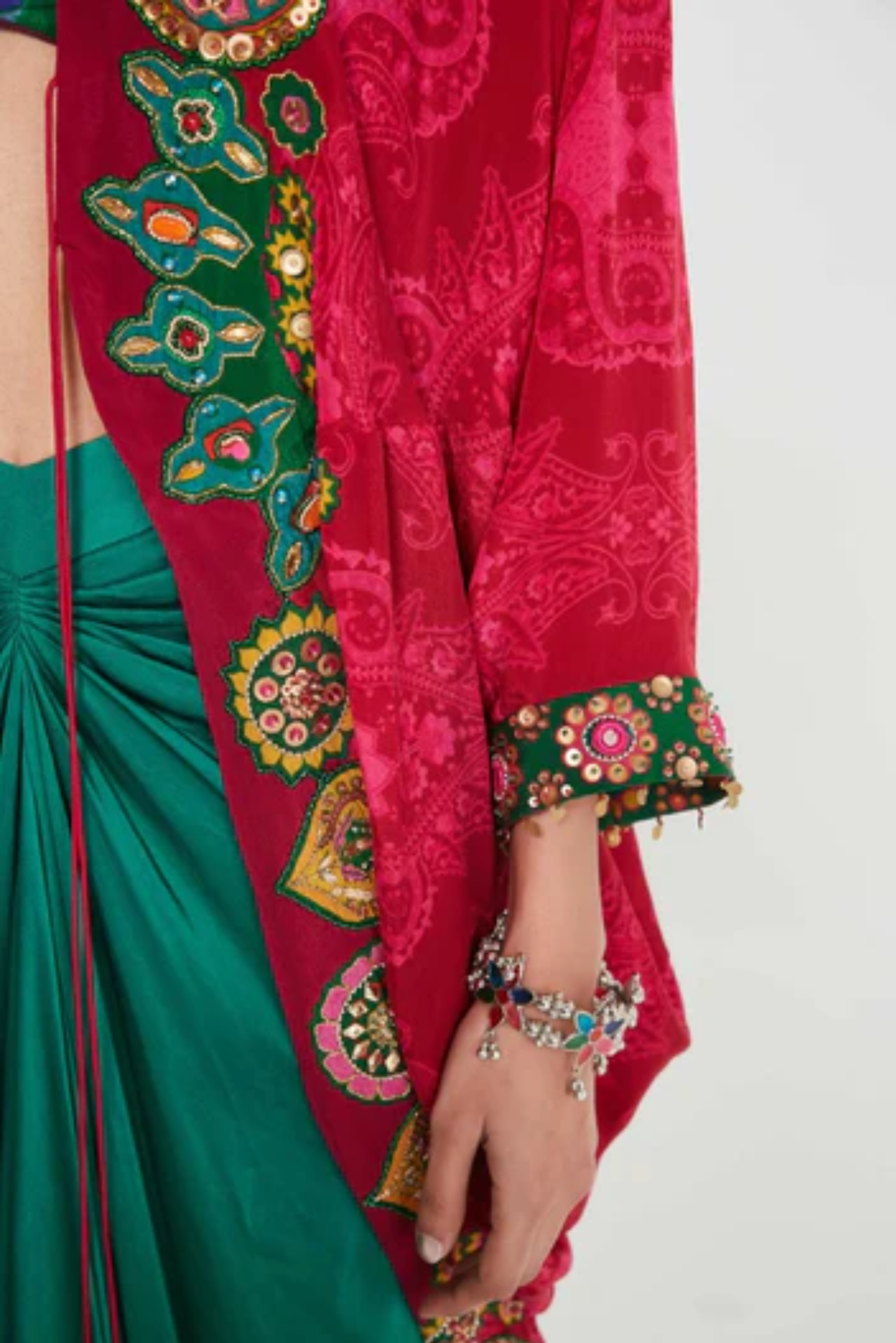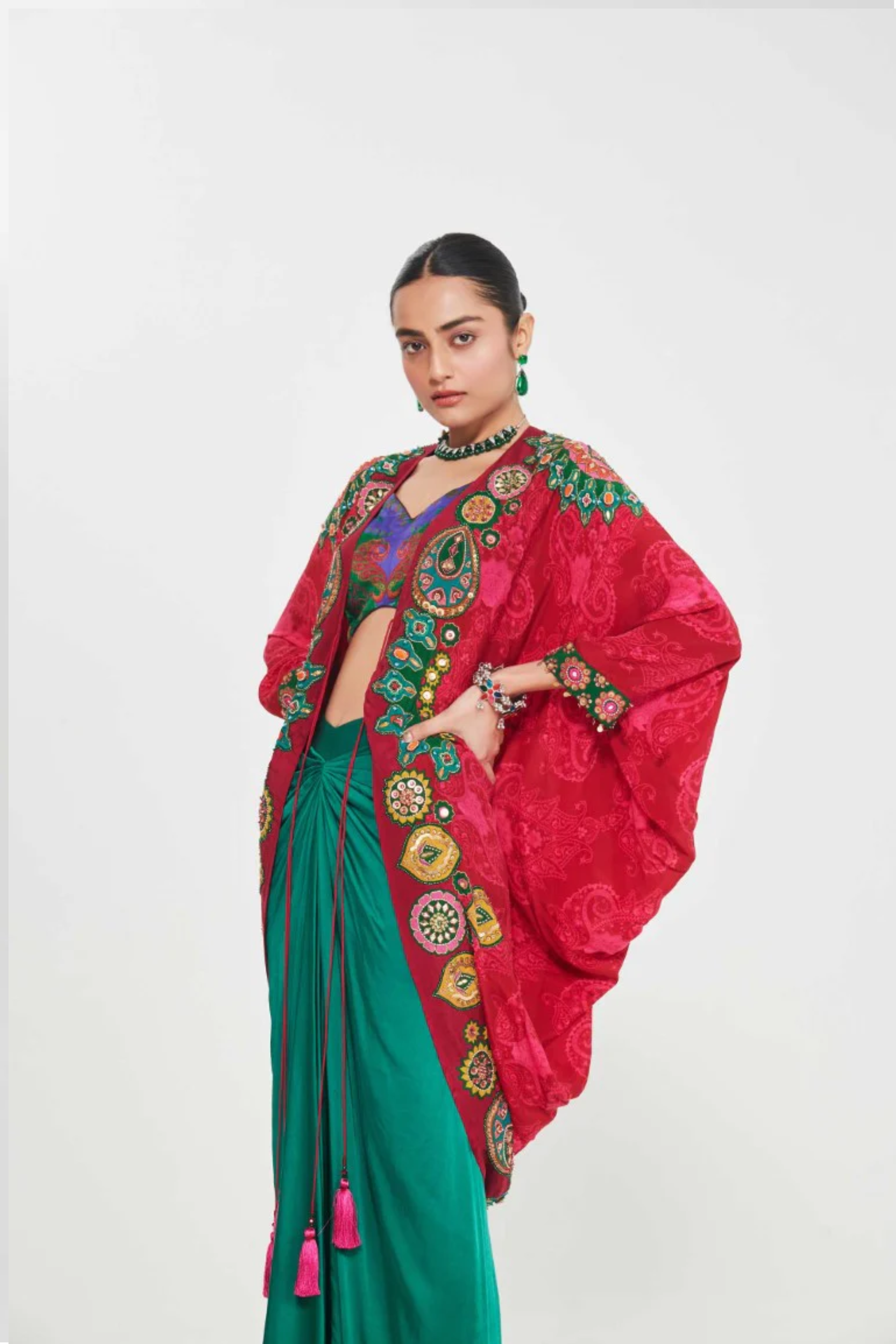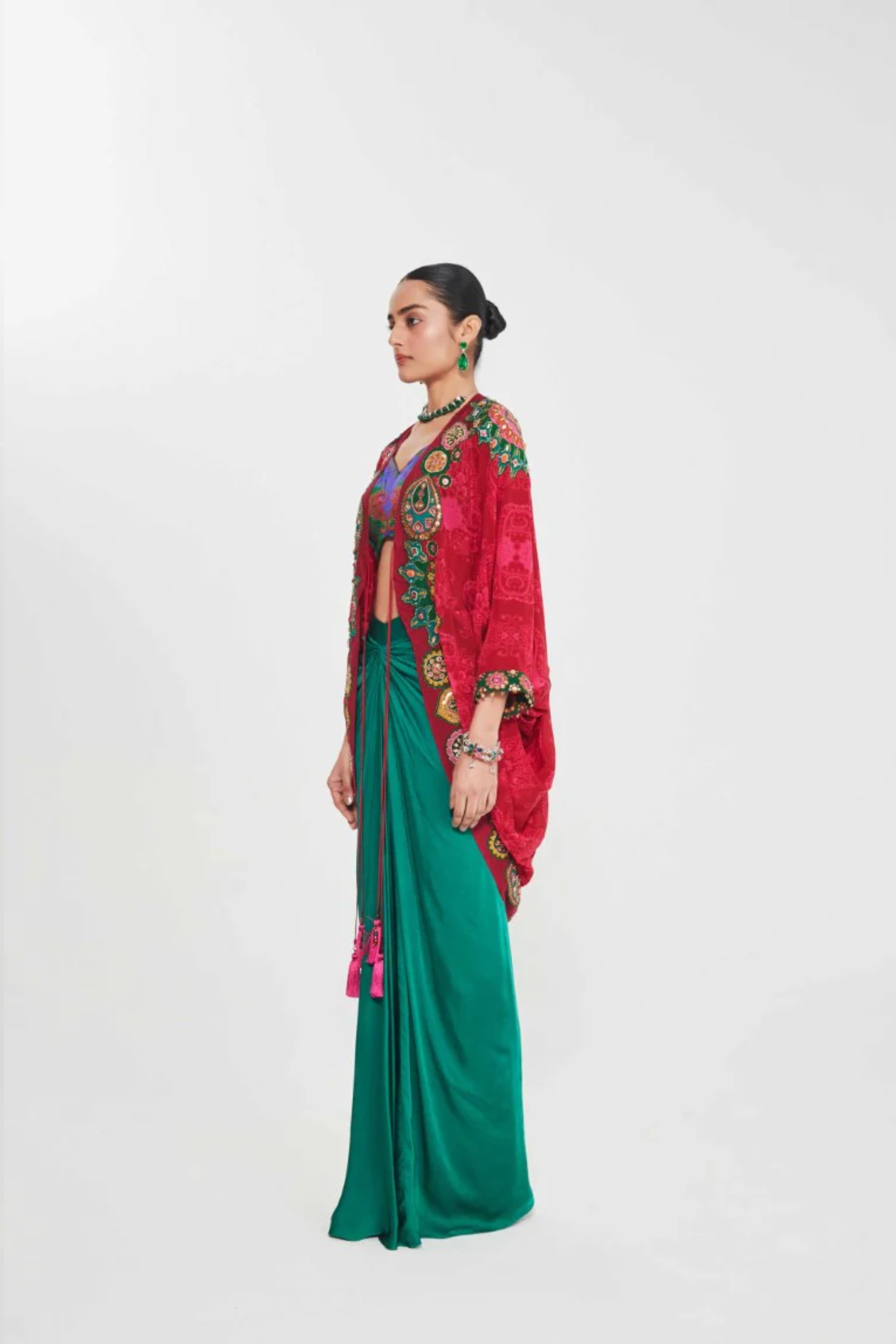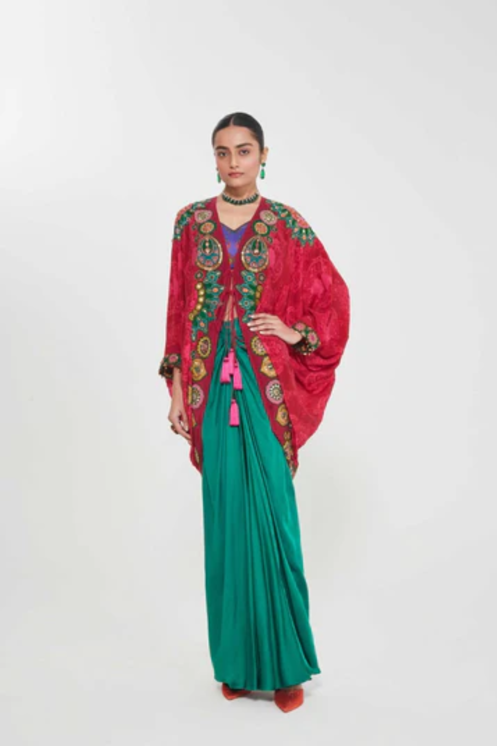 Description Sb Signature Salsa Red Shrug Set With Intricate Jewel Tone Hand Embellised Border Paired With Printed Blouse And Drape Skirt. Product Code