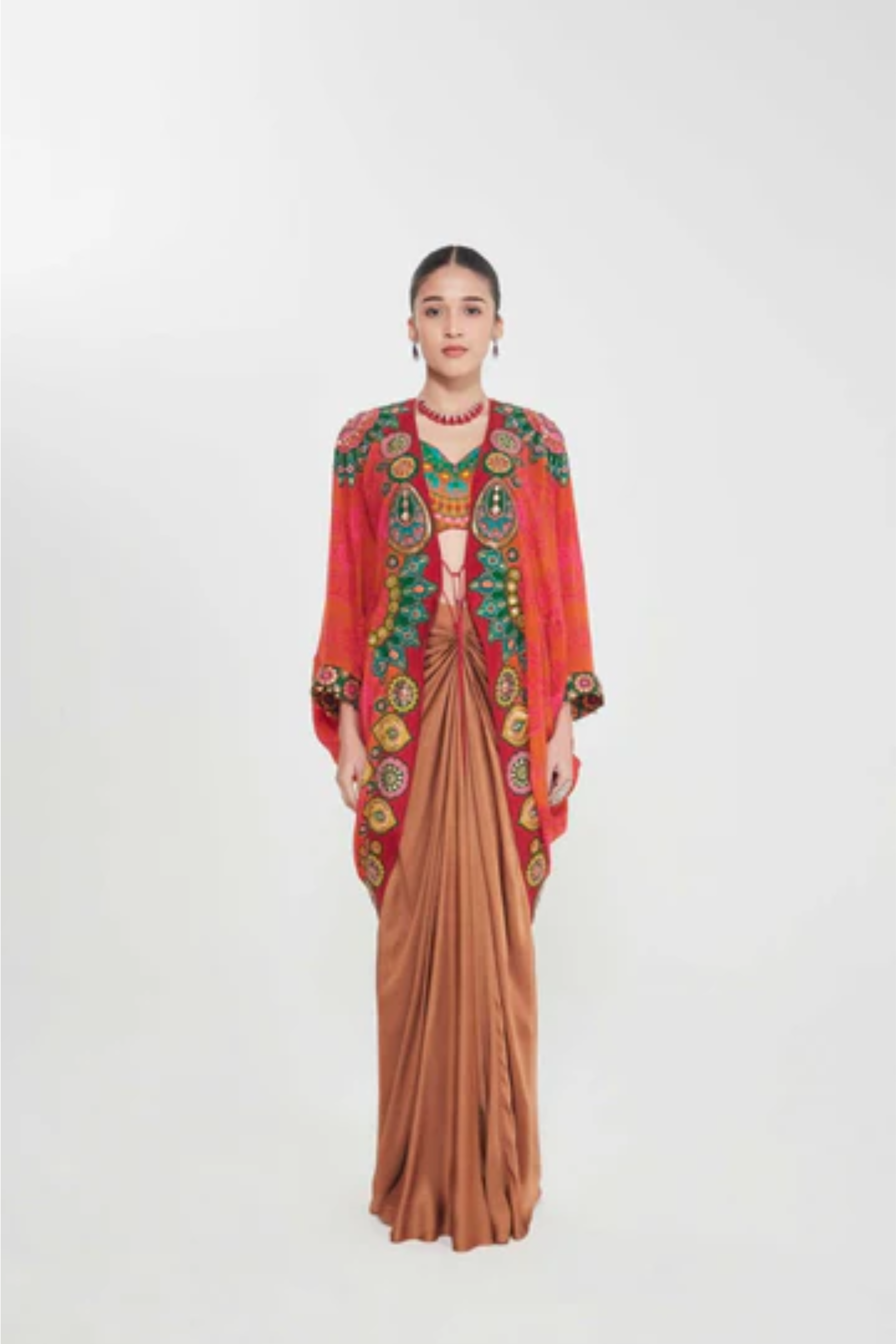 Description Sb Signature Sahara Sunset Orange Shrug Set With Intricate Jewel Tone Hand Embellished Border Paired With Printed Blouse And Drape Skirt. Product Code