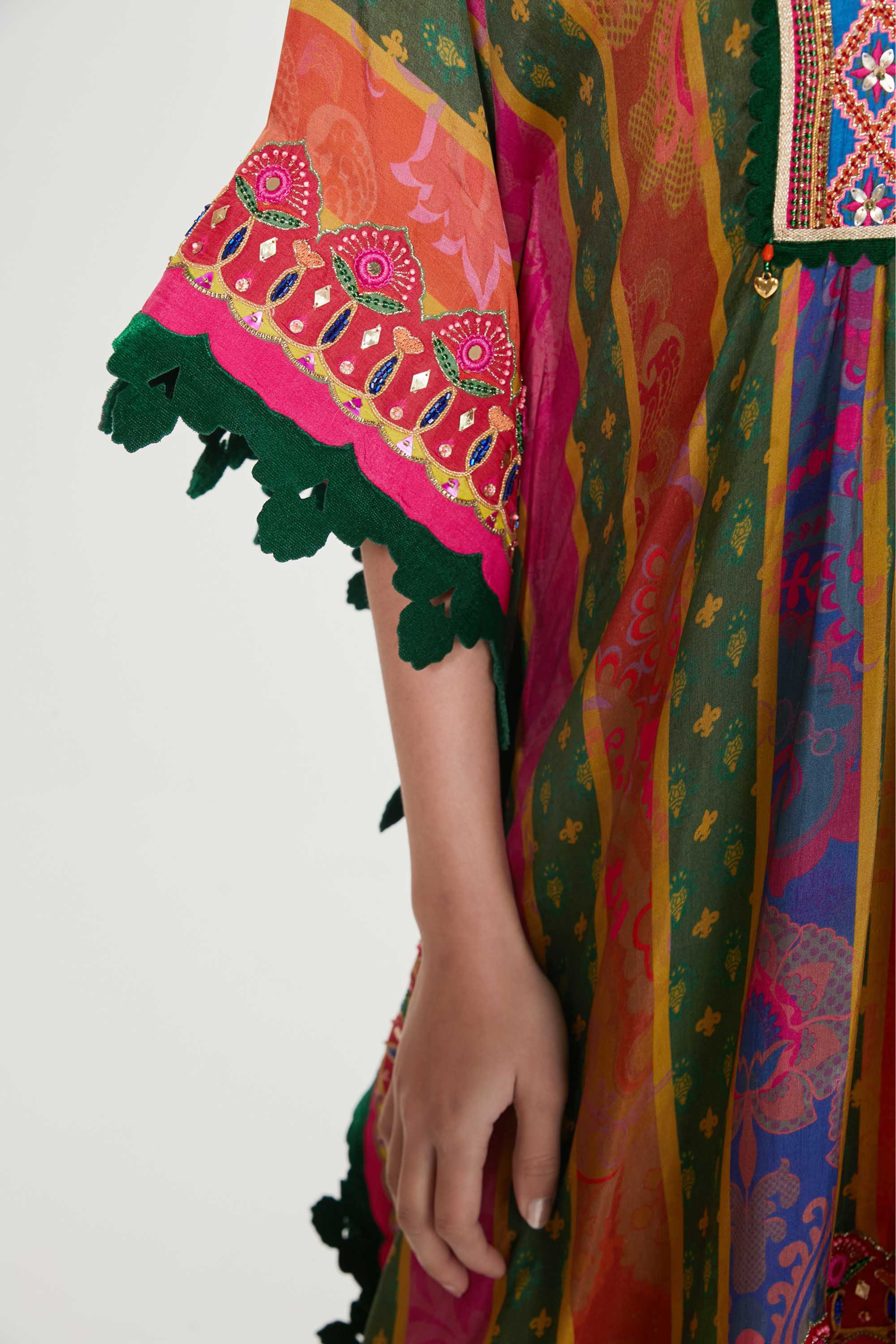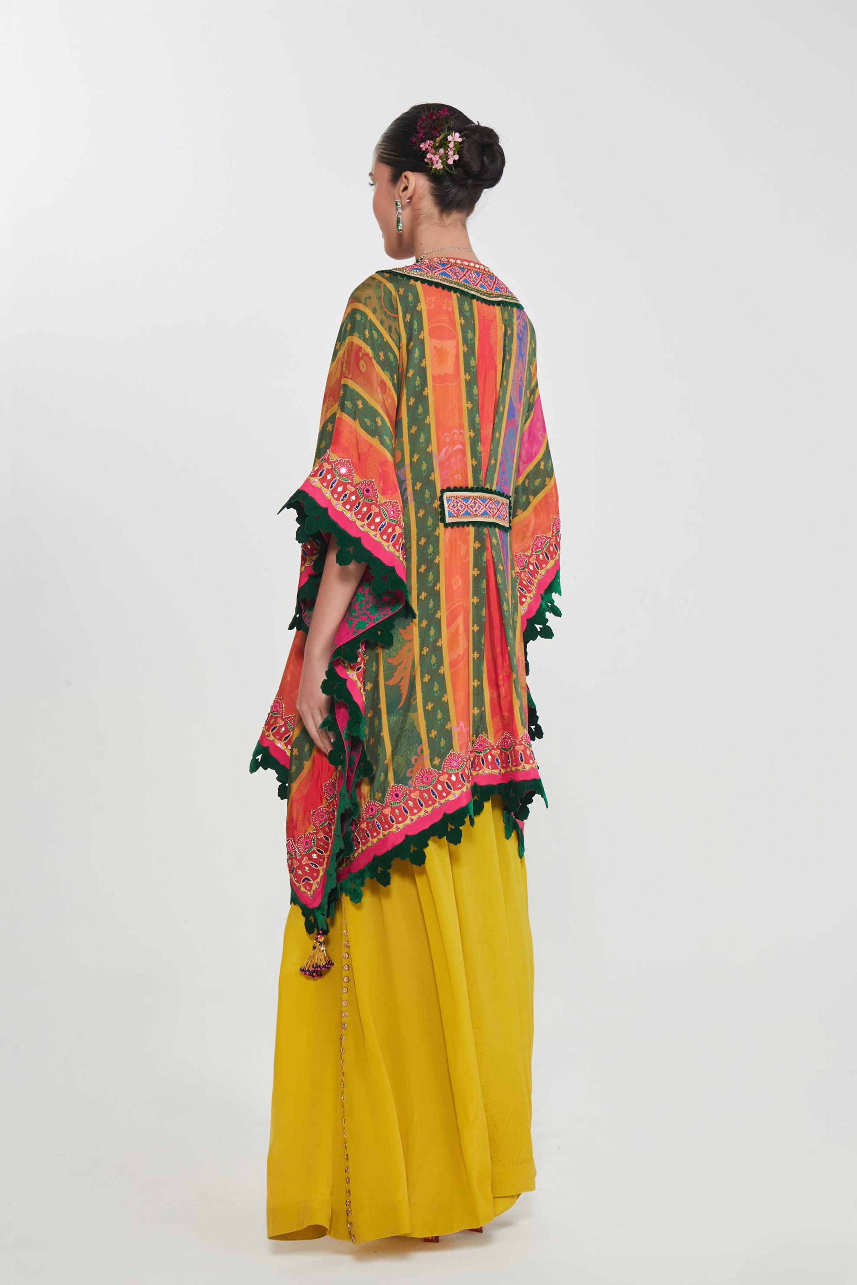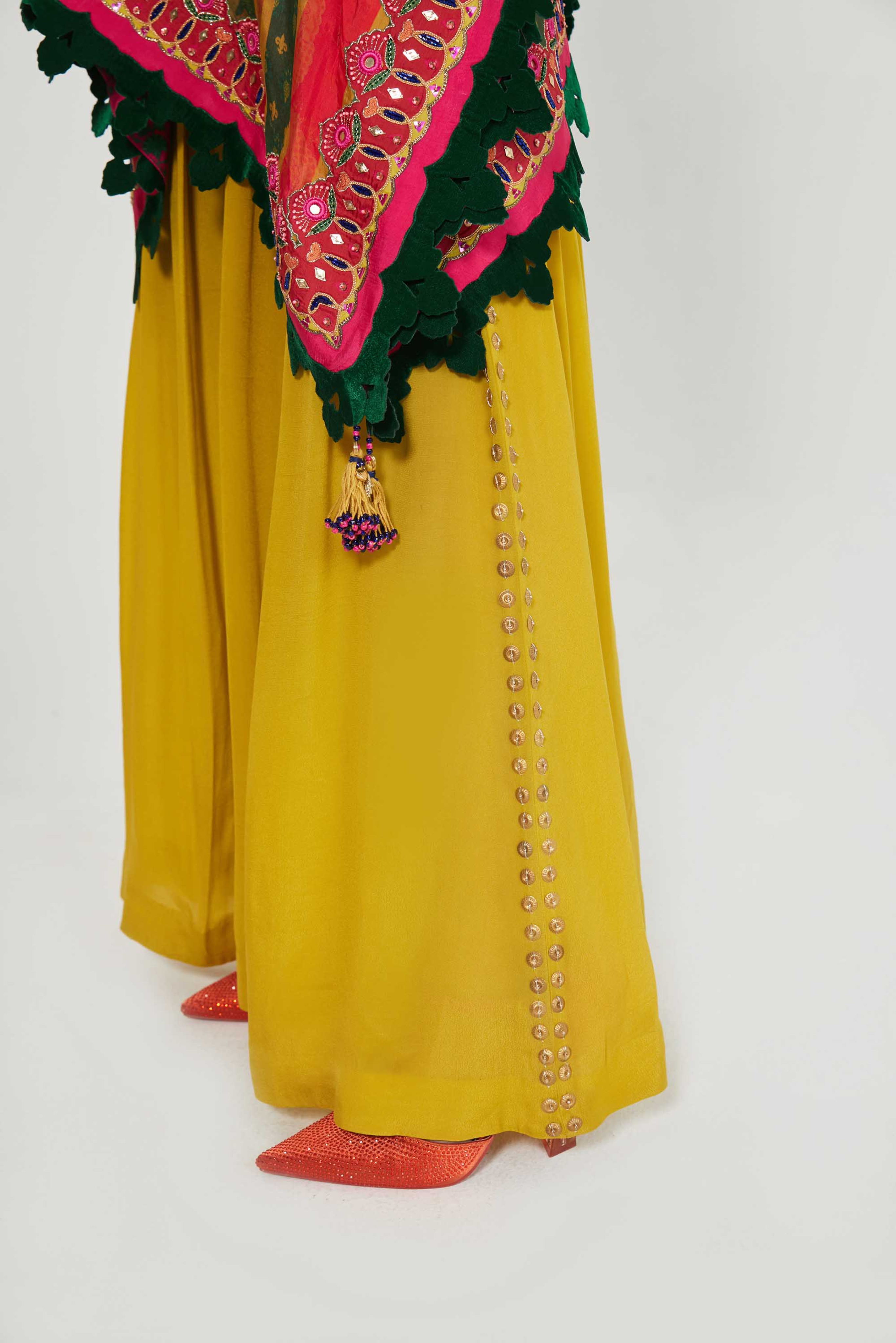Mustard Orange Hand Embroidered, Mirror Work Kaftan Set, Signature Hamsa Hand Crafted Tassels, Velvet Cutout Trims Detailing At The Hamline, Paired With Blazing Yellow Pleated Pants With Metallic Details At Side.