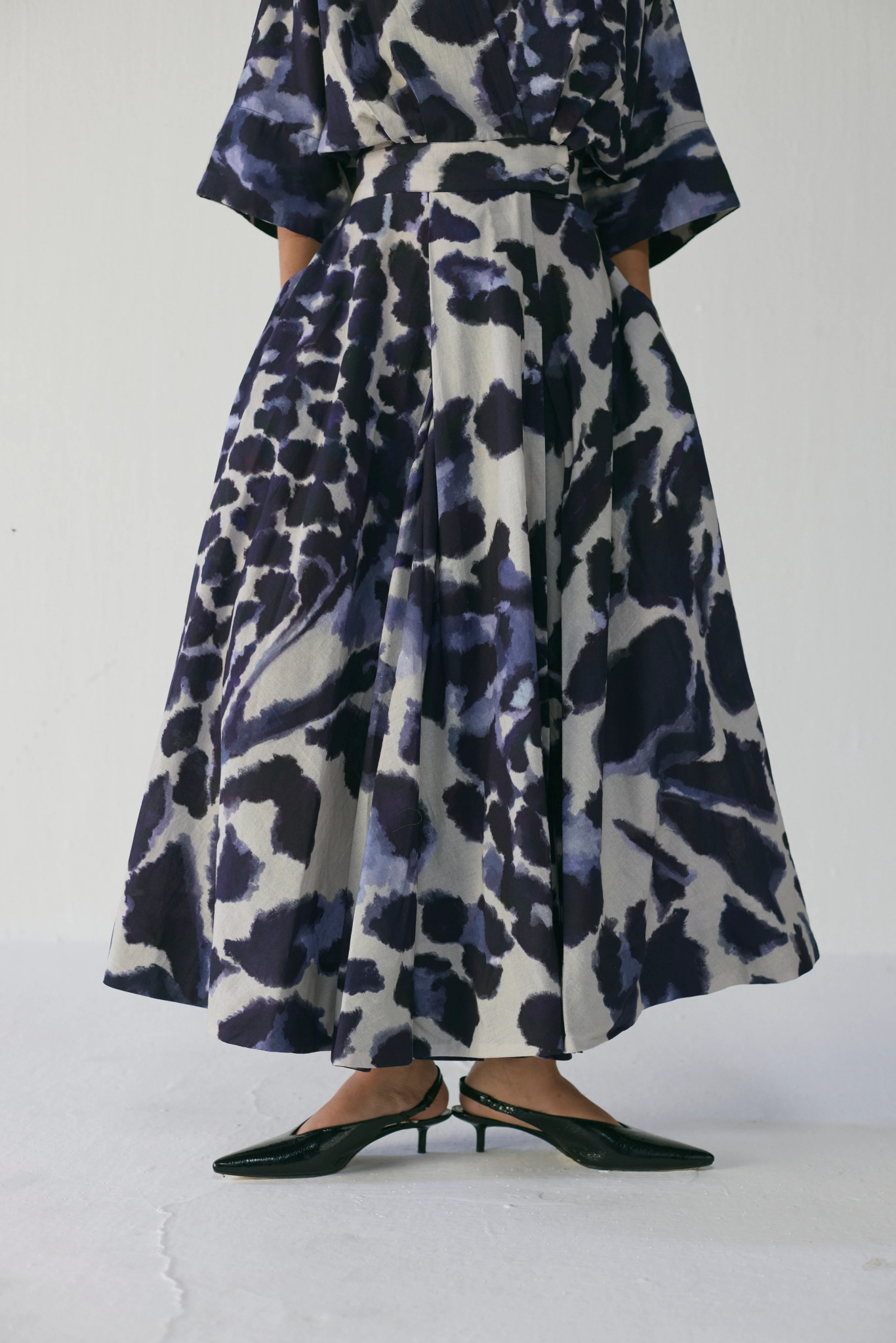 The dress is elevated with a belted waist that accentuates the figure and side pockets for added ease and functionality. Adorned with a striking indigo and ivory abstract print, it makes a statement of effortless sophistication.