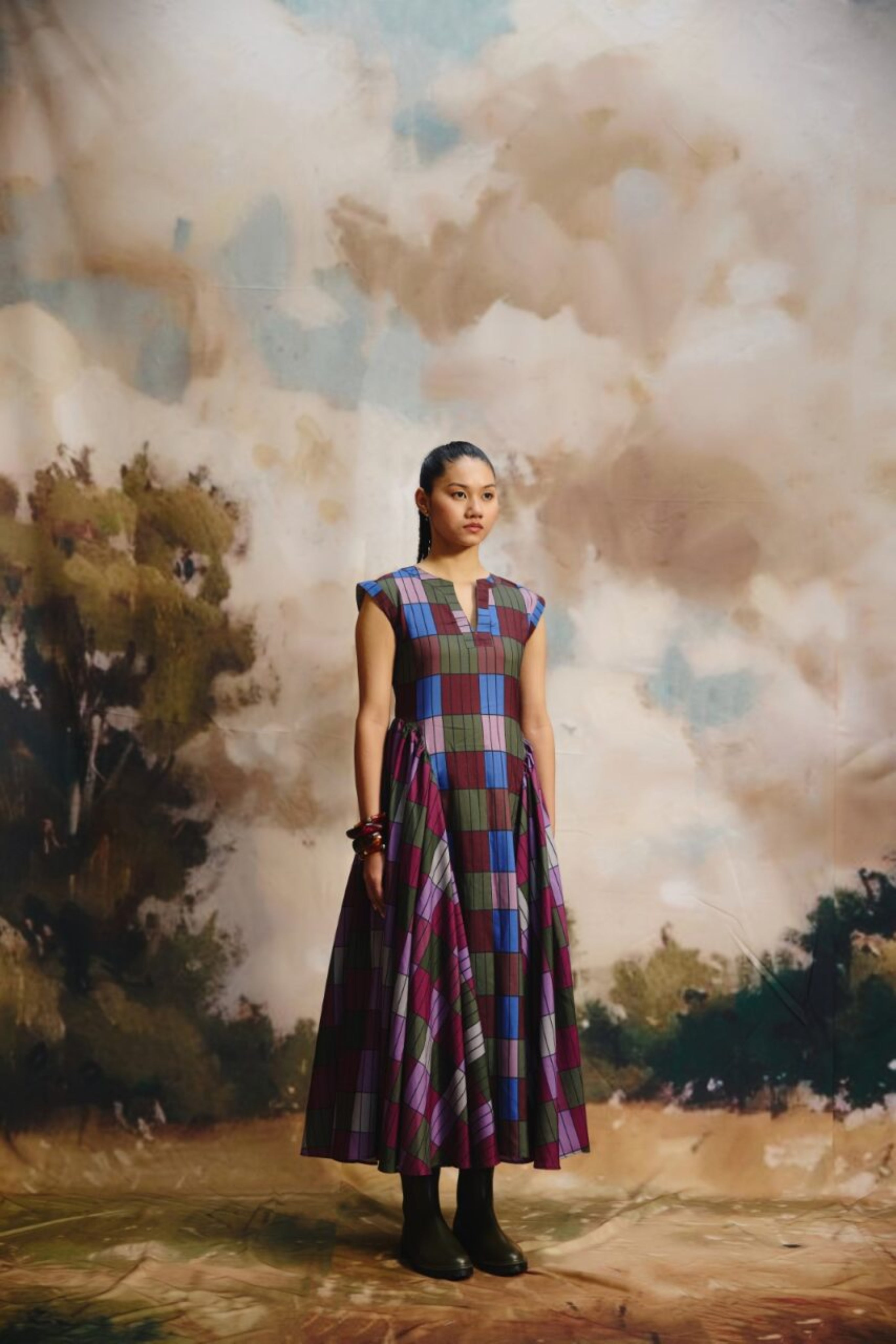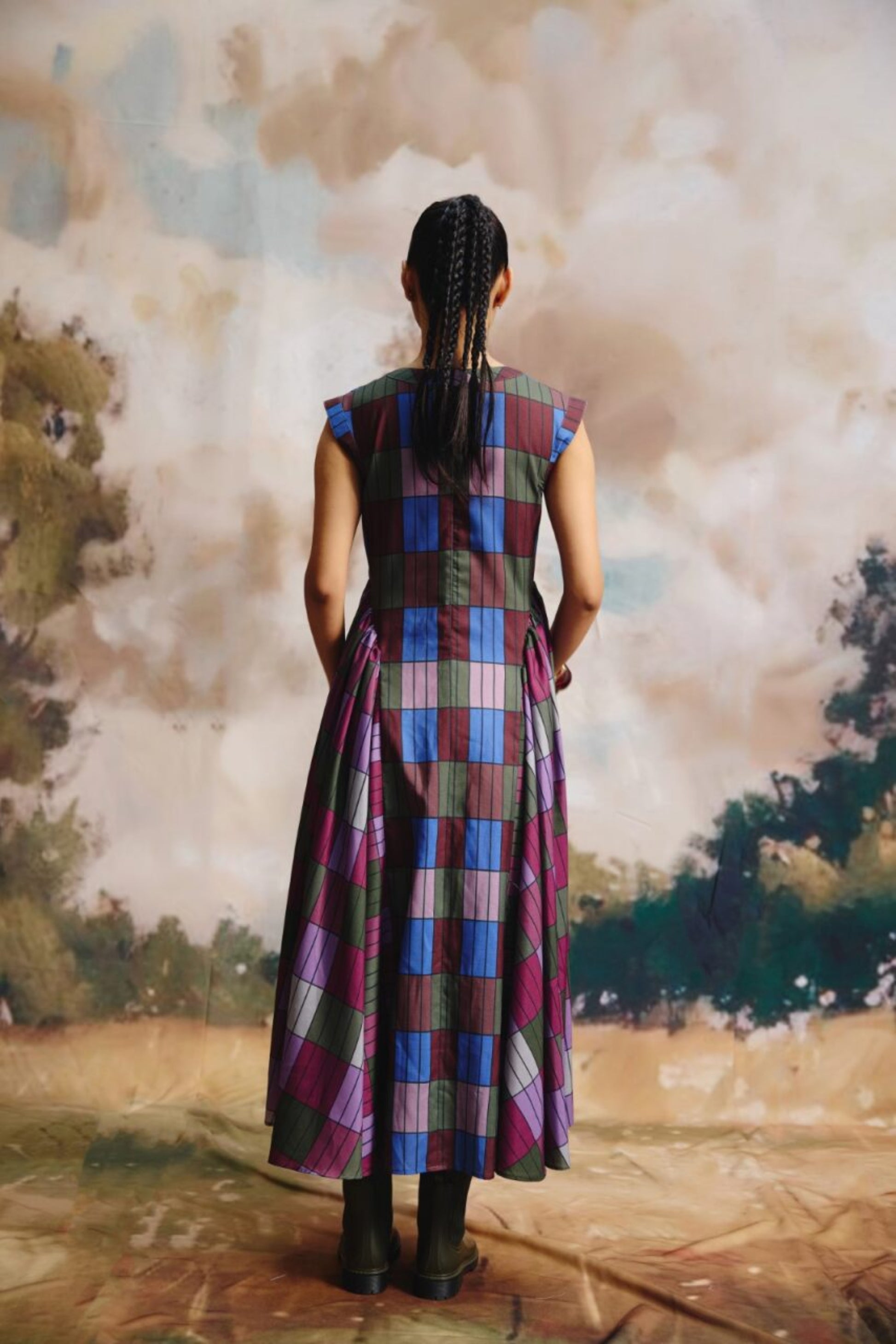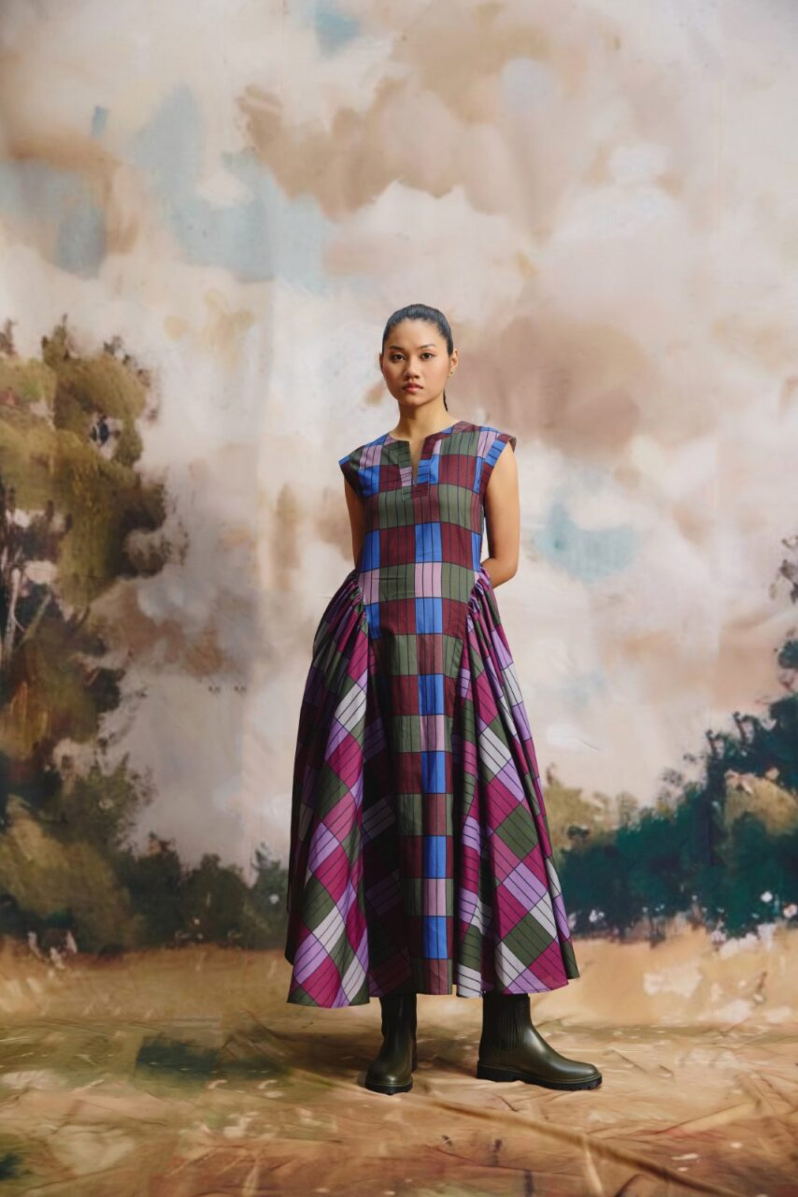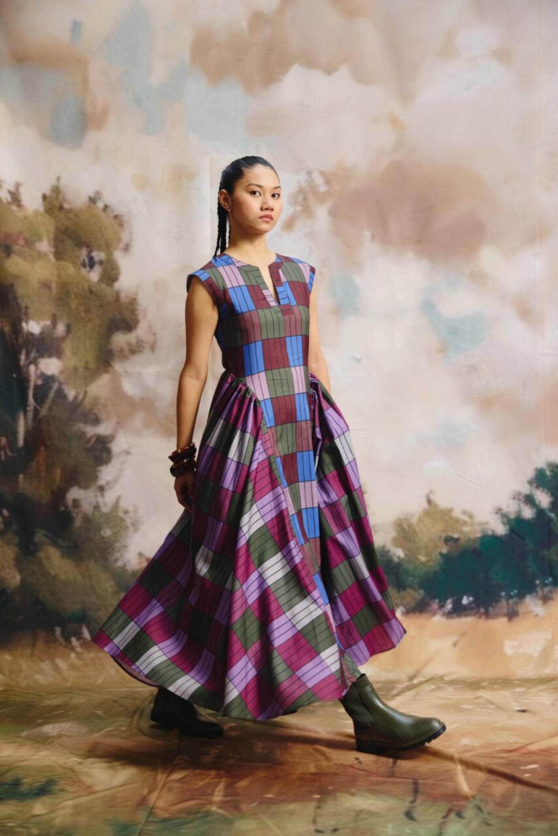 This long dress features a long plaid design with a fitted bodice that flows into like a full skirt creating a flattering silhouette. The dress embodies a blend of classic style and modern touch.
