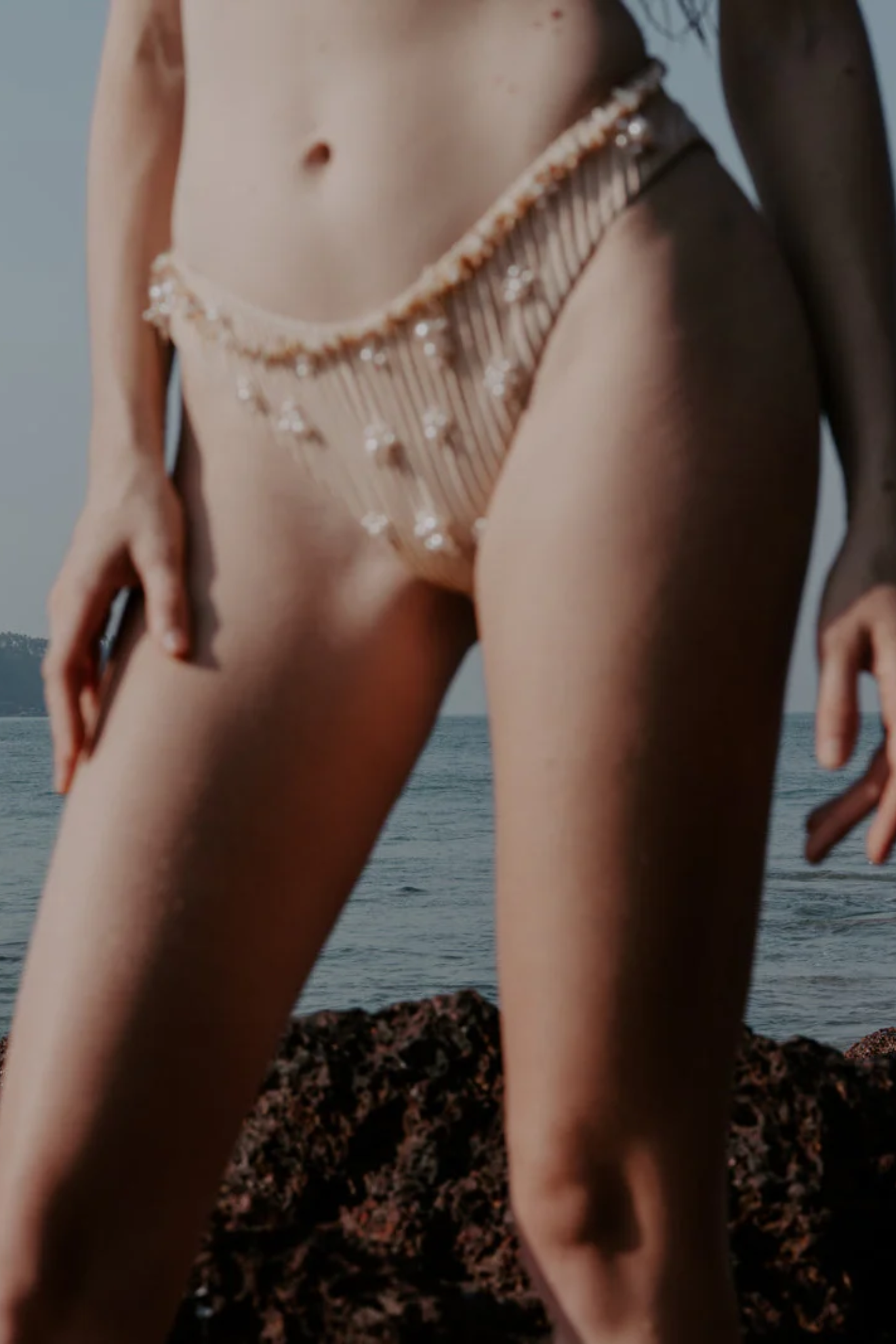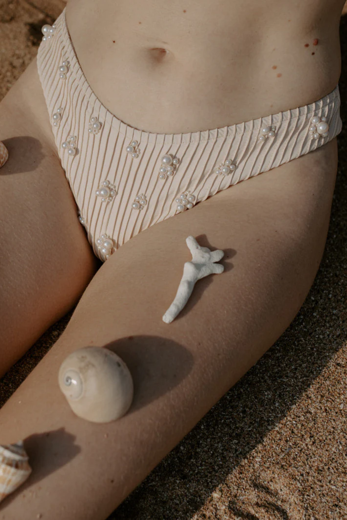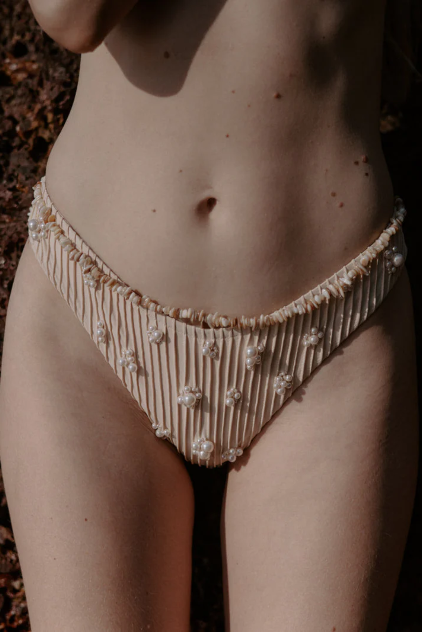Designed for the modern goddess, the Scallop Bikini Bottom is the epitome of elegance. Featuring unique scalloped texture, adorned with delicate pearl and shell-inspired details, this piece blends high fashion with coastal charm. The high-cut silhouette elongates your legs, while the the soft, neutral hue offers a sophisticated touch.
