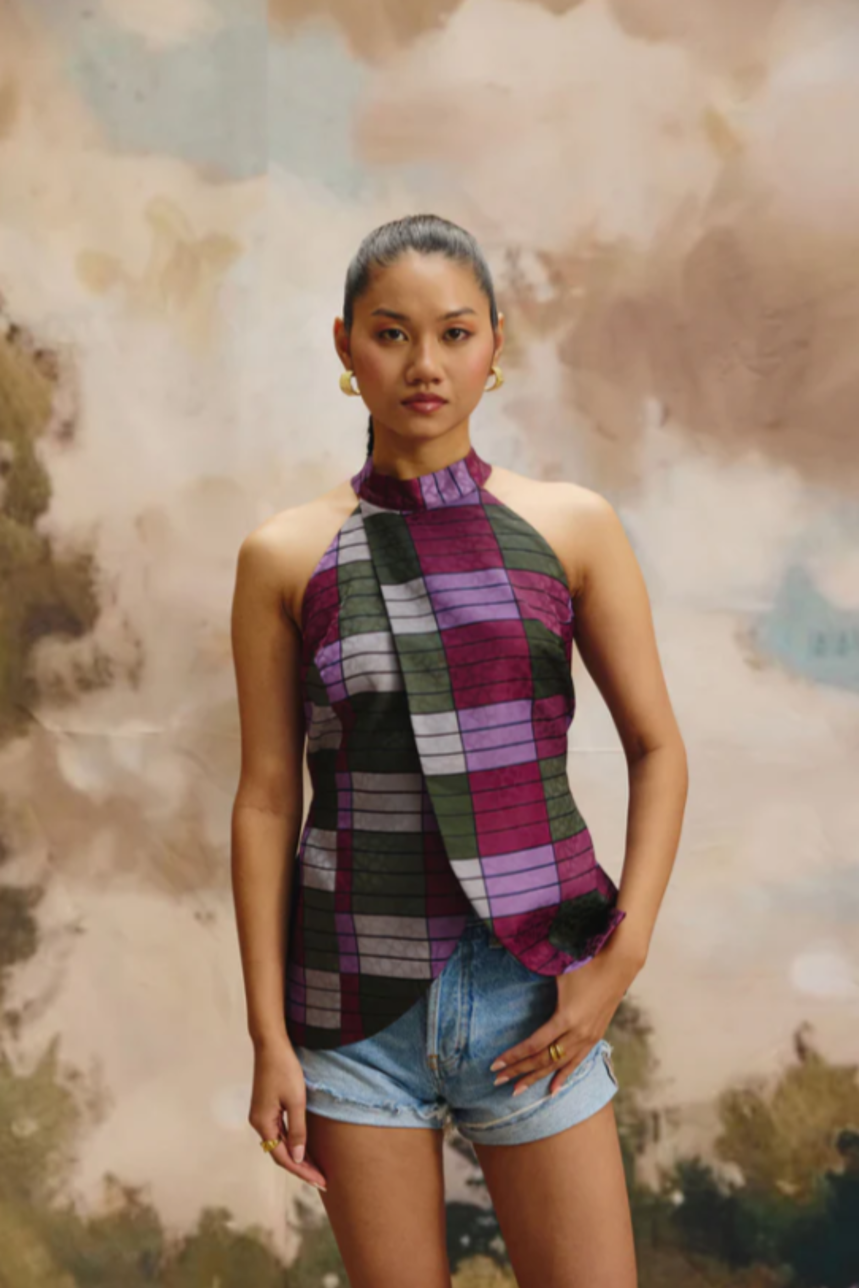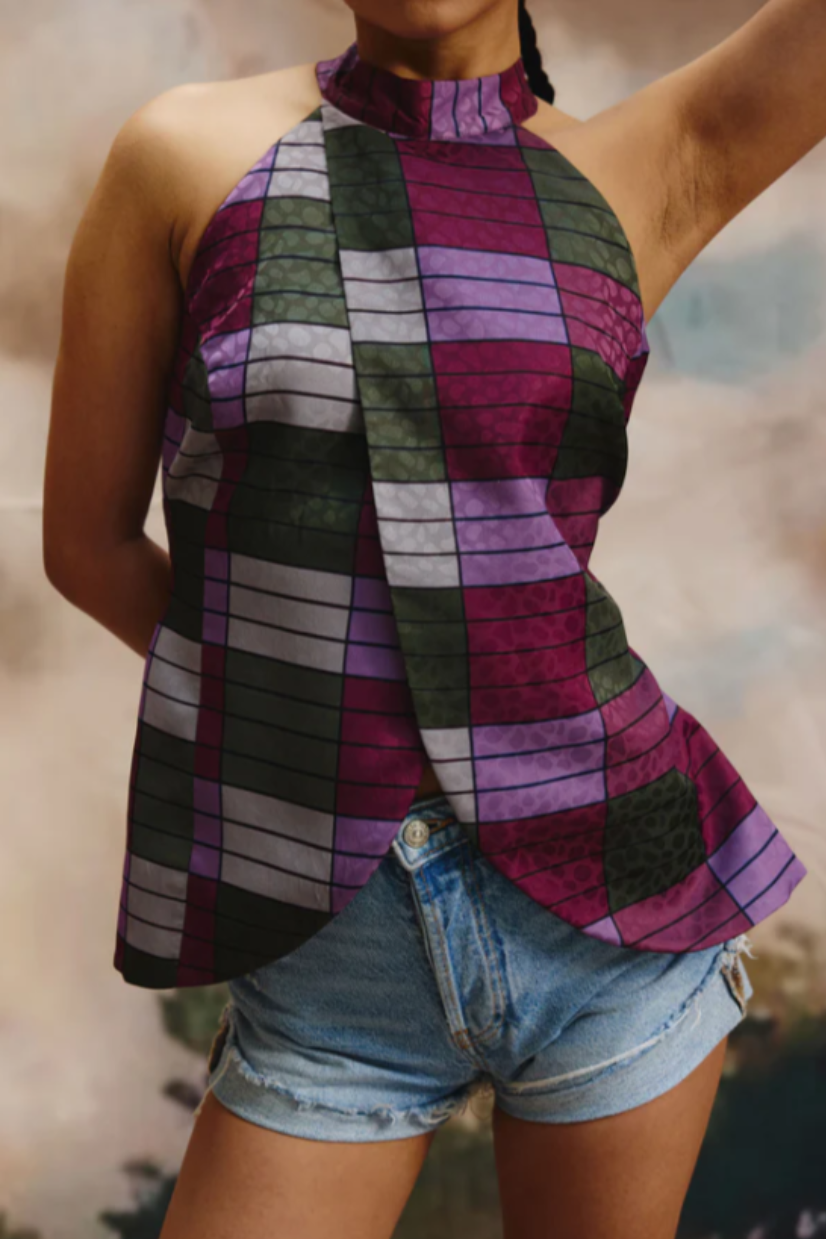The sleeveless halter neck top overlaps in the front and is paired with wide legged pants, both created with a self textured fabric with a luxurious sheen on it Product Code PTZIP111