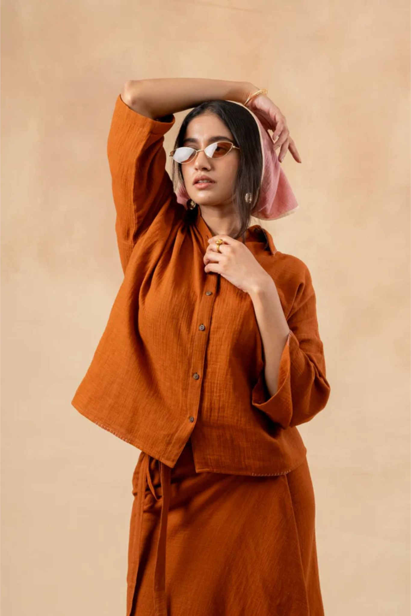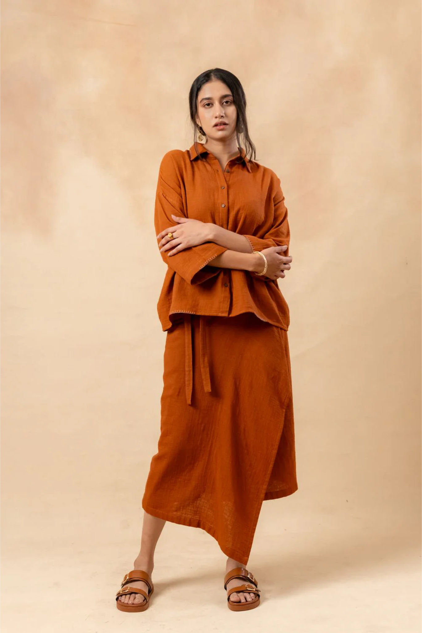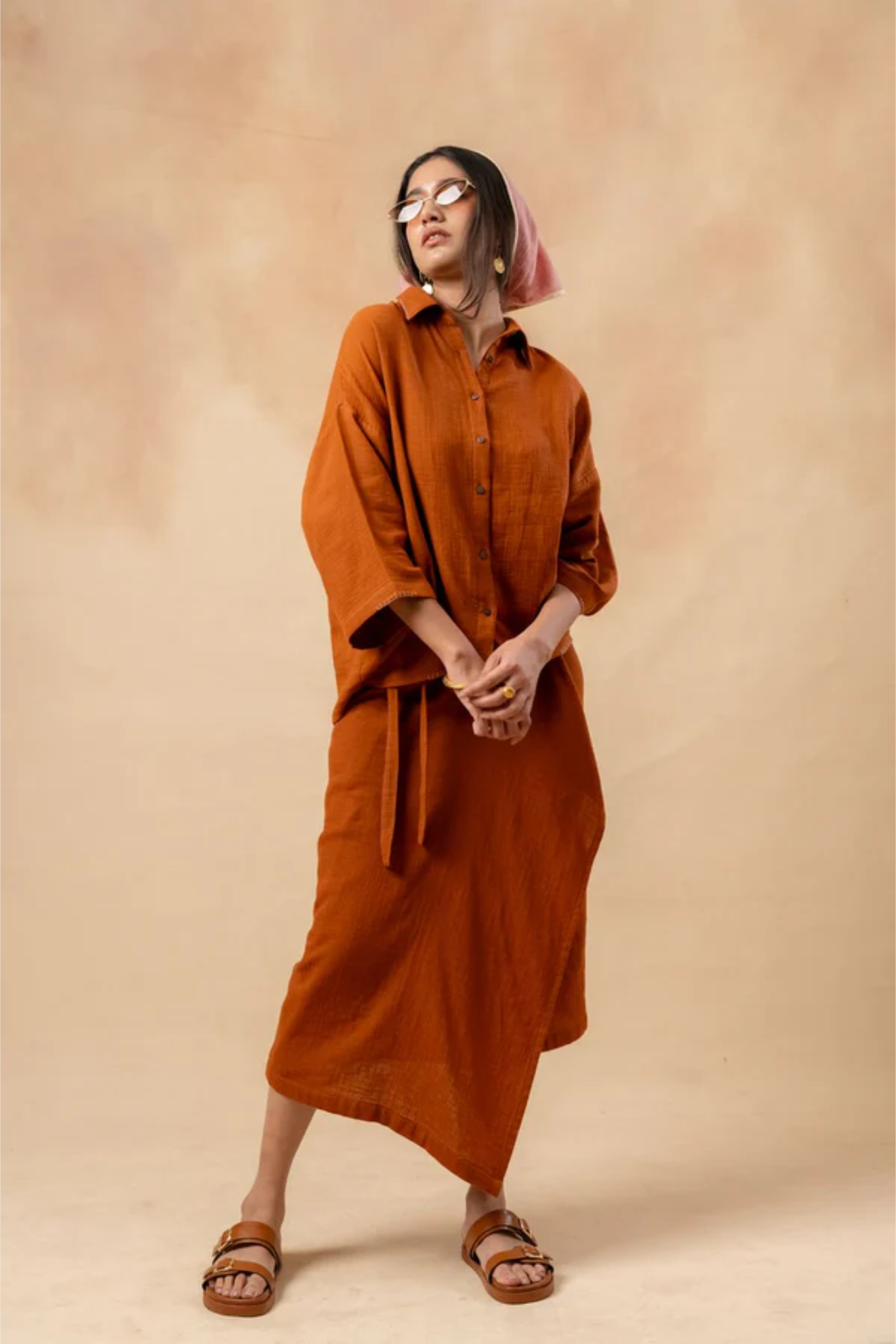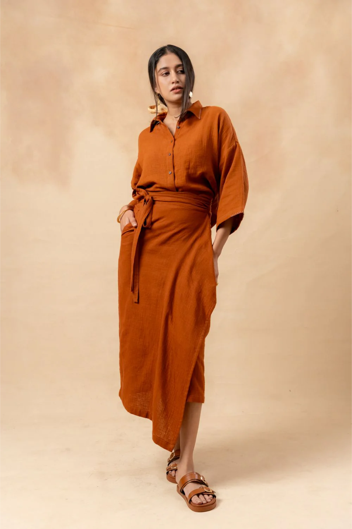 This set includes an oversized boxy shirt with details on the collar and sleeve, paired with an asymmetric, adjustable tie skirt featuring a side pocket. Together, they offer a chic and versatile look for any occasion.