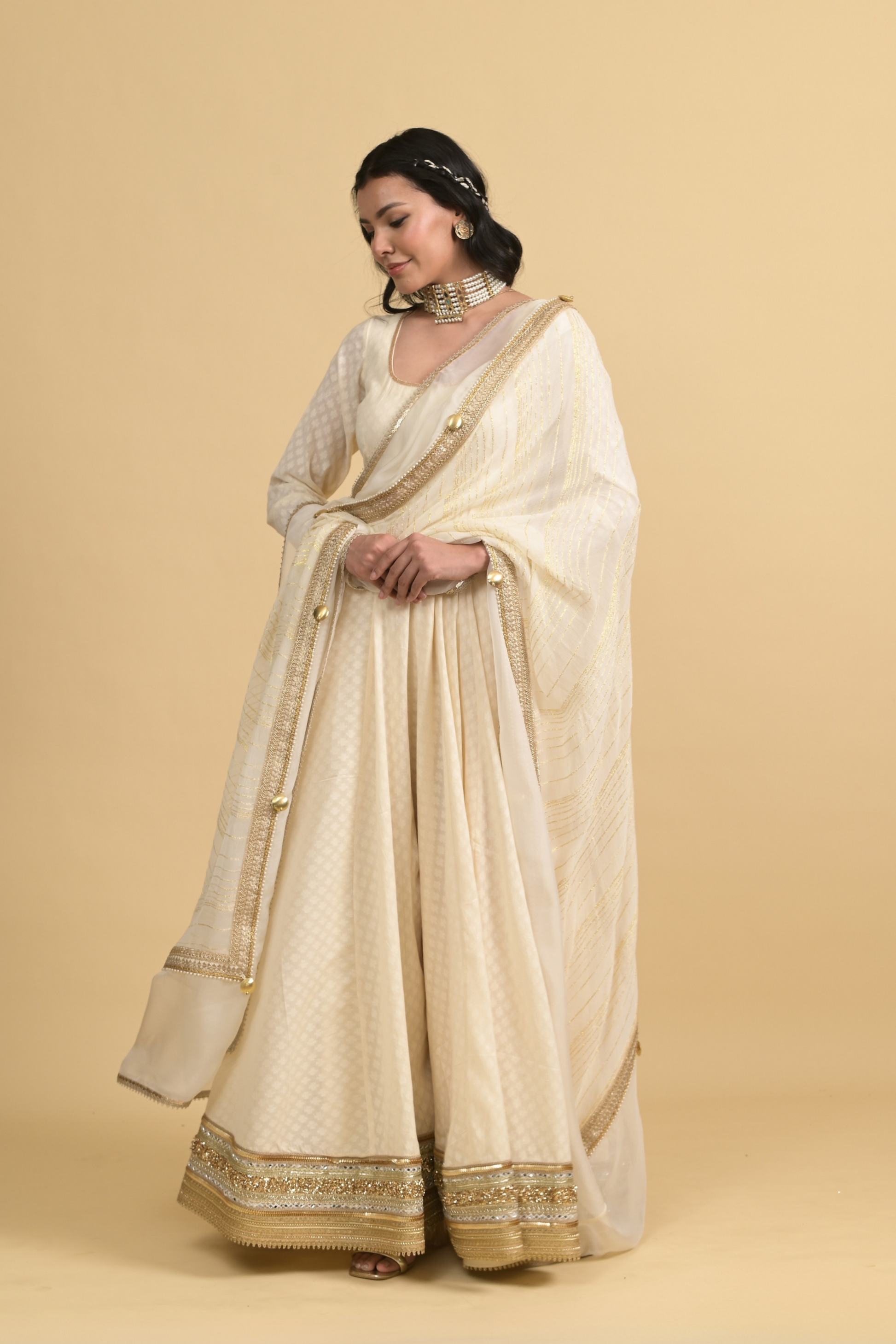 Fabric: Egyptian Cotton & Georgette Main Color: Ivory Design Elements: Intricate trim detailing, a corded border, and metal buttons Includes: Anarkali & Dupatta