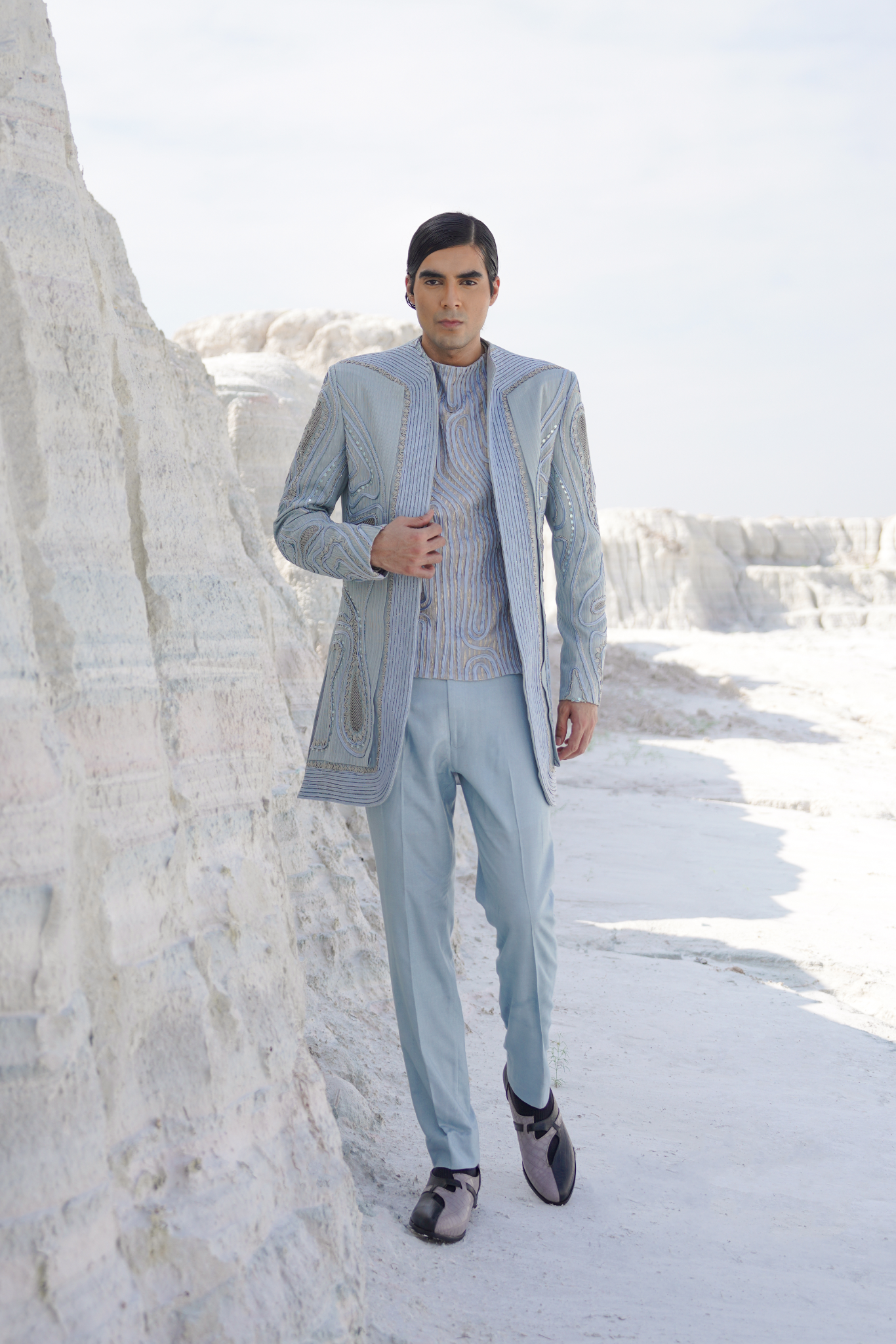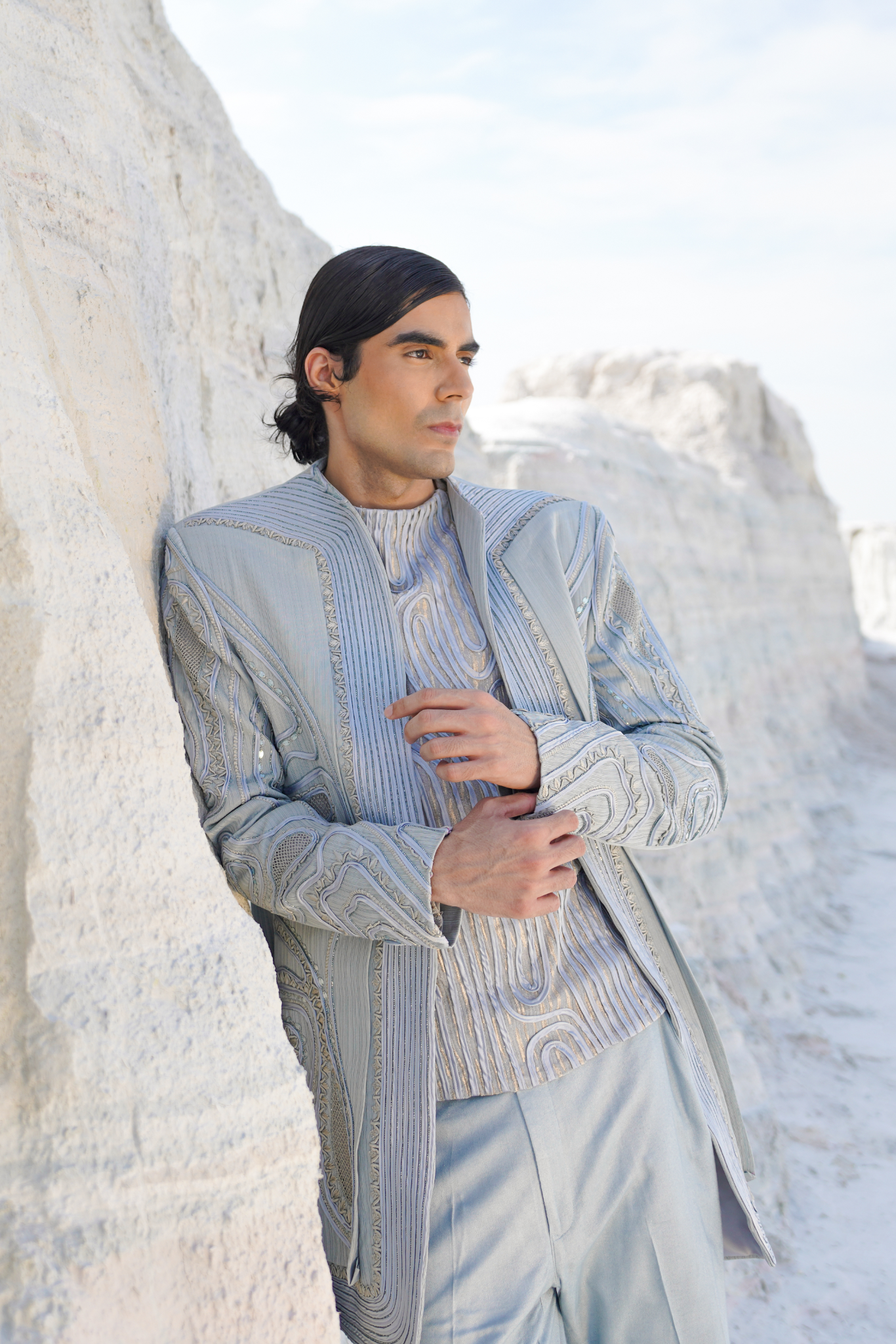 Featuring a Korean lurex satin indo with our signature in house manufactured fabric shirt styled with ethnowave and crape pants.