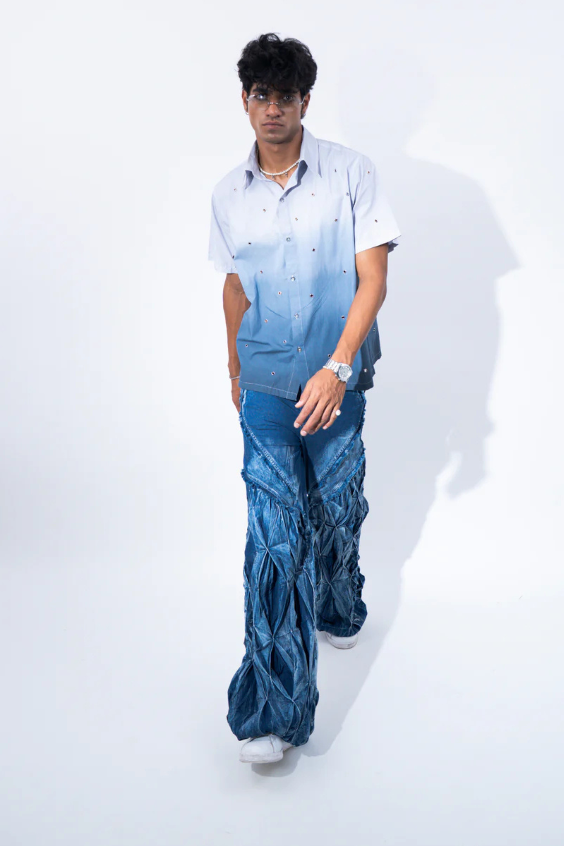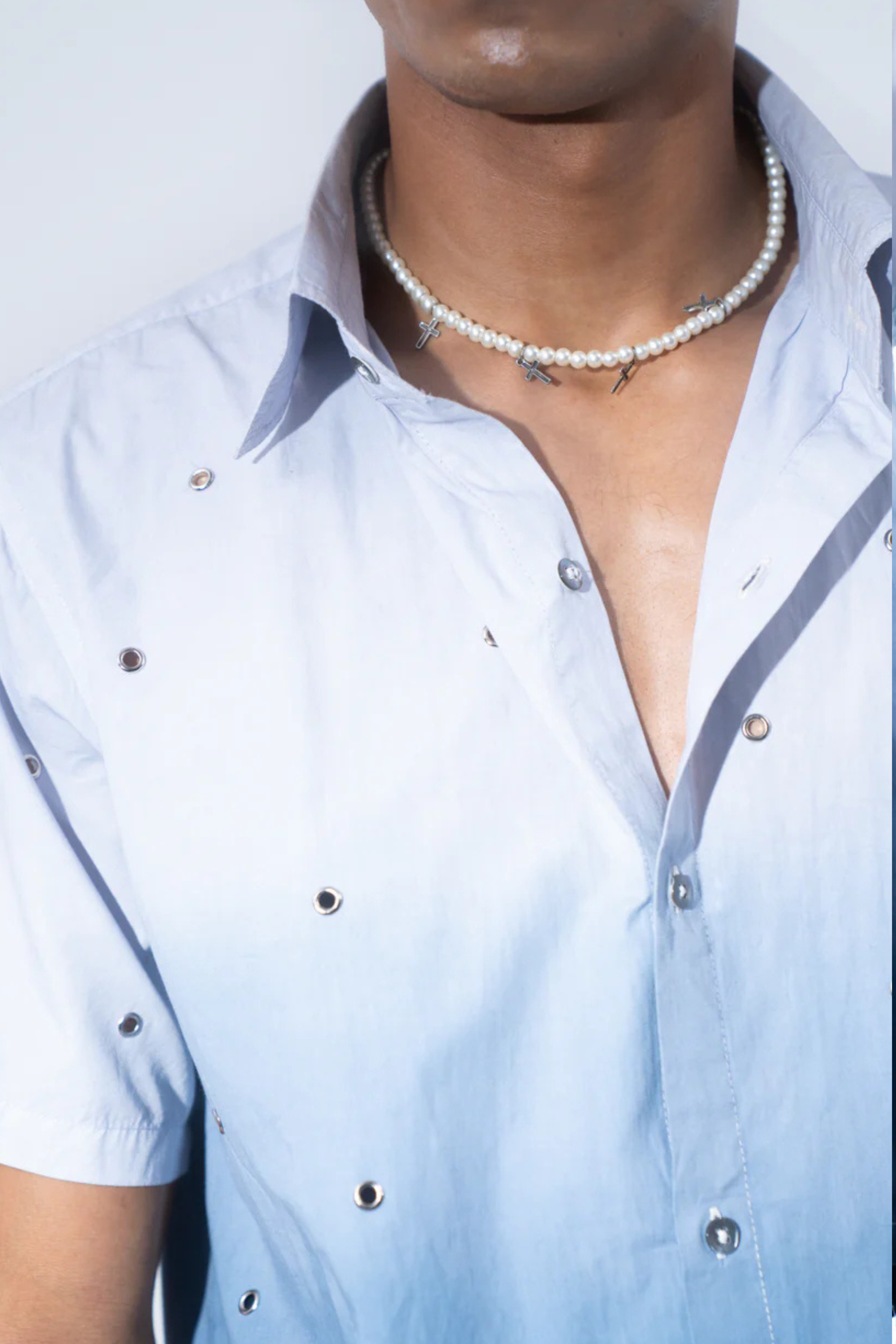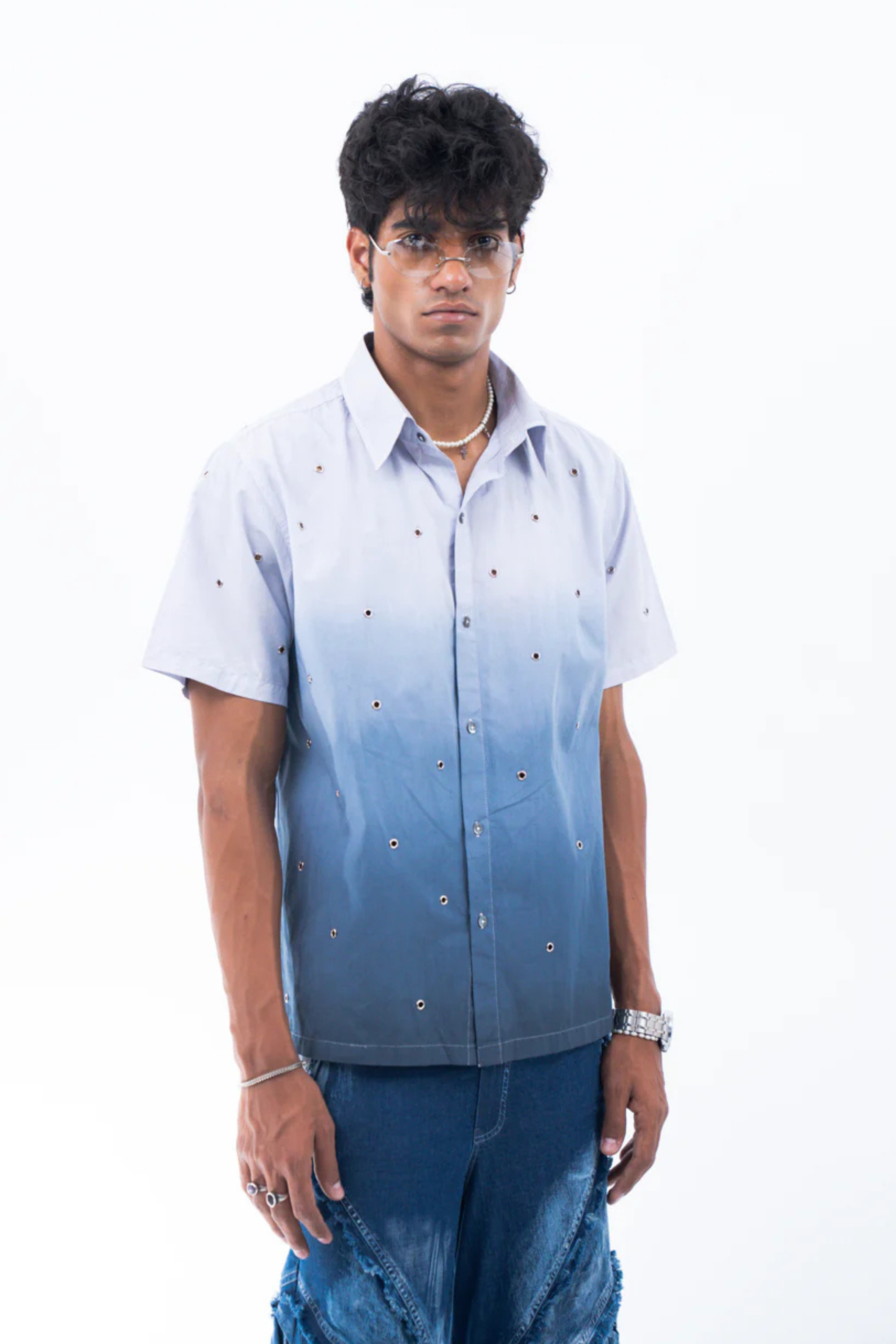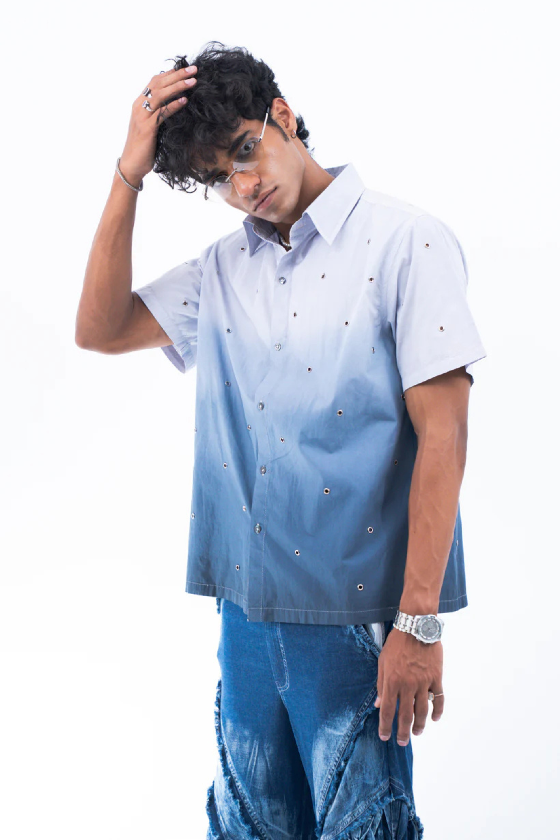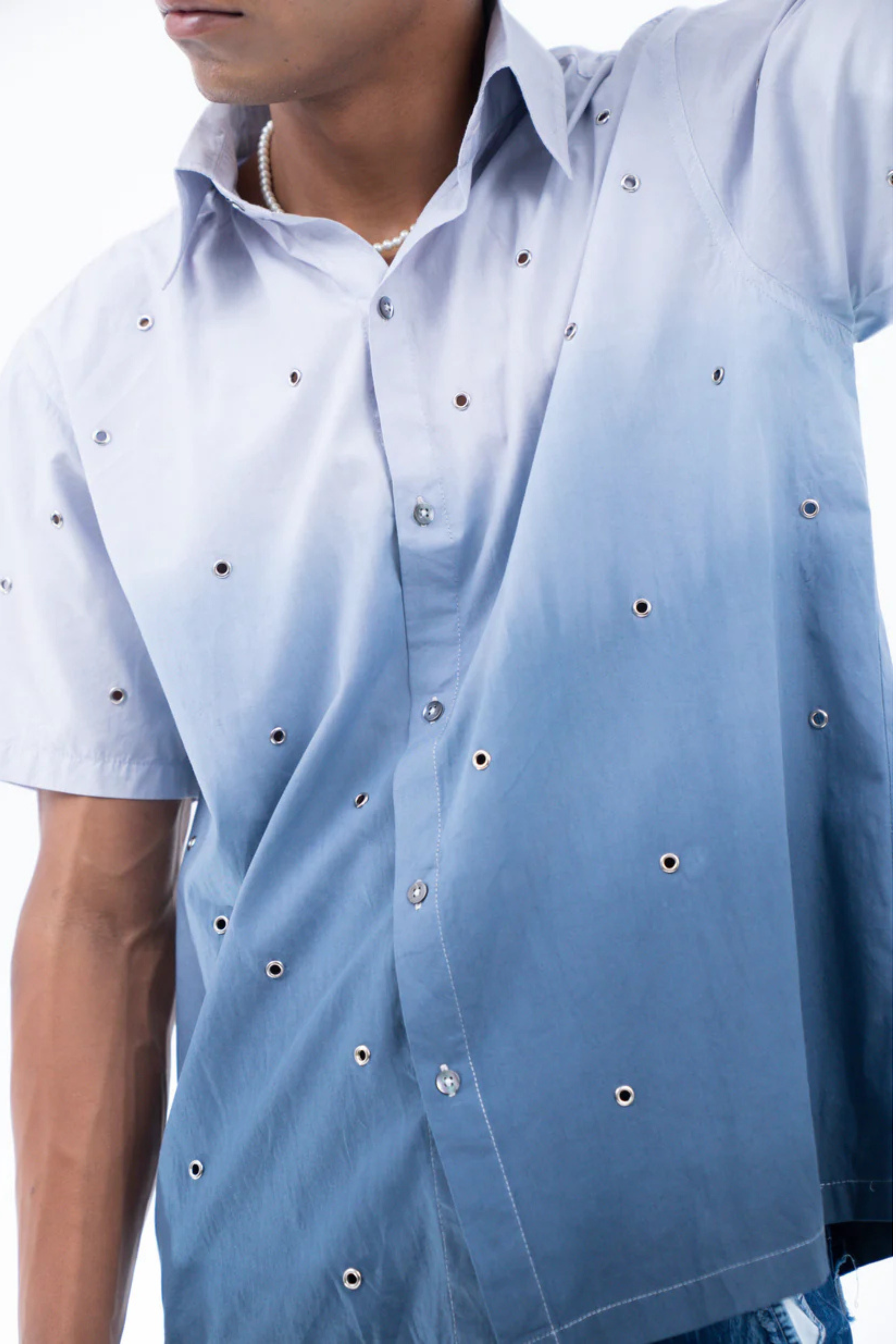 Made in a light and breathable cotton poplin fabric, this half-sleeve shirt features a carefully crafted creeping ombre in shades of blue emerging from the hem and fading along the way. All over eyelet details in silver colour symbolise add to the design while making the shirt airy and breezy. With black mother of pearl buttons as closure, this shirt is perfect for your summer endeavours. Product Code