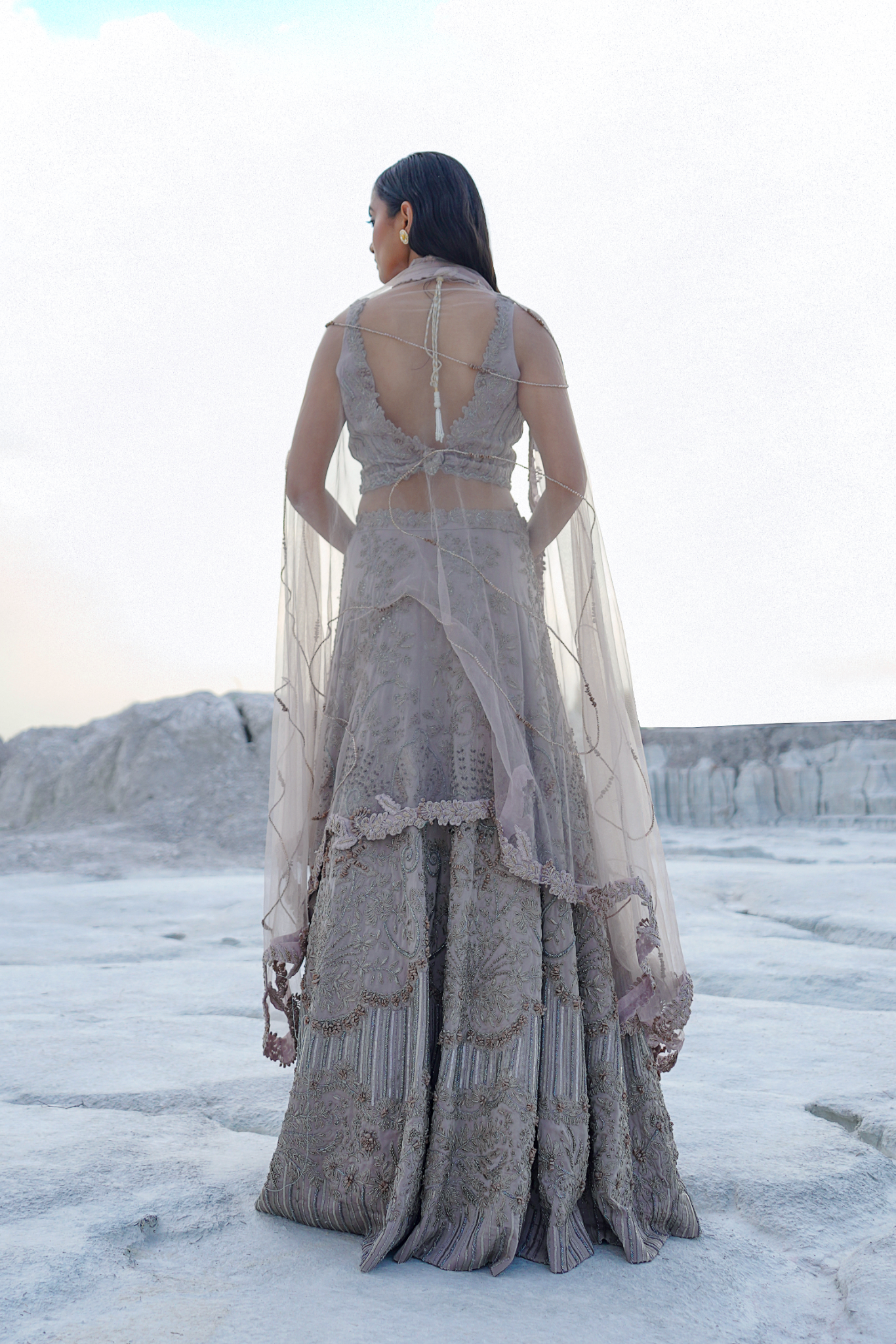 Featuring a piana satin lehenga with our signature hand embroidery, embellished with tassels.