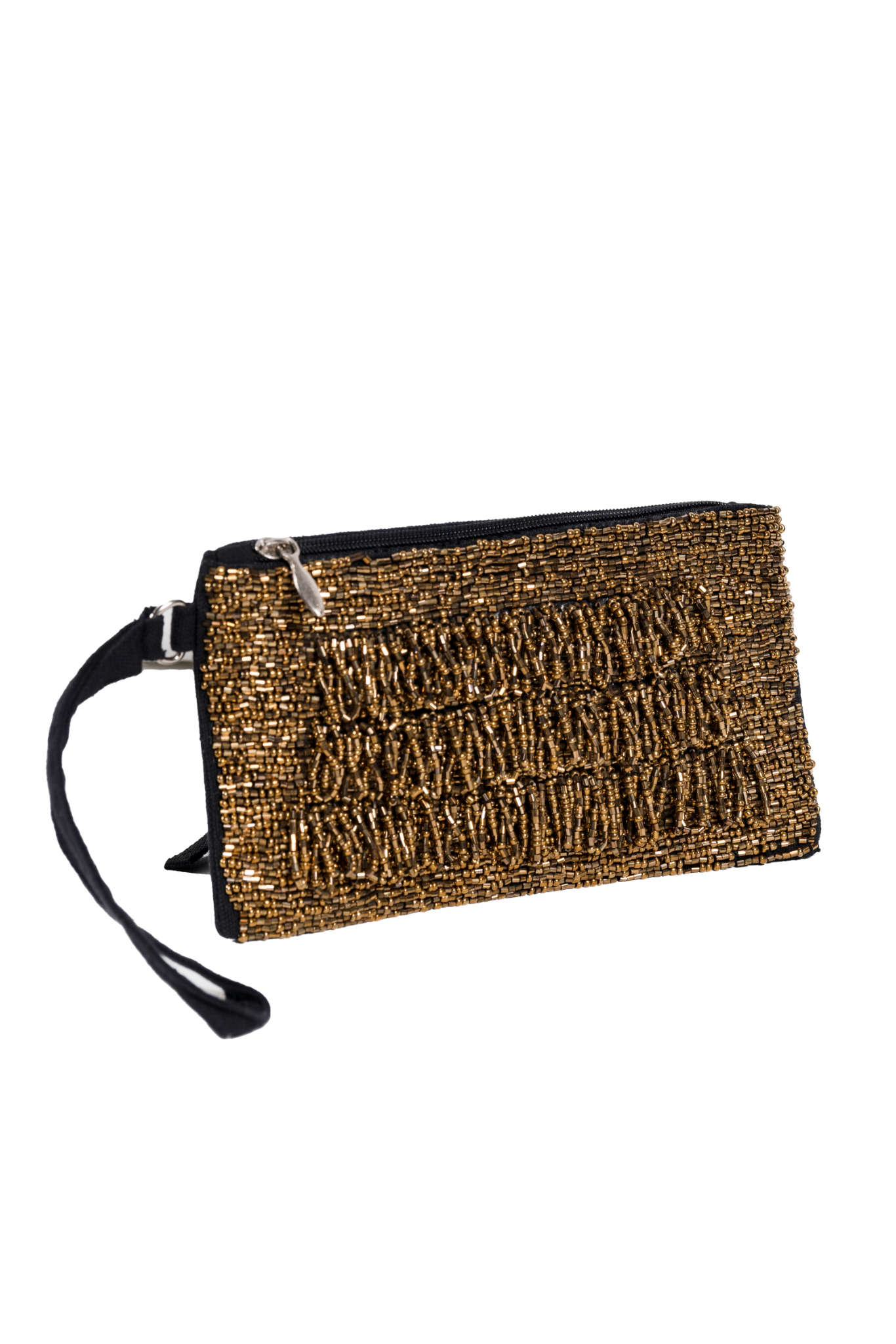 This sleek coin pouch sparkles with the brilliance of sunset-caught gold, featuring intricate beadwork by master craftsmen from Bareilly. The compact design conceals surprising functionality, while the detachable wrist strap offers versatile carrying options. Each tiny bead is carefully placed to create a textured surface that catches light from every angle.