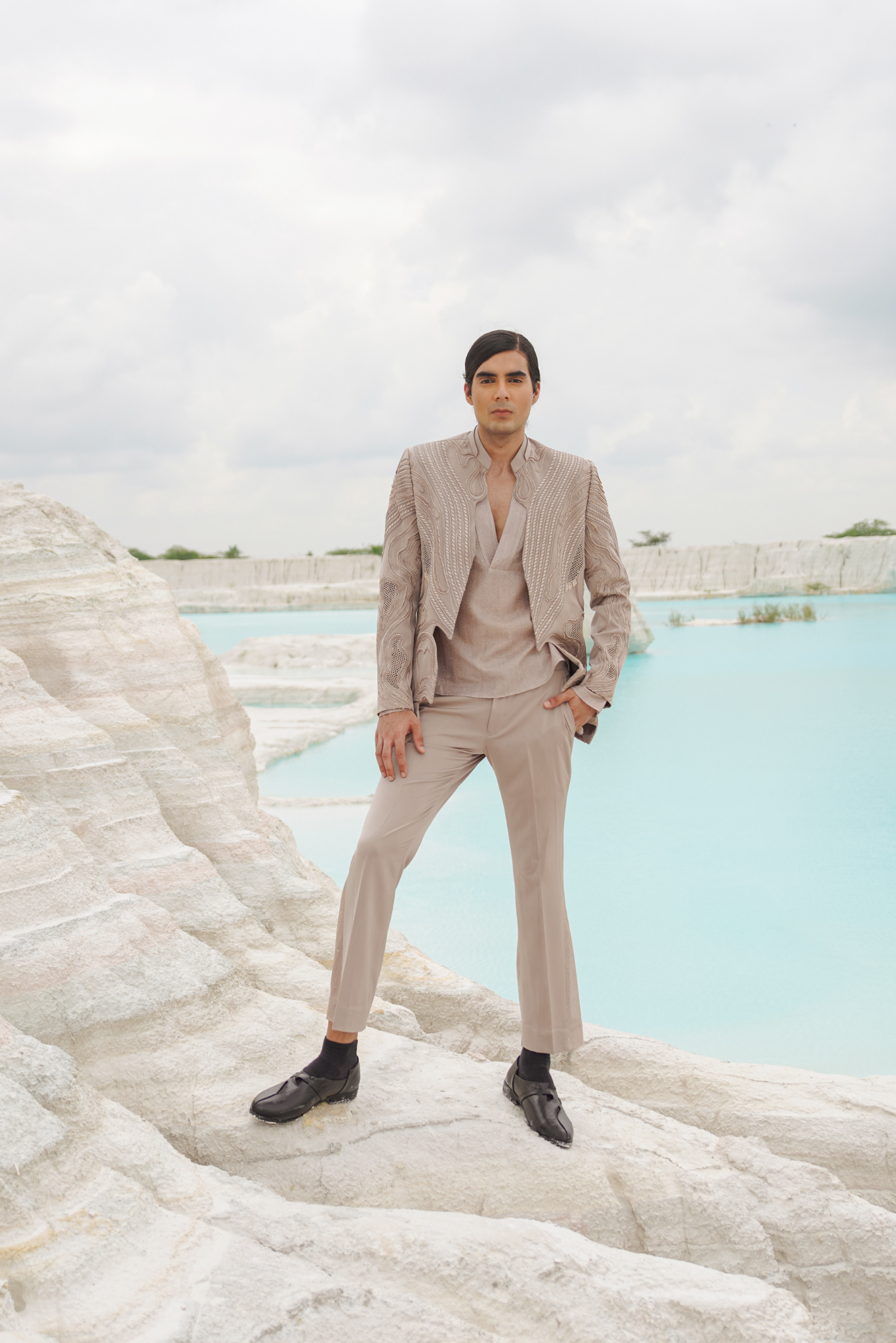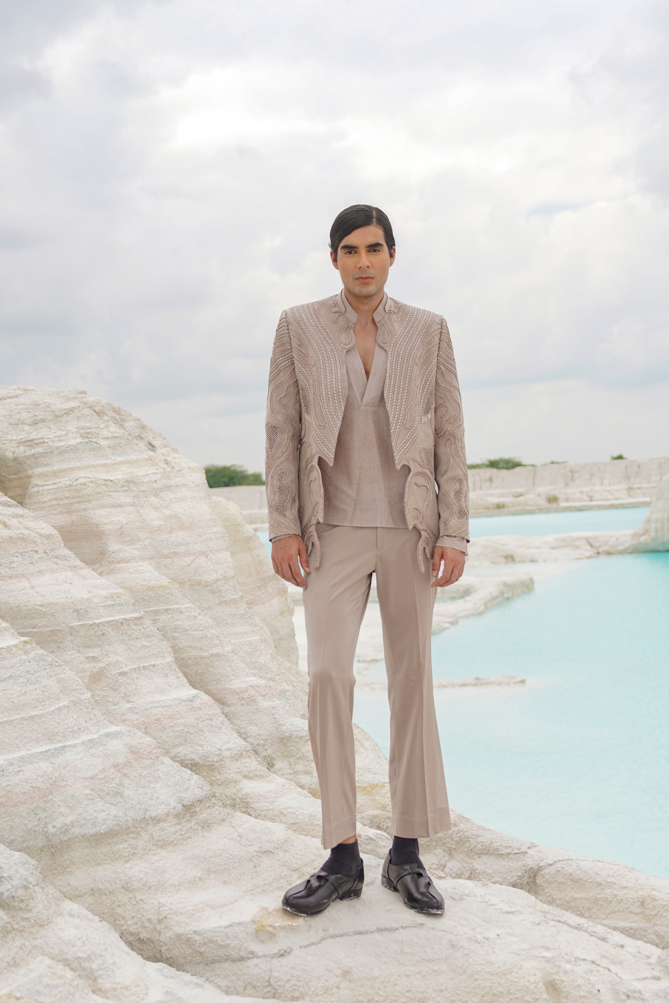 Scallop ethnoave blazer embellished with our new in-house embroideries with our signature in house fabric shirt with crape pants with gazette.