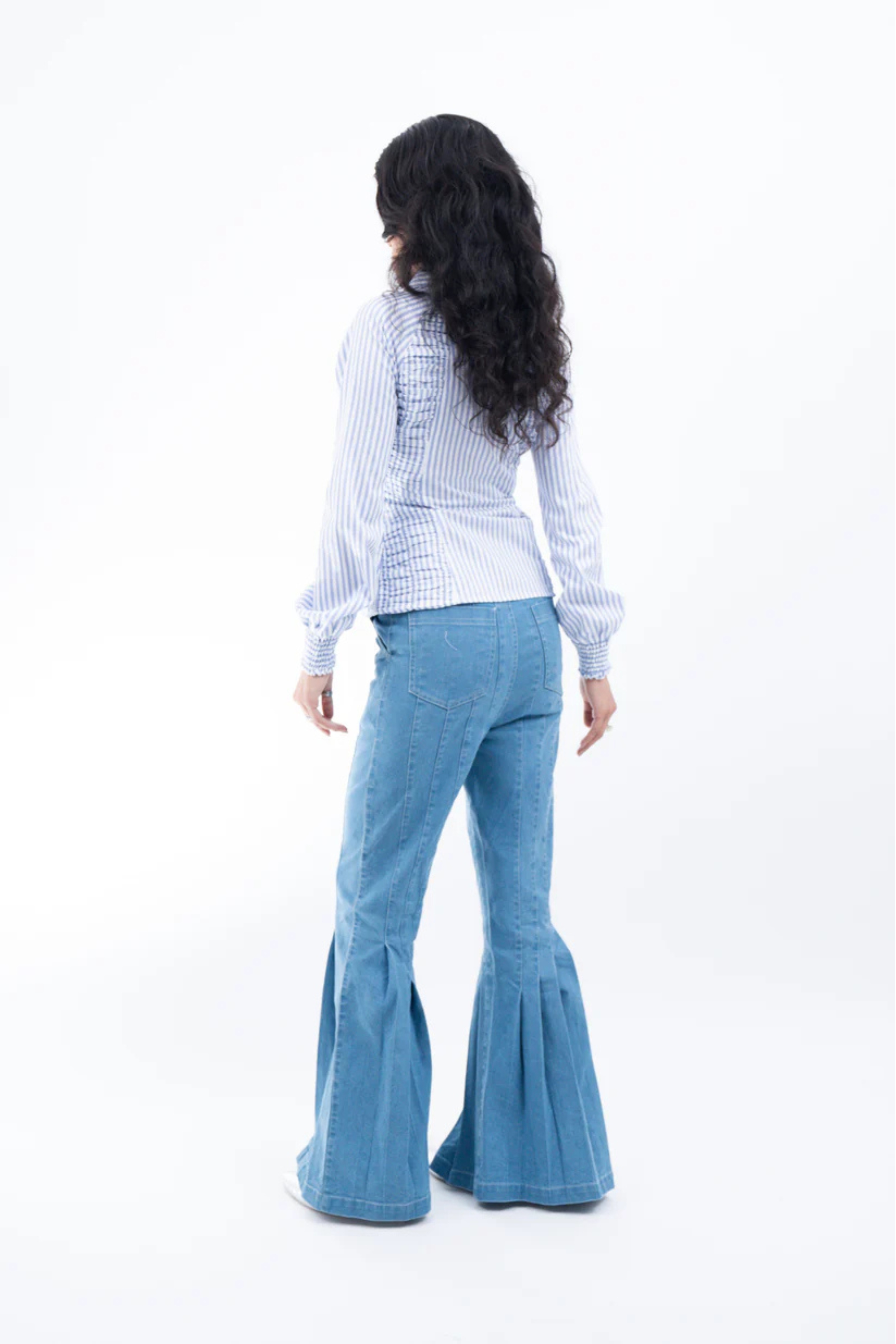 Product Type/Category Shirt Product Description This striped shirt is a summer essential. Made with a breathable cotton striped fabric in a satin finish, this shirt features panelling with gathered details, classic collar and raglan puffed sleeve with a smocked cuff. It has a fitted silhouette that sits just right on the body enhancing the shape of wearer. It is finished with a metallic zipper at the front. Product Code PTTHN033 Product Details