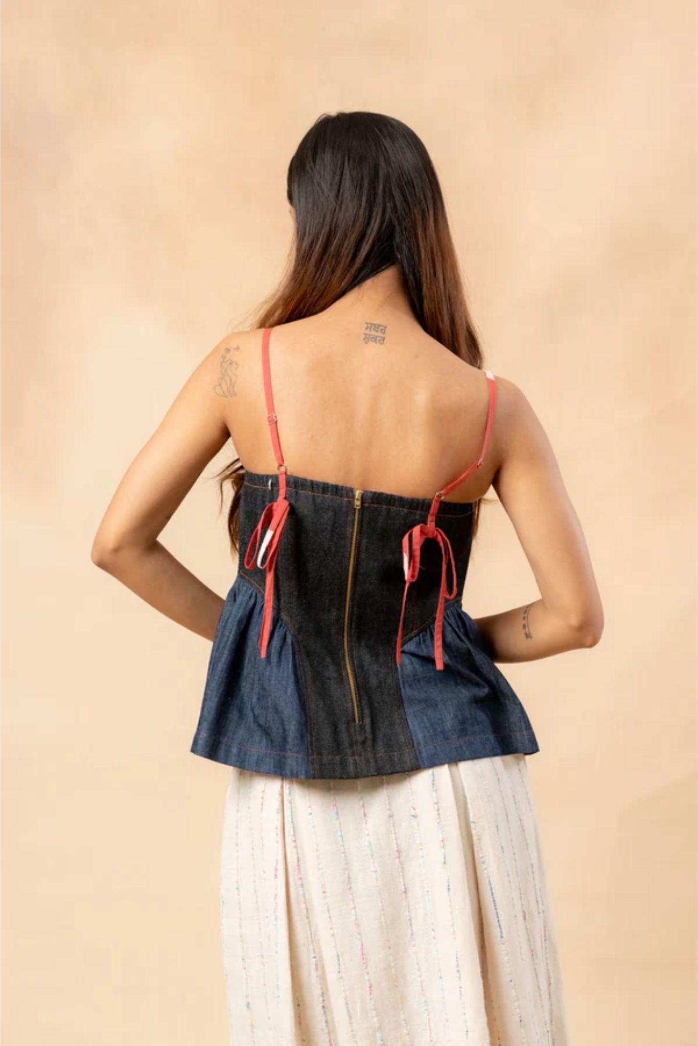 Fitted bow top with adjustable contrast straps and side peplum.