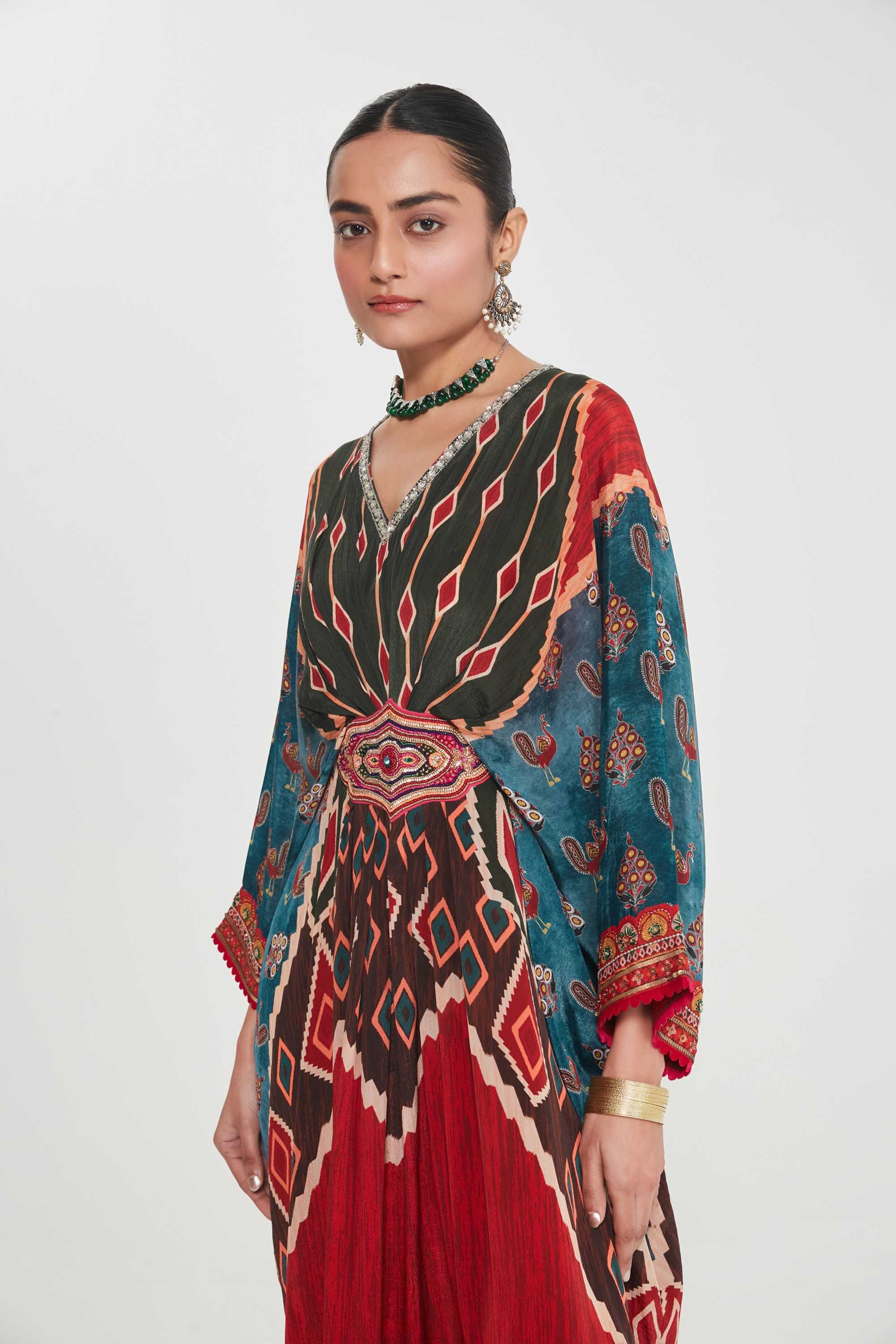 Description Ikat Printed, Hand Emblished Pleated Kaftan Featuring Trims And Tassels On Embroidered Belt Product Code