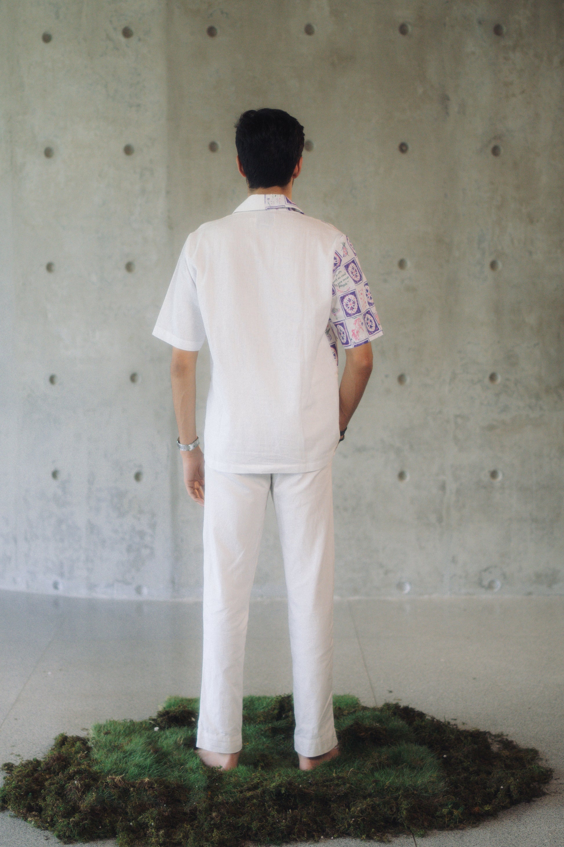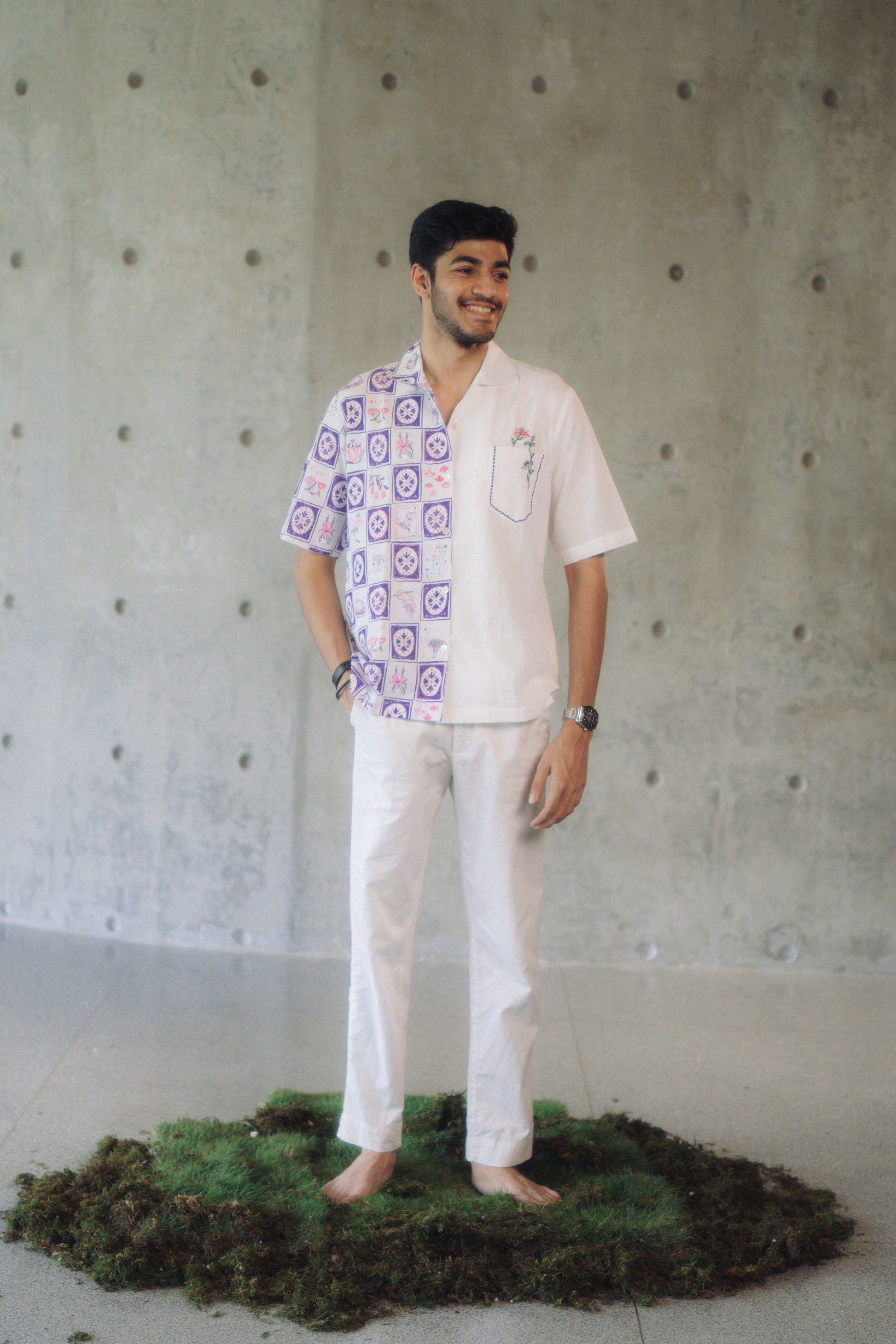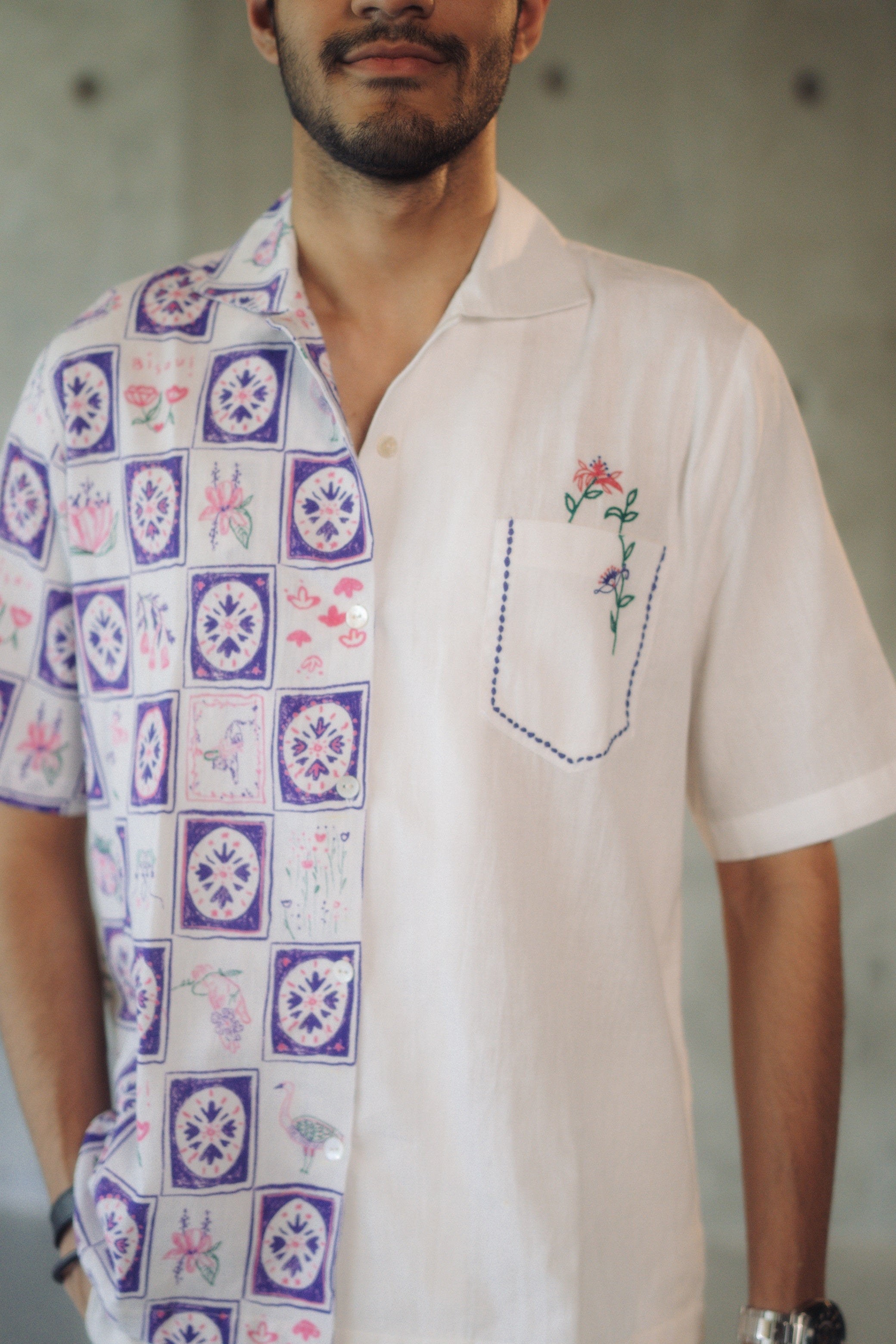 The Half-and-Half Print Men's Shirt features a striking design with one half adorned in a bold, vibrant print and the other half in crisp, solid white.