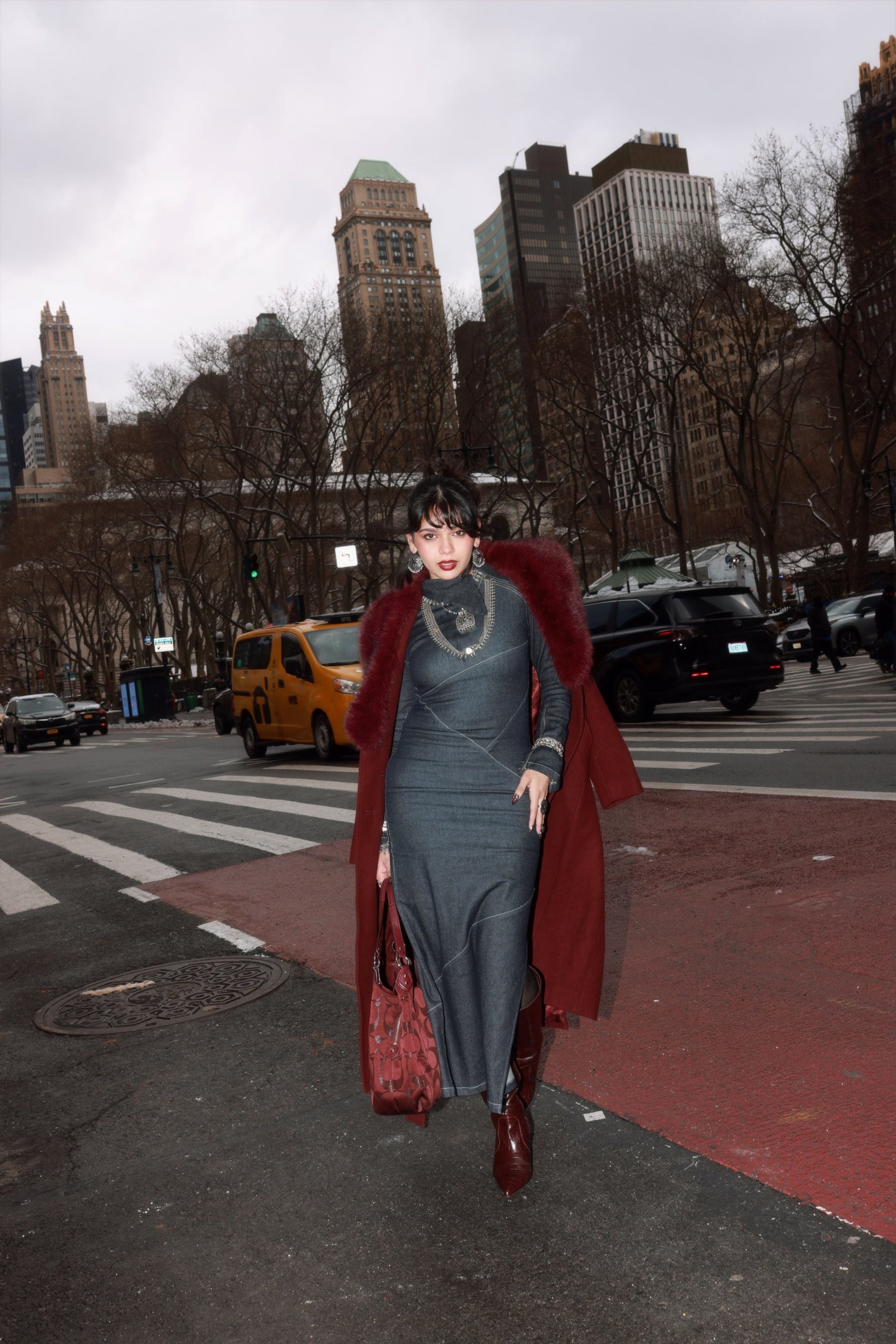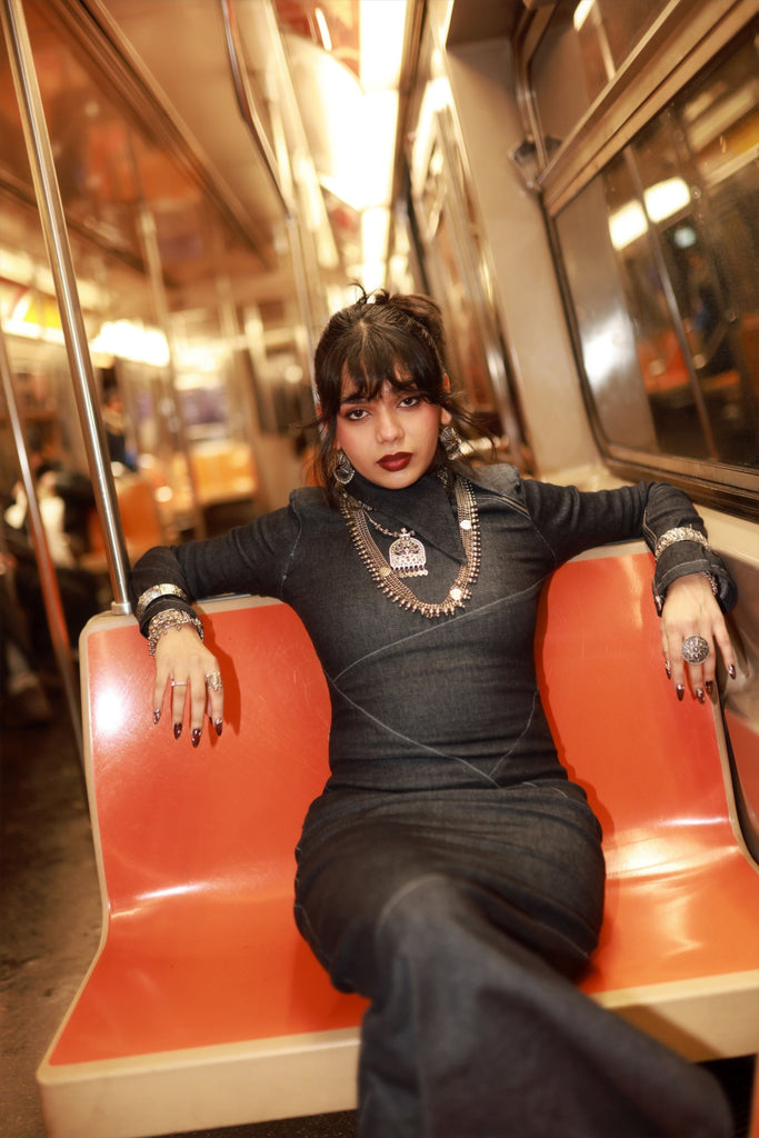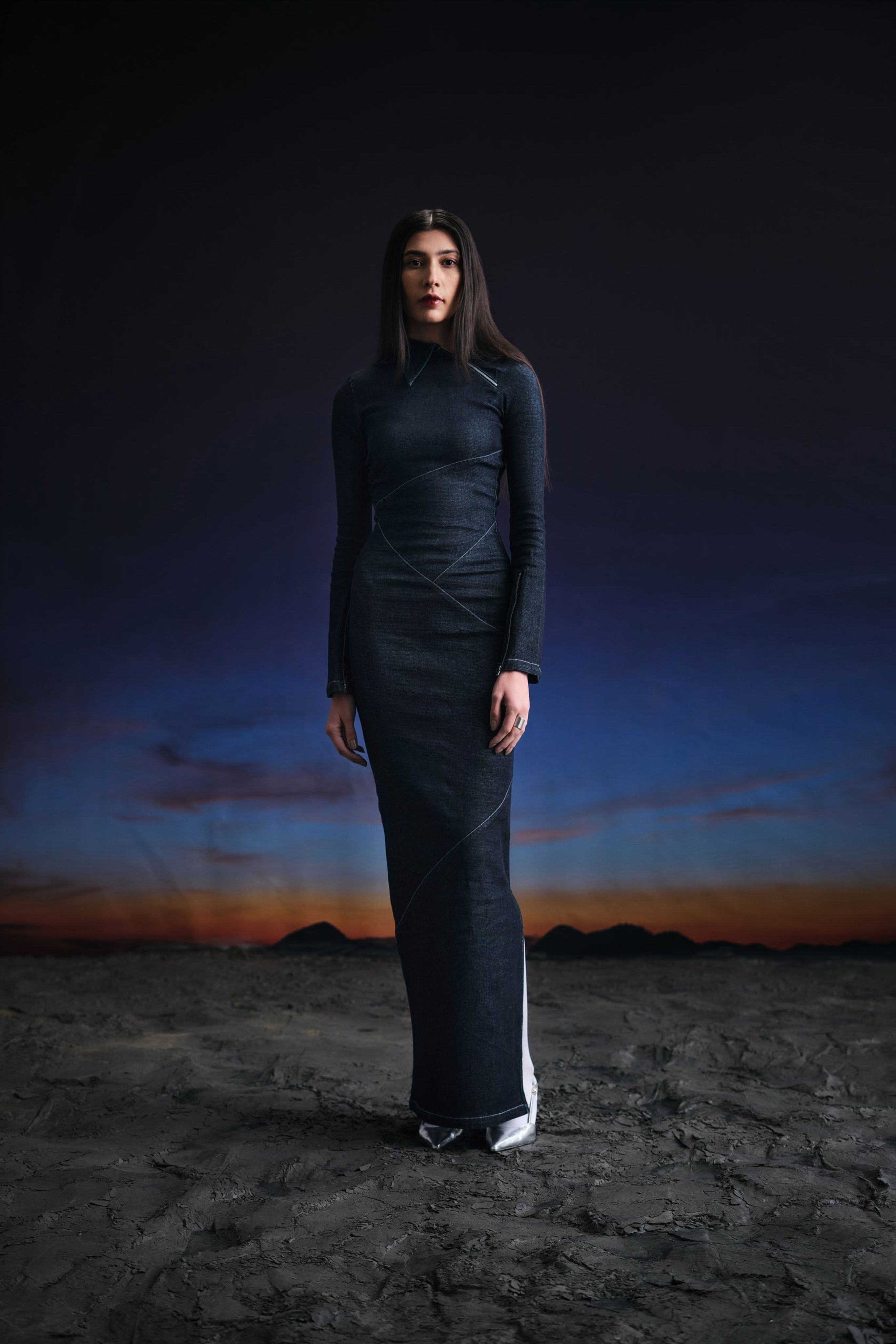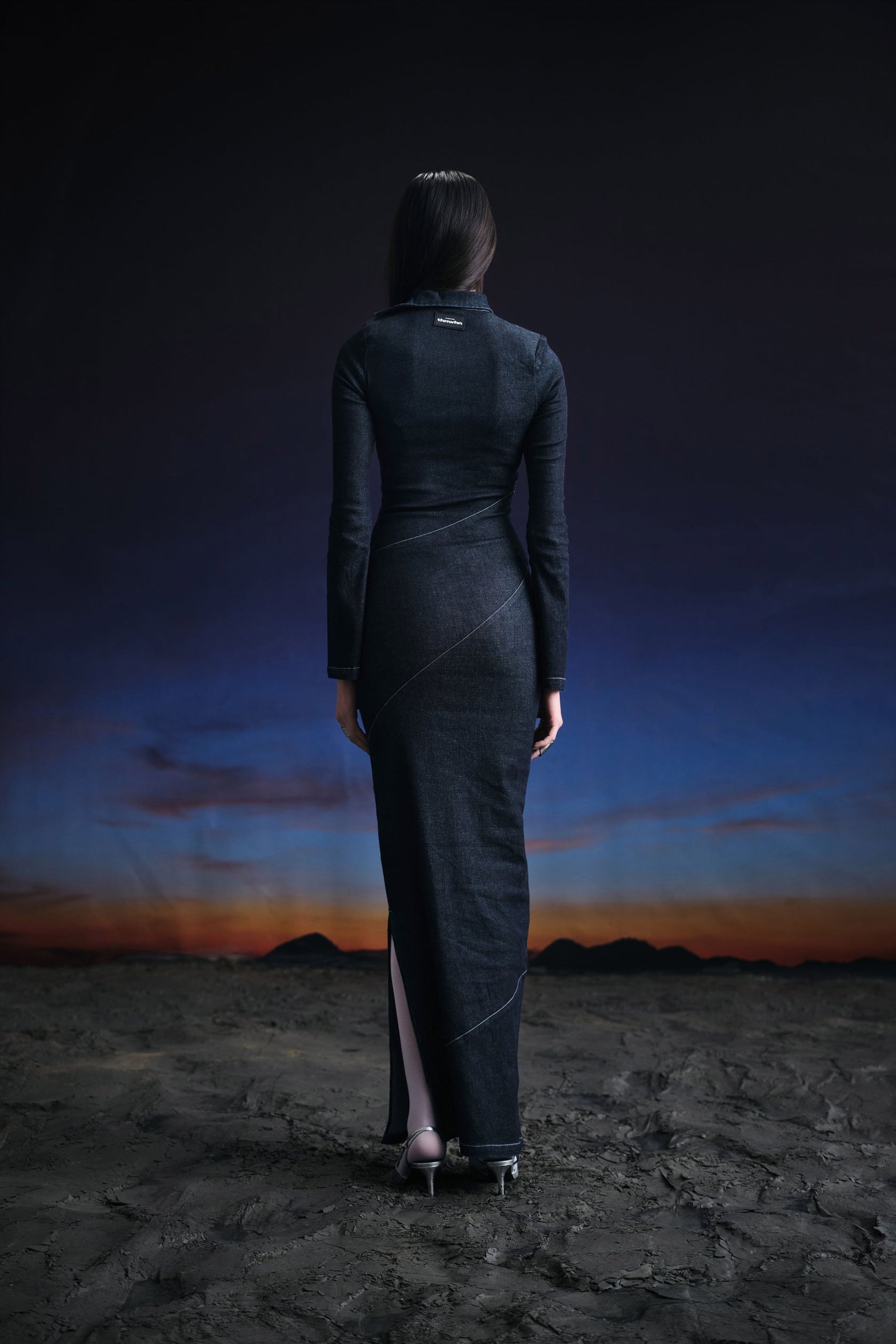 Precisely crafted floor length body con dress featuring assymetrical panels intelligently placed on the body, highlighting the natural curves. An edged asymmetric collar detail, along with padded shoulders for structure.A metallic zipper extending from the collar to the armhole ads to the charm of the dress. Fit and flare sleeves with zippers at end enhance the overall look.