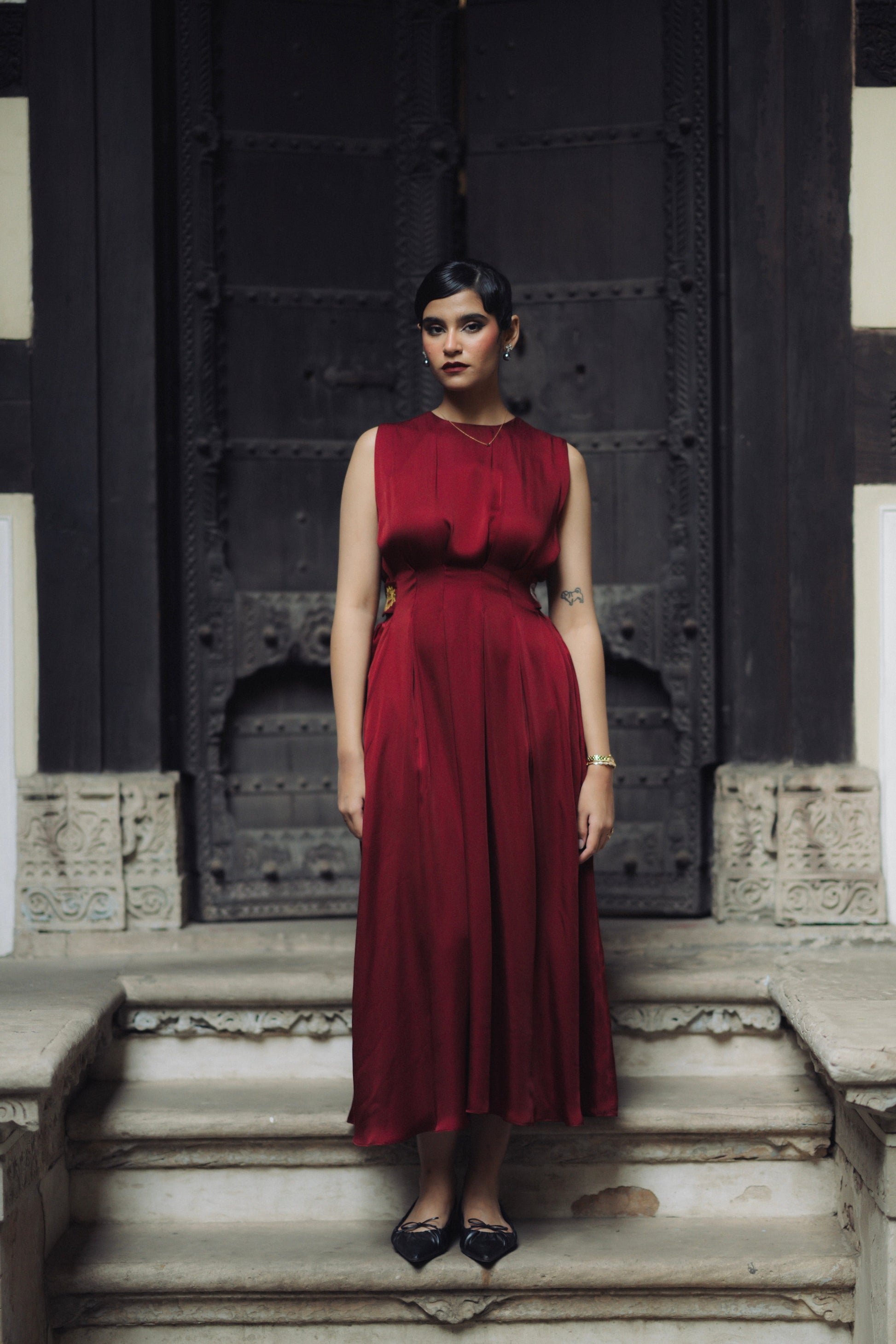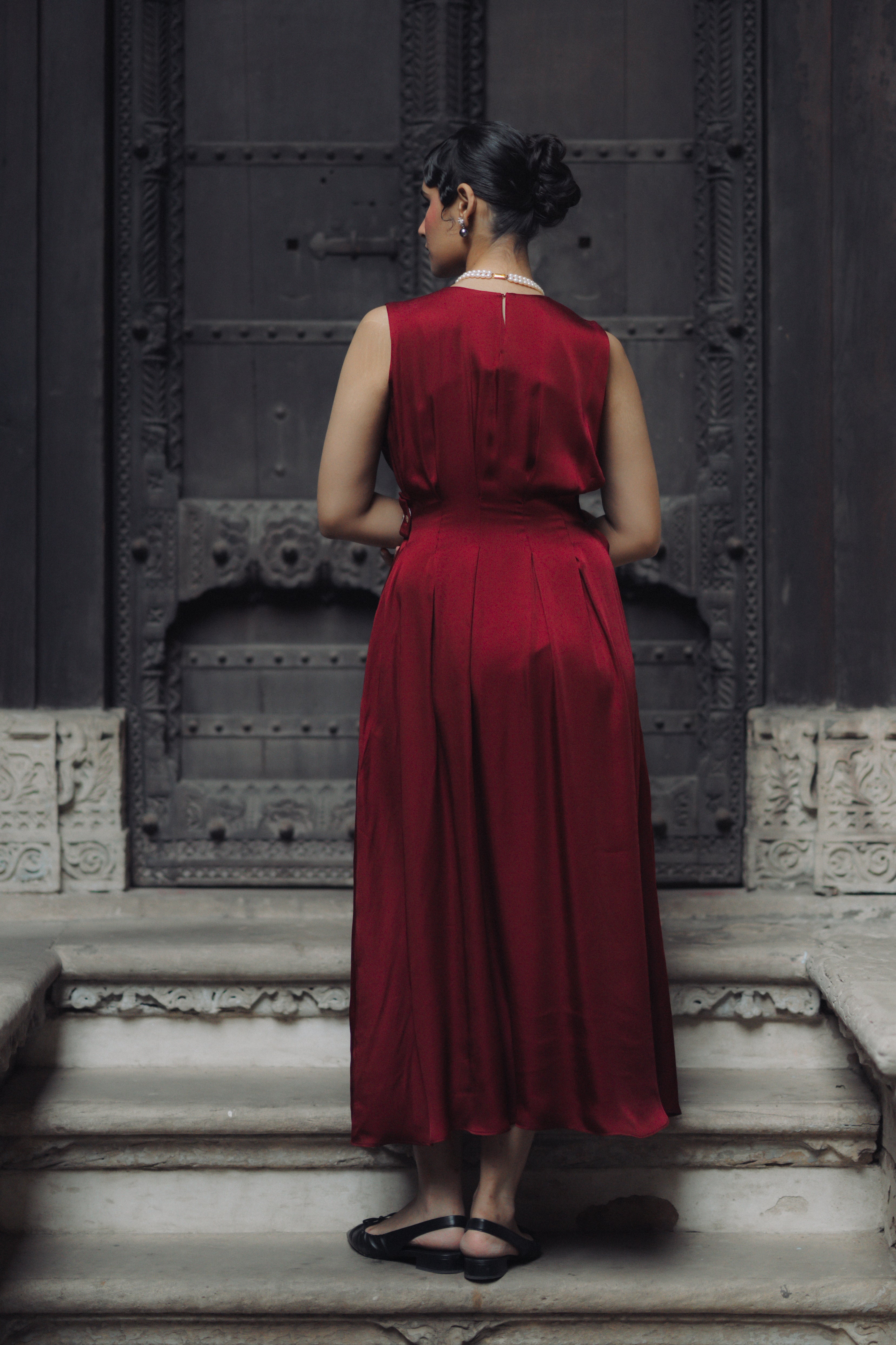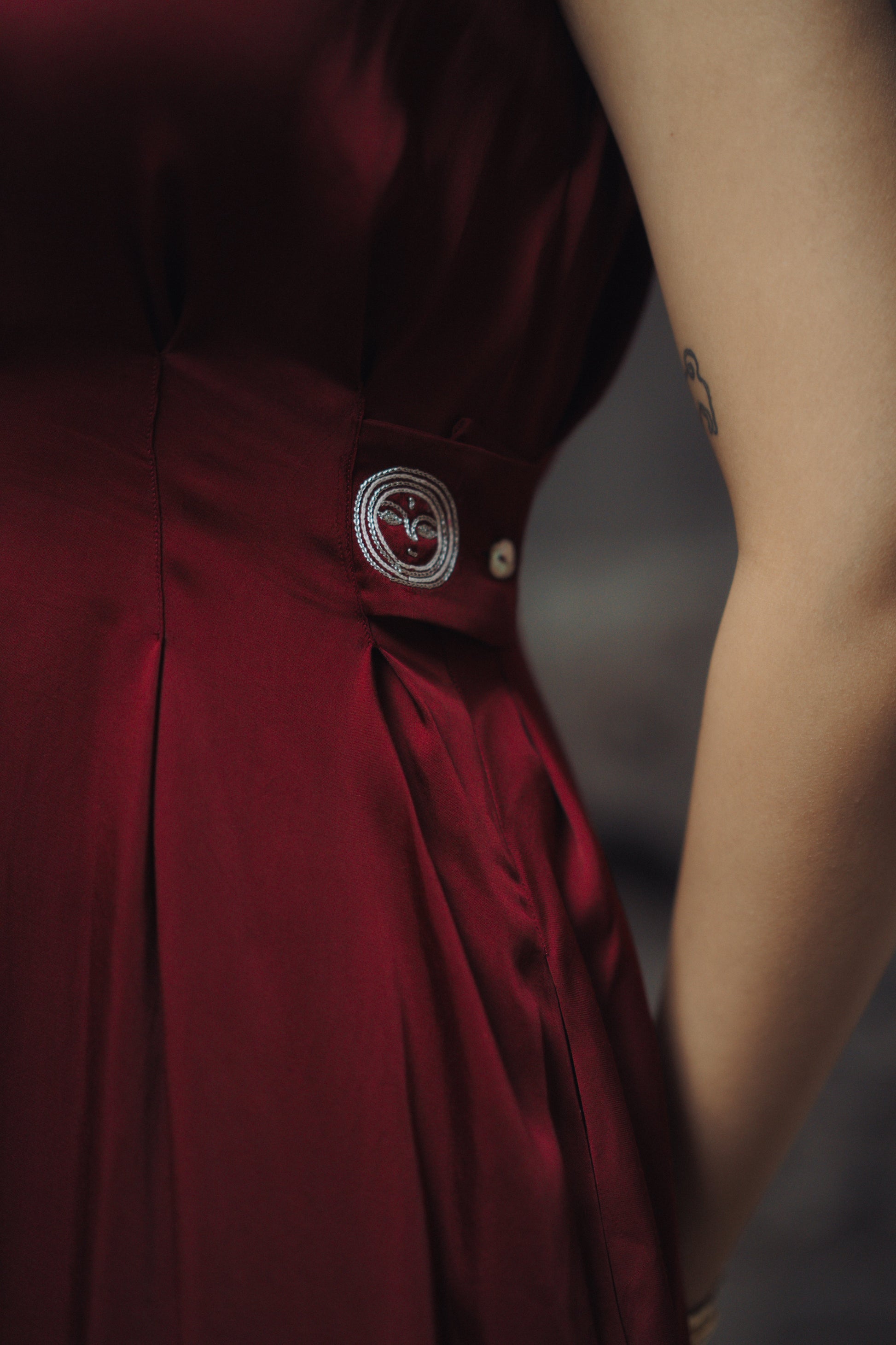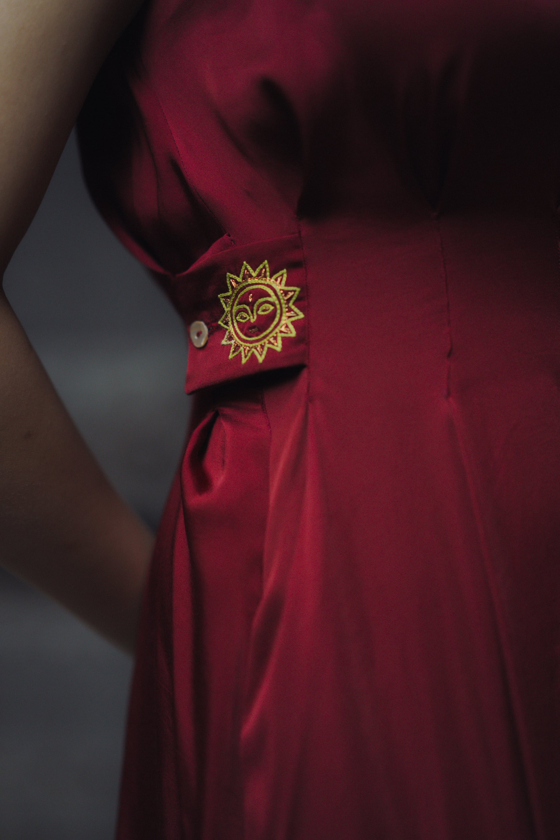 This striking maroon modal dress, crafted with graceful pleats, radiates an air of poise and sophistication. The side detailing showcases exquisite sun and moon embroidery in contrasting topstitch, adding a unique flair and refined charm. It's luxurious pleats gently contour the silhouette, making it an impeccable choice for formal and evening occasions.