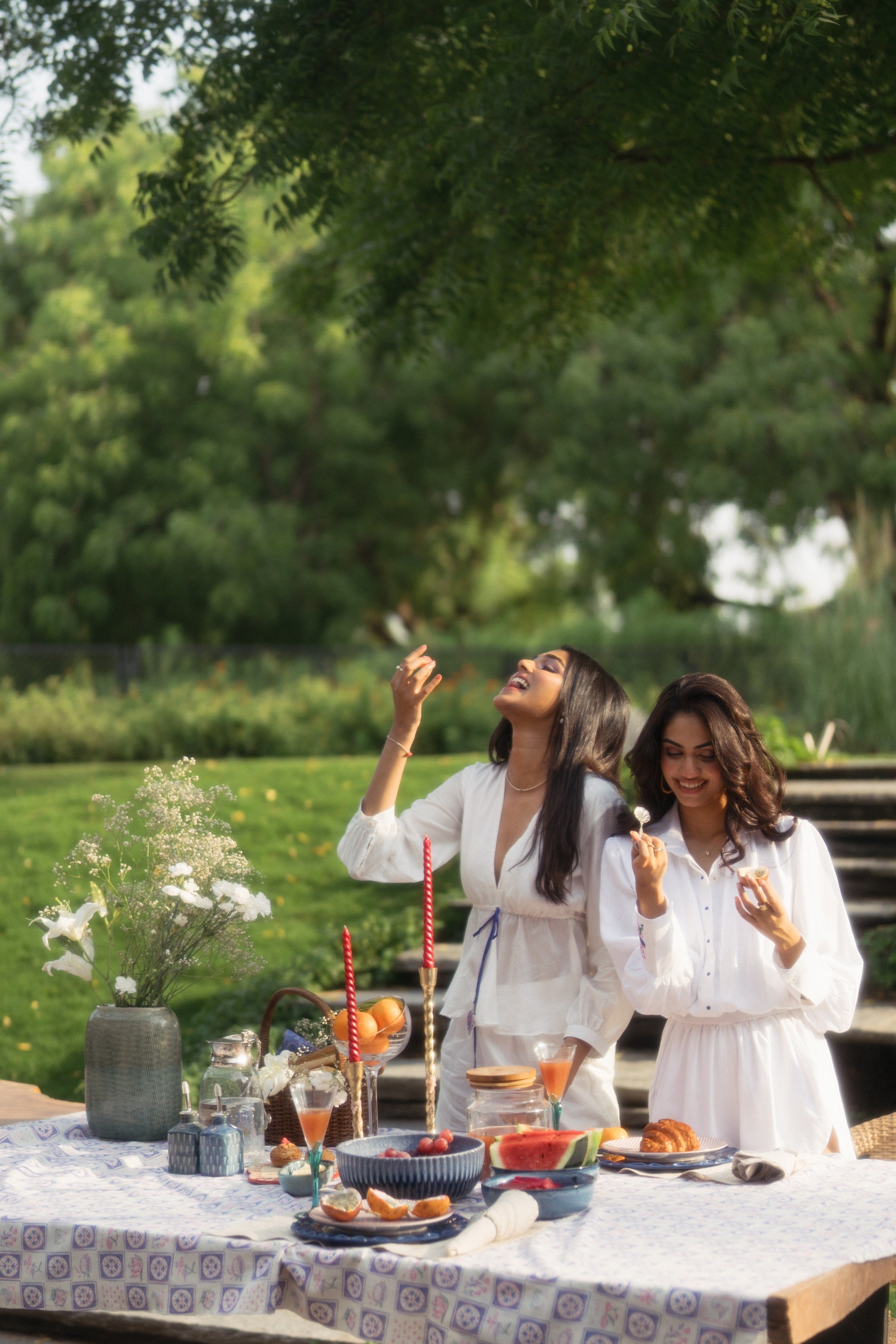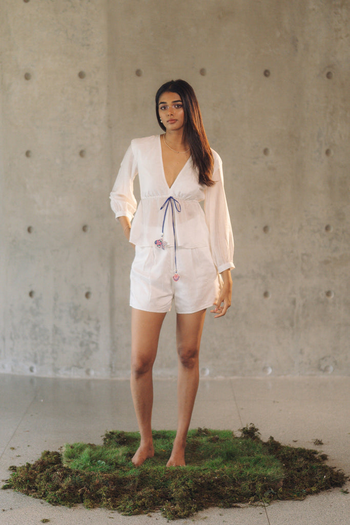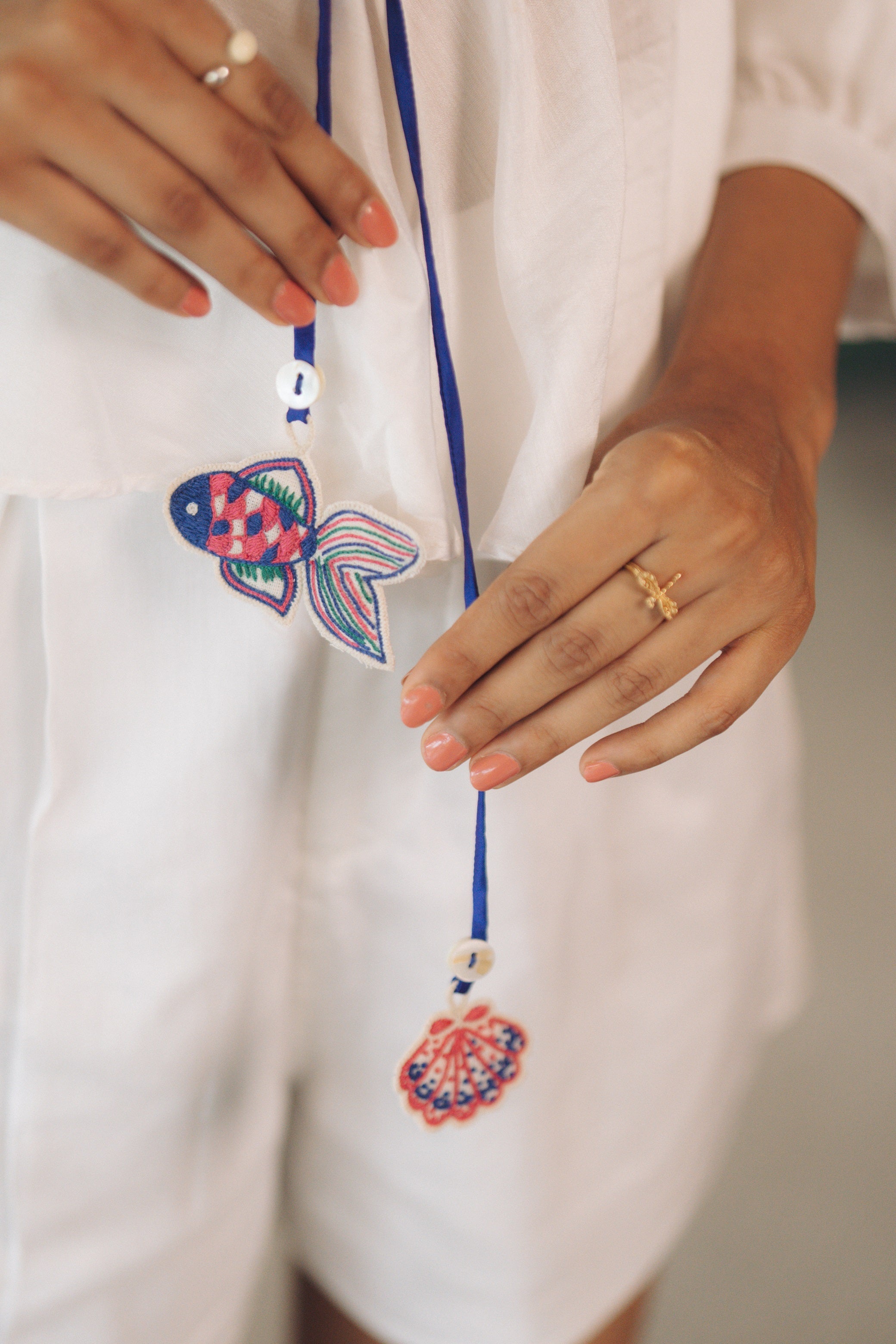 The Fish Set features delicate embroidery and sequin work, with charming fish motifs hanging from the top's waist tie. The intricate details include blue and pink hues, adding a playfulness to the overall white design.