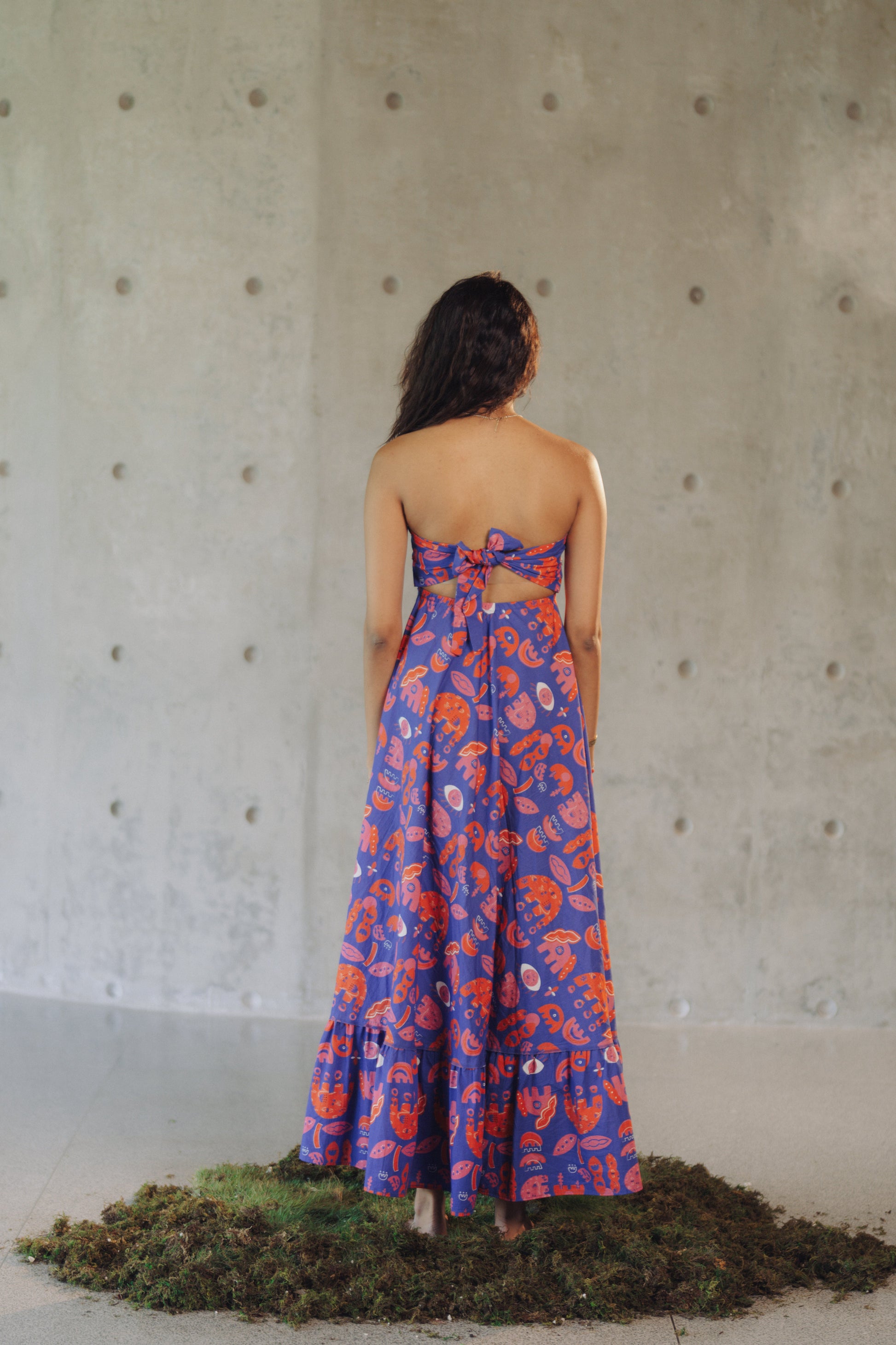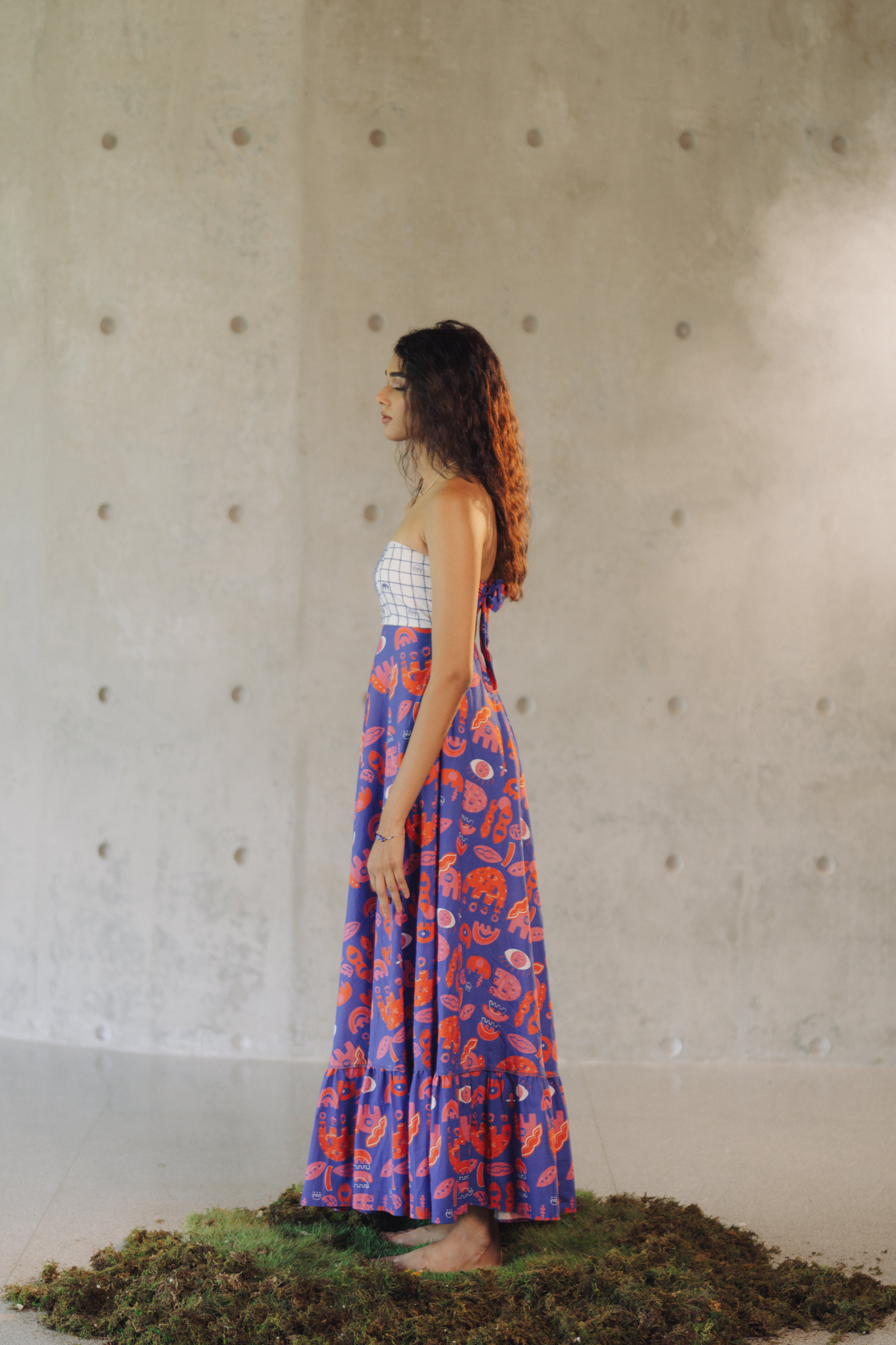 The Tube Maxi features hand-drawn prints inspired by the warmth of home, cherished family holidays, and joyful childhood memories. The top boasts a playful checkered pattern, while the body of the dress explodes in a riot of color with abstract motifs that tell a story with every glance.