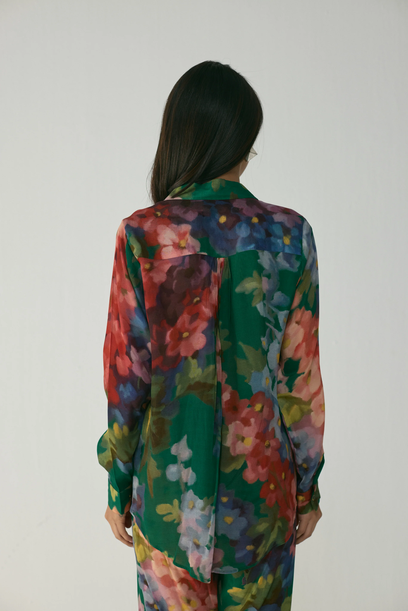 This effortlessly chic co-ord set is crafted in luxurious crepe, featuring a striking painterly floral print in rich jewel tones. The ensemble includes a relaxed button-down shirt and straight-fit trousers, both designed for ease and elegance. The fluid crepe fabric drapes beautifully on the body, offering comfort while maintaining a refined silhouette.