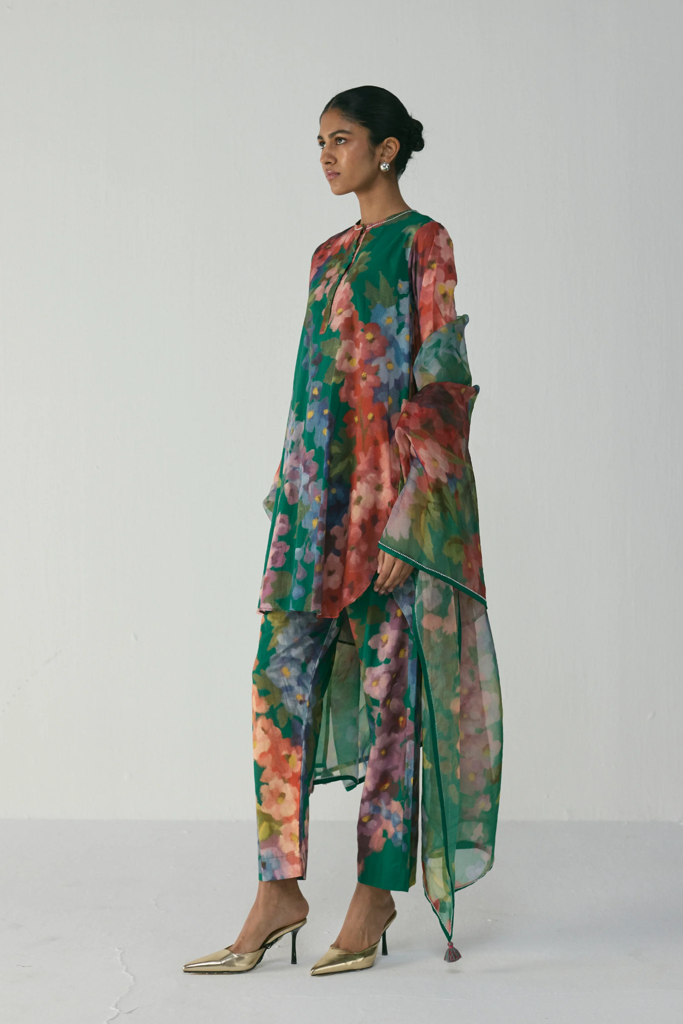 Pair this kurta set with gold or nude heels for a touch of sophistication, or opt for strappy flats for a daytime outing. Keep accessories minimal — think statement studs or delicate hoops — to let the print take center stage.