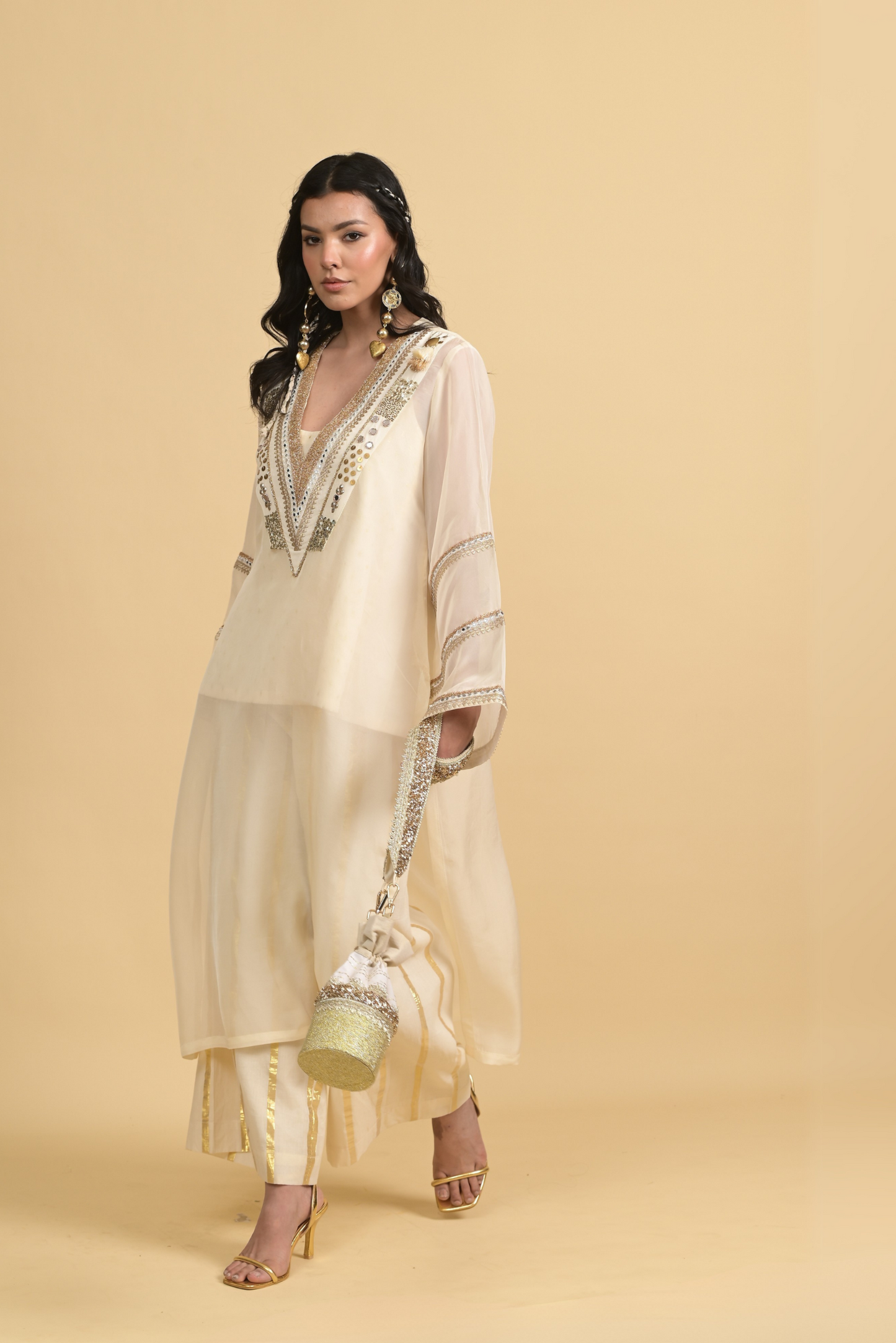 Fabric: Egyptian Cotton & Organza Main Color: Ivory Design Features: Scattered appliqué embroidery. Includes: Kurta, Pants & Inner Slip
