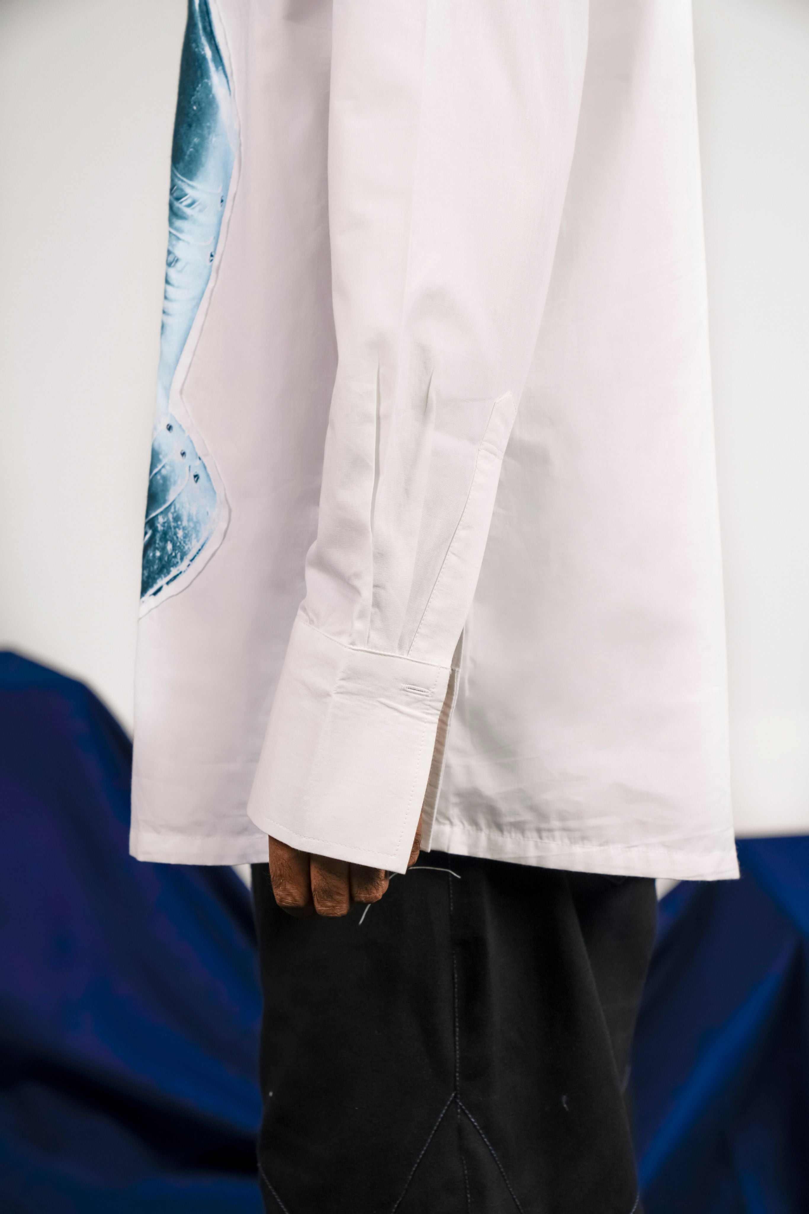 Trompe-l'œil armour design patched on the front inspired by the strength and tenacity of ancient warriors. This full sleeve oversized shirt is made from breathable and light cotton poplin fabric. With a wide shirt collar, regular placket and wide cuffs on the sleeves, this shirt is made for the unbreakable!