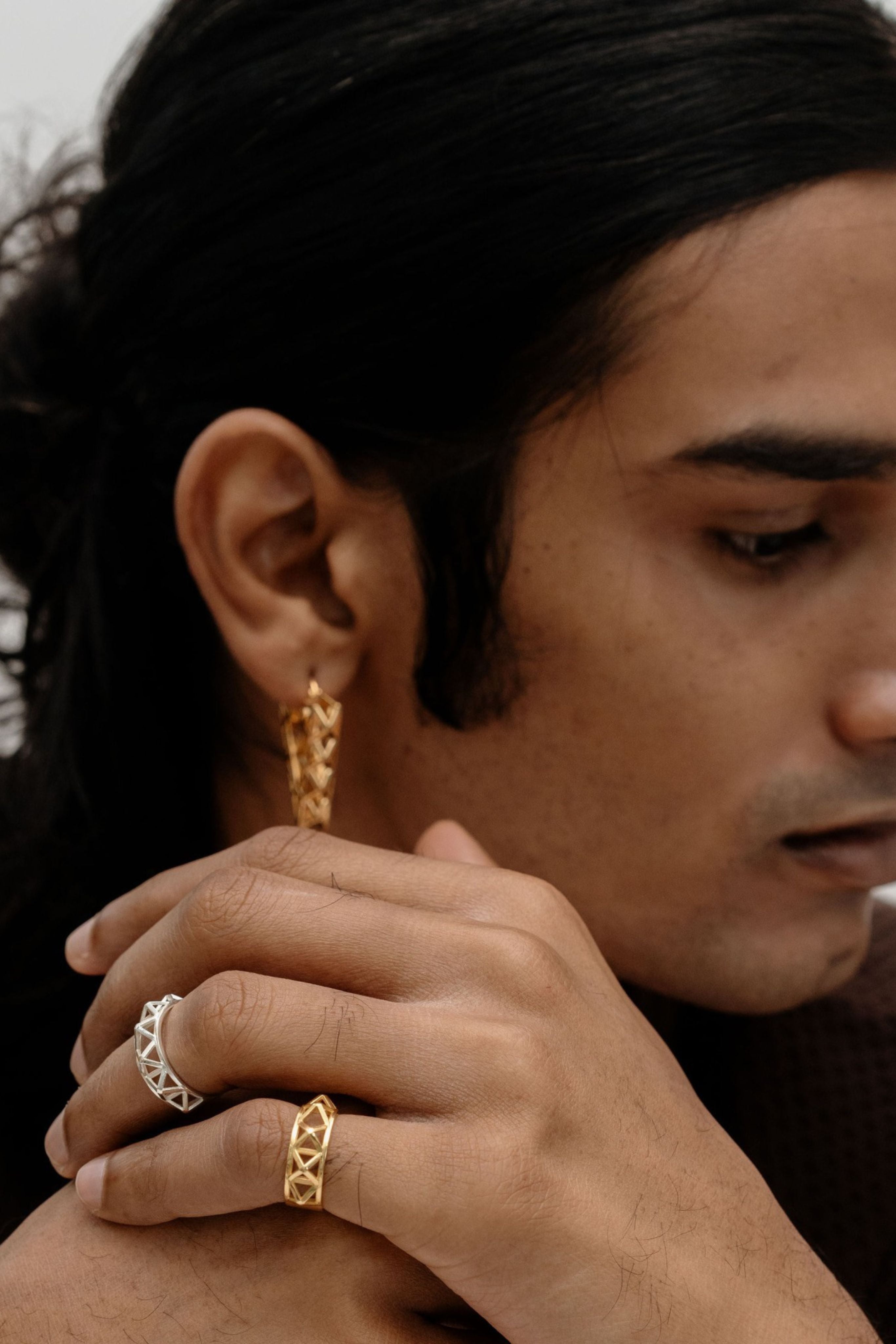 Ring with metal framework detail. Handcrafted in Brass with 18k gold plating and rhodium plating.