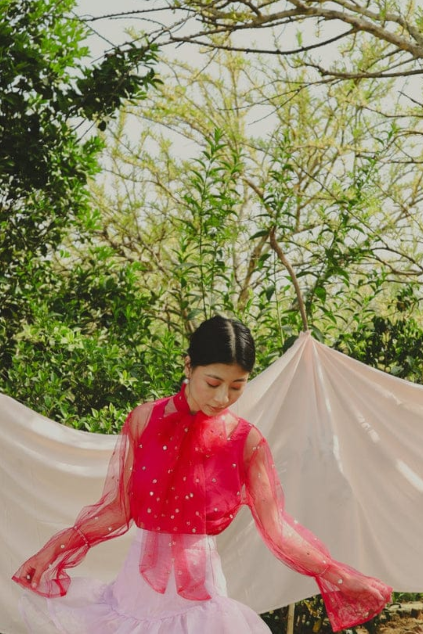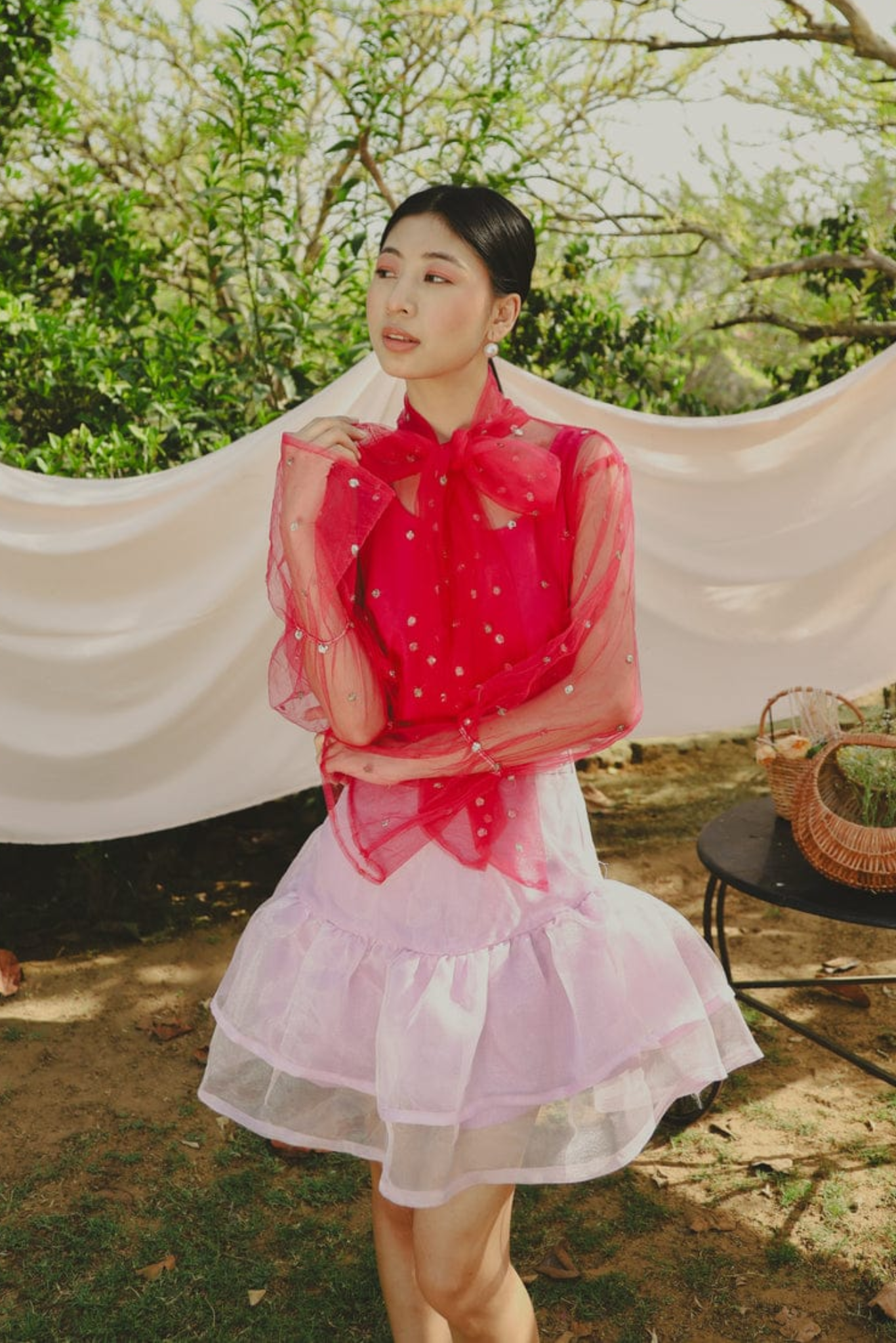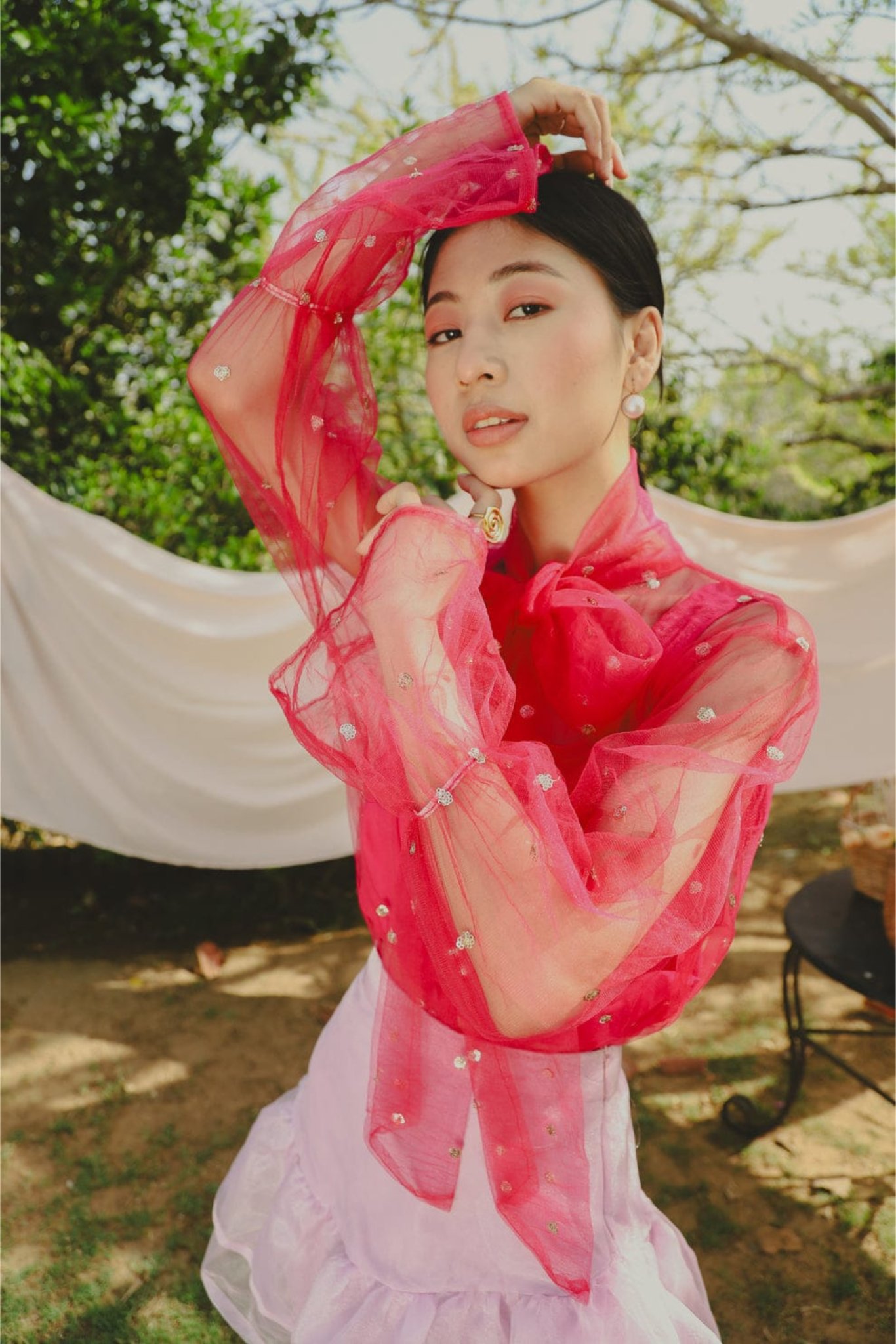 Tulle top with dainty star sequin highlights. Romanticized bow detailing and exaggerated sleeves. Perfect addition for the summer evenings or for the dreamy dressing.