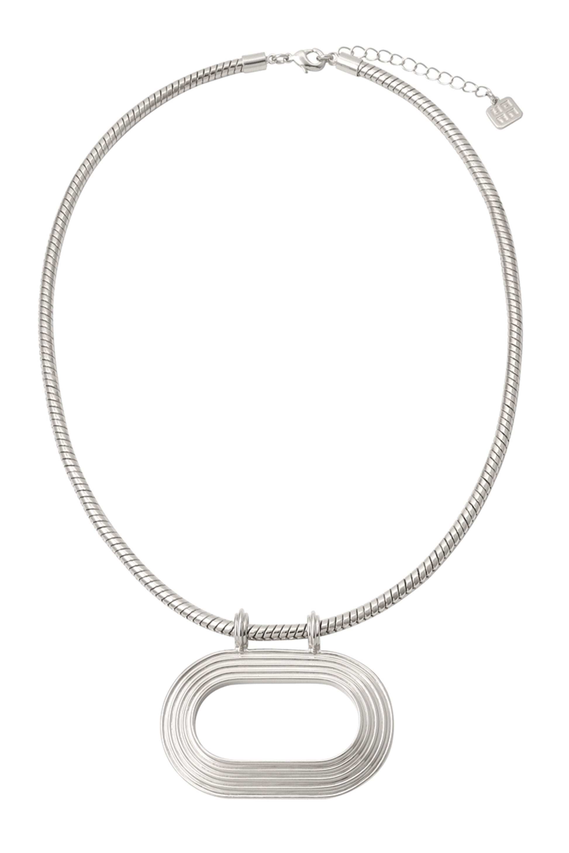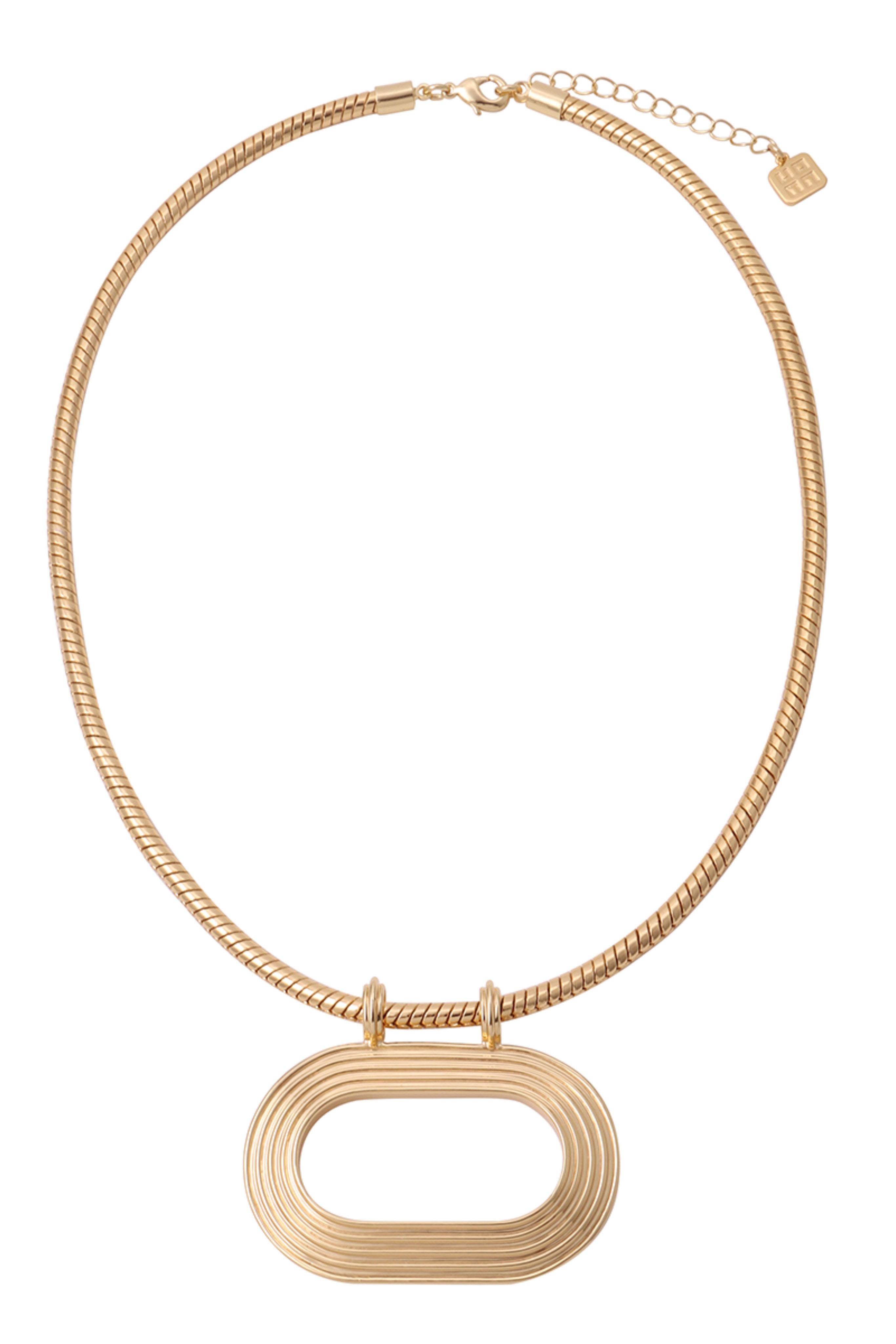 Oblong shaped pendant with stepped metal detail on a rounded snake chain. Handcrafted in Brass with 18k Gold plating and rhodium plating.