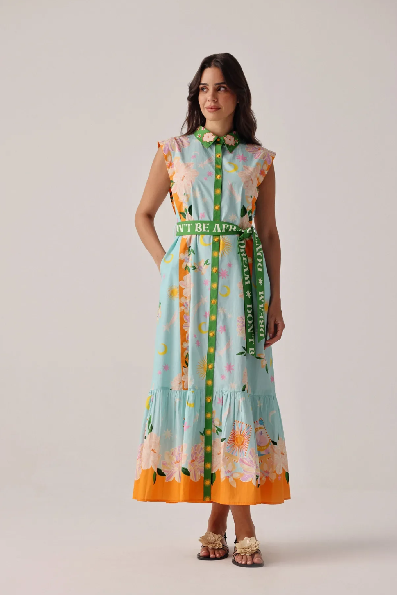 Sleeveless maxi shirtdress silhouette with button-down front