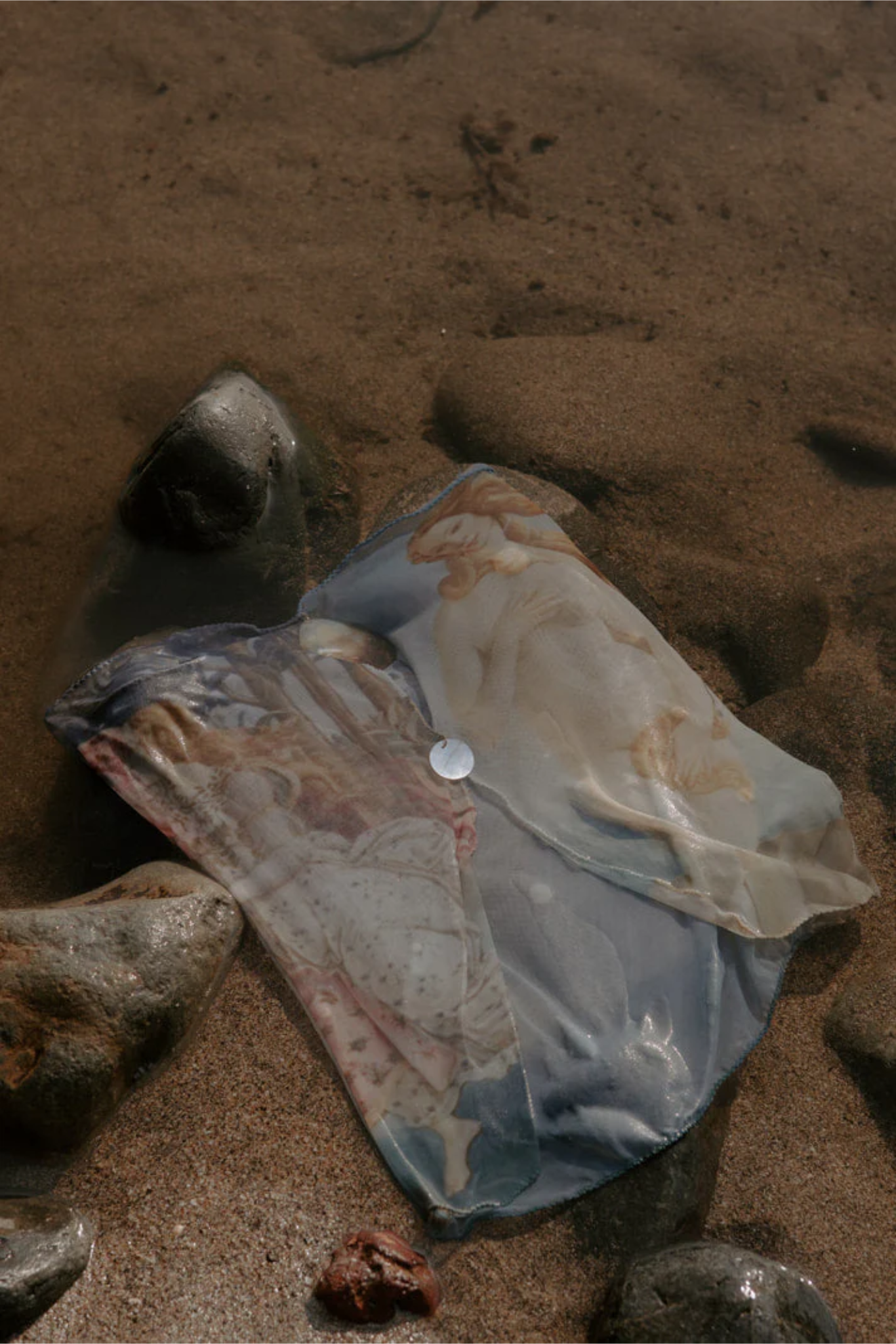 Channel divine feminine energy with the Venus Mesh Top, featuring Botticelli’s iconic Birth of Venus adorned with a luminous shell centerpiece at each closure in the front, reimagined on sheer, ocean kissed mesh. Lightweight, body-hugging, and utterly poetic this piece turns your torso into a moving masterpiece.