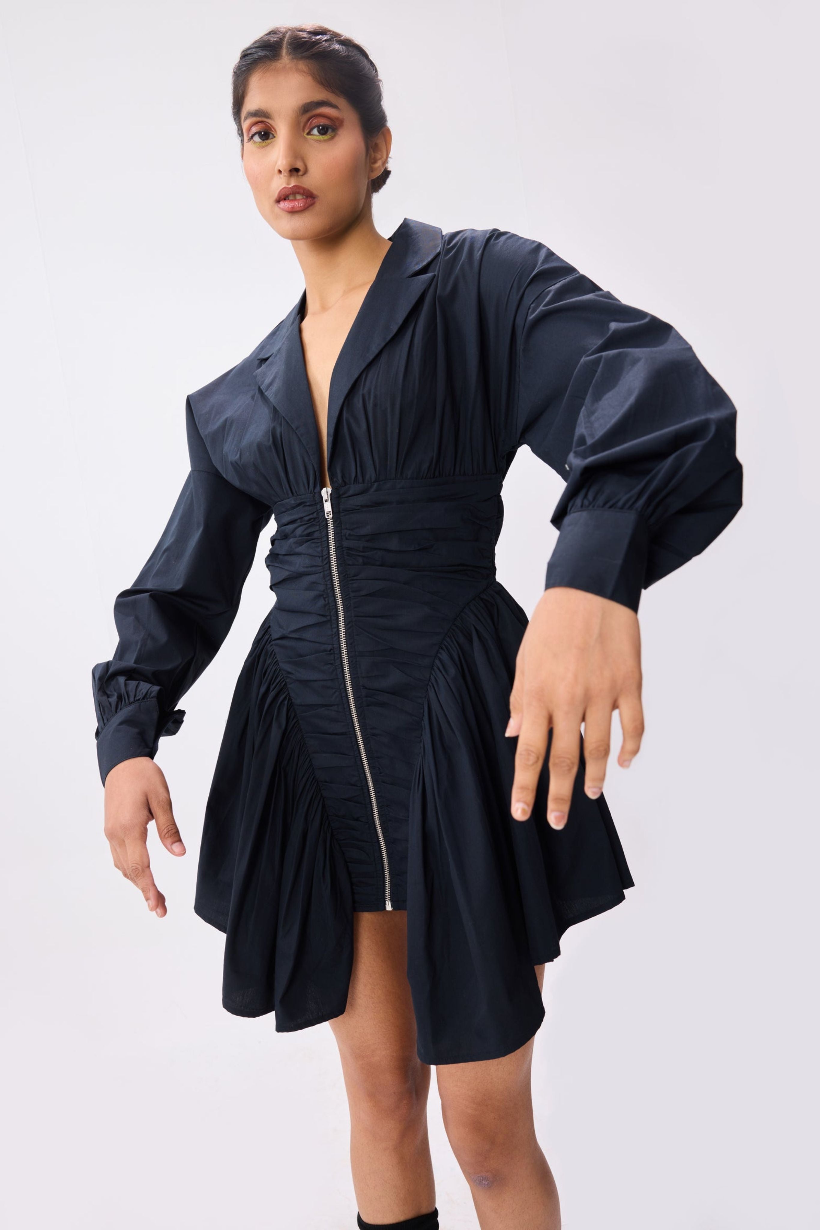 Our Victoria Dress falls straight out of the victorian era, with a contemporary twist. A classic broad lapel that gives a low cut neck, with a ruched body that is a mix of soft yet street elements. The side cuts in the shape of vintage corsets, with fabric gathered on sides to create volume. A metallic zipper to elevate the whole look.