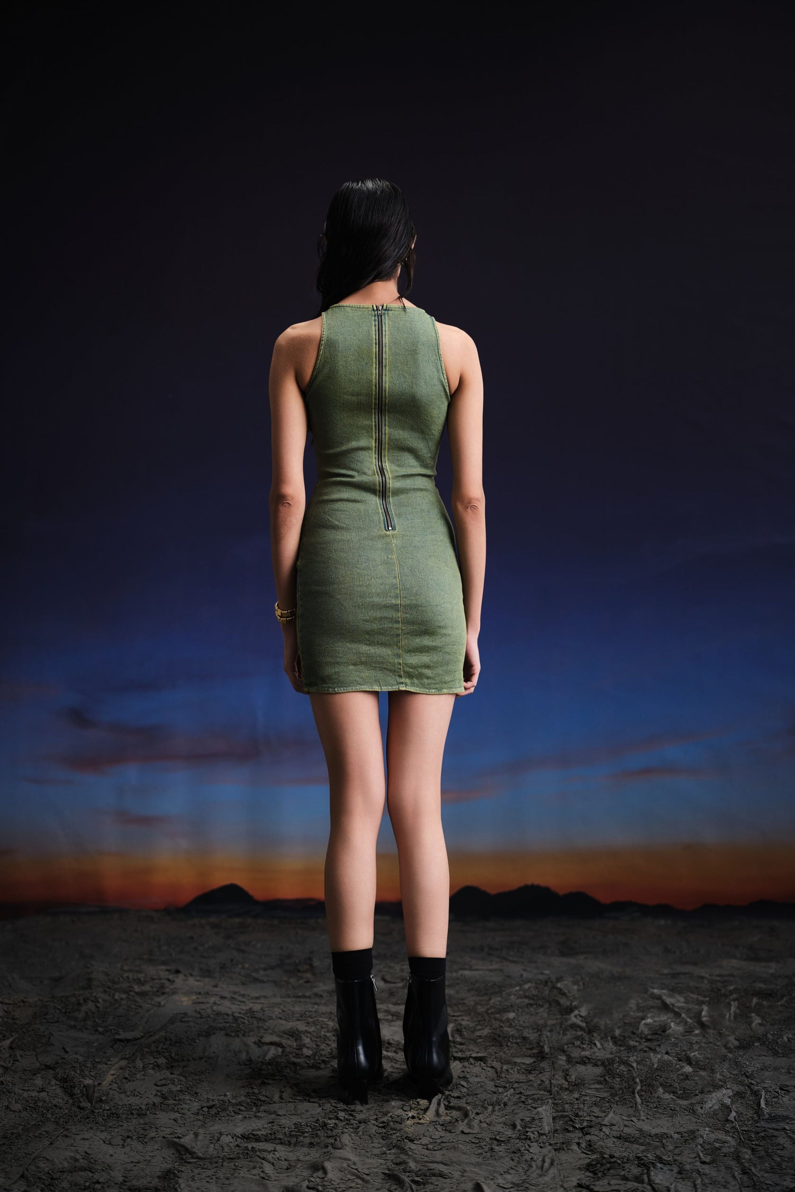 This is a perfectly crafted sleeveless mini body-con dress with a halter neckline. Key feature of this dress is the carefully constructed panel in the center, cutting the dress in half. Thin Pin tucks are emerging from it going to the side seam, symbolising the power within. A denim fabric which is highly stretchable highlights the natural curves of the body. Finished with a metallic zipper at the back.