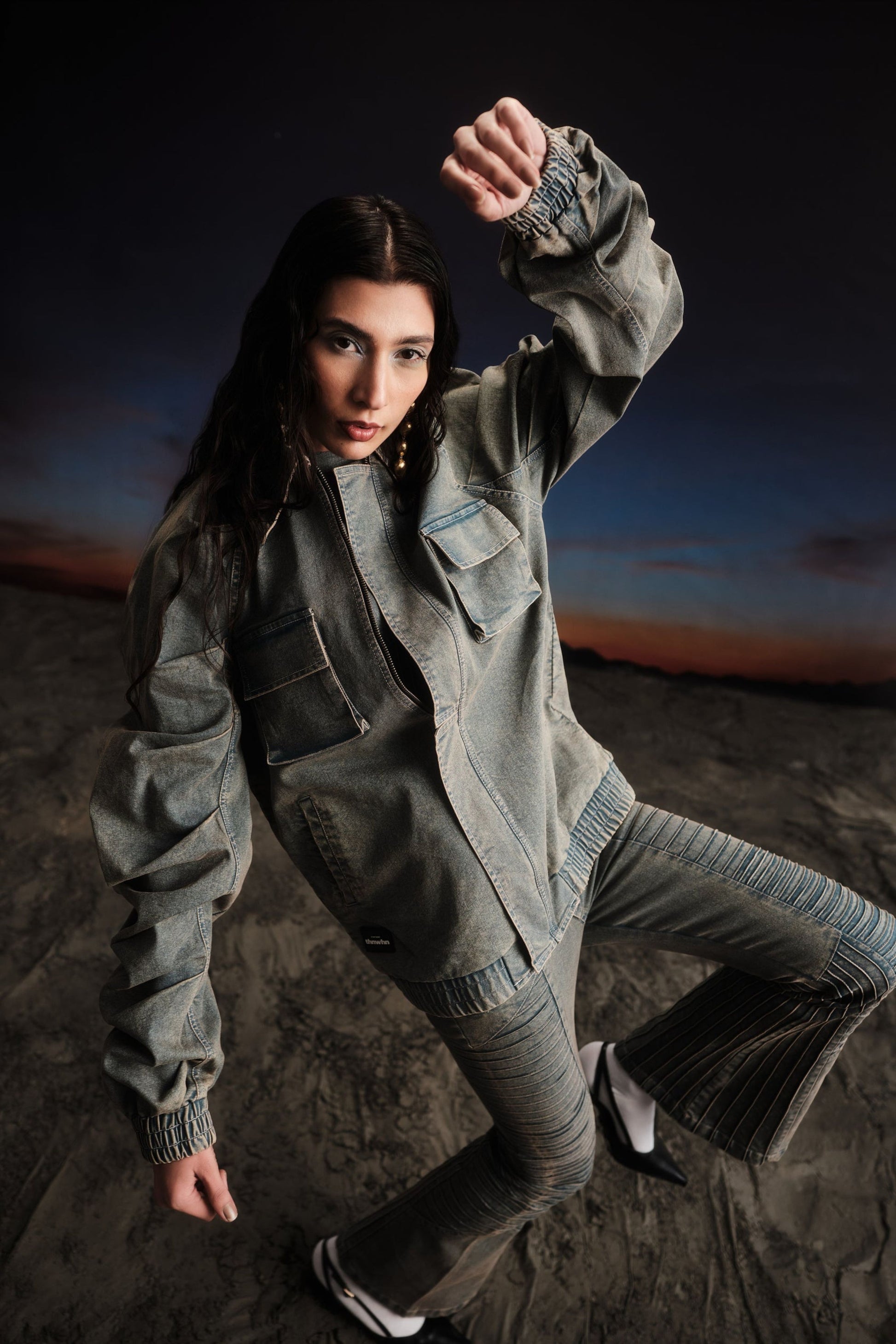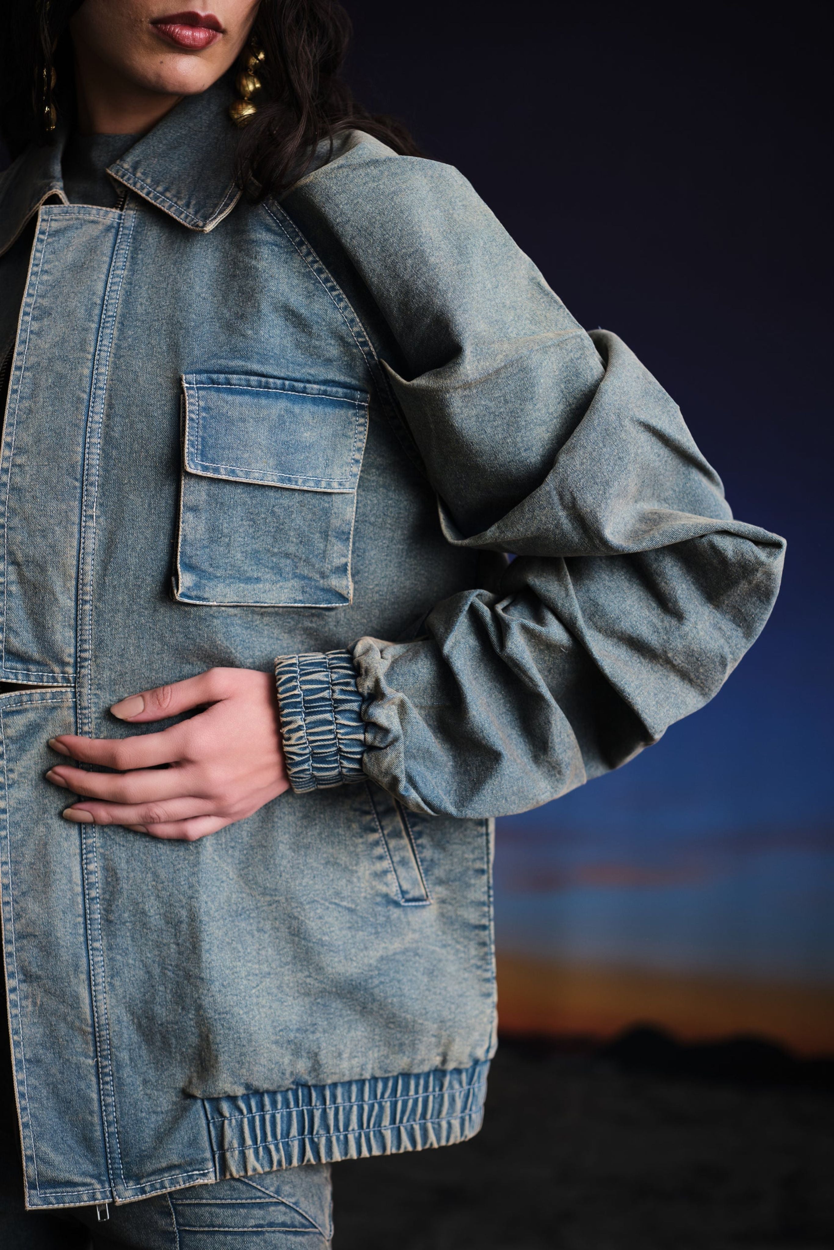 Originally made in blue denim, this jacket is acid washed to add vintage appeal to it. It features a pleated raglan sleeve that has a lot of added volume, portraying a bold look. Two welt pocket on sides and two chest pockets, a wide shirt collar, and full sleeves with elasticated cuffs and hem. Finished with a lining on the inside, a metallic zipper concealed behind a divided flap.