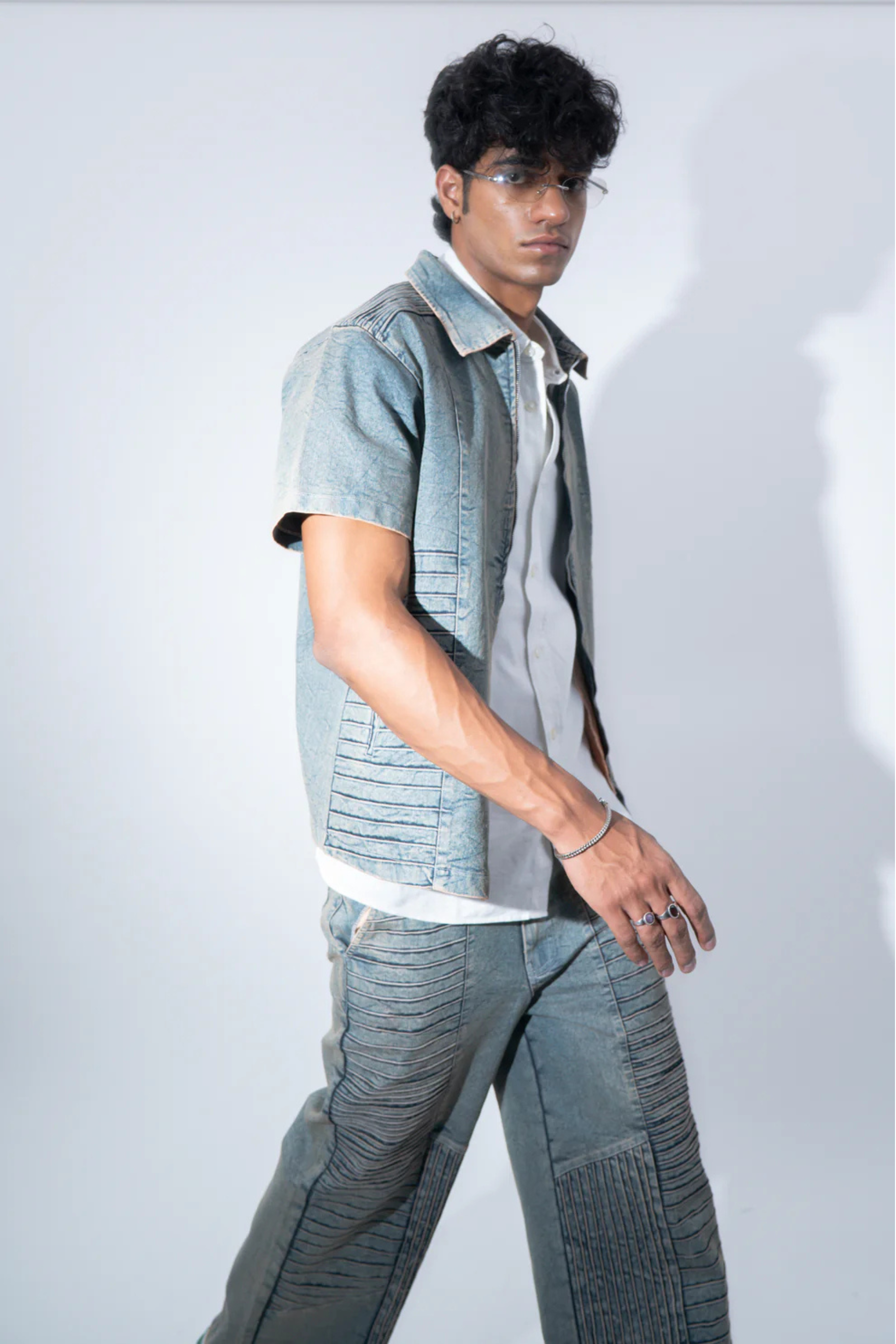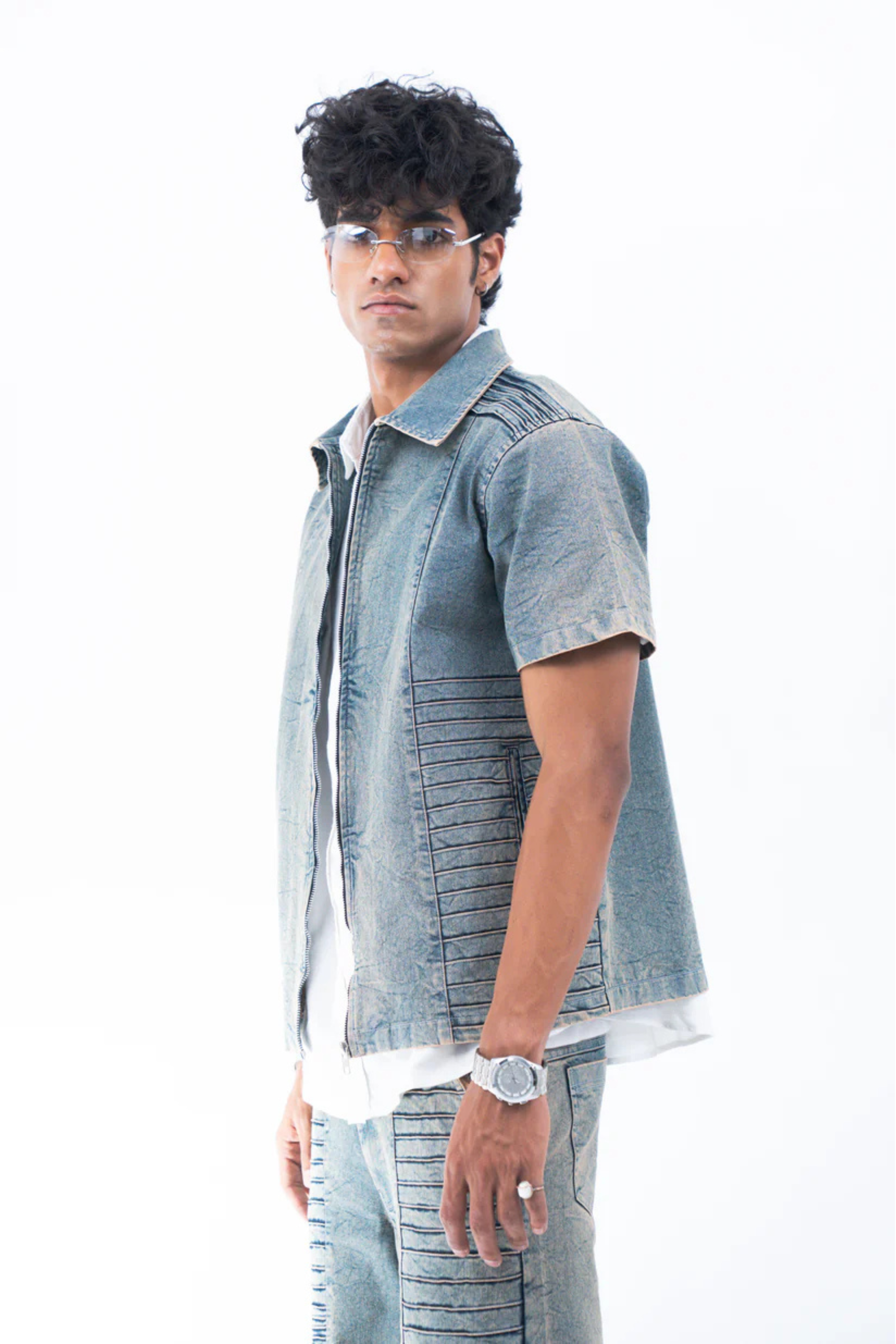 Crafted from a premium blue denim, this half-sleeve shirt features panelling detail with carefully placed pintucks along the sides and shoulder. Each pintuck is meticulously crafted in a gradient pattern to give it a stimulating texture and visual effect. Inspired by the silence before the storm, the shirt is enzyme washed to give it our signature vintage effect with a worn out texture.