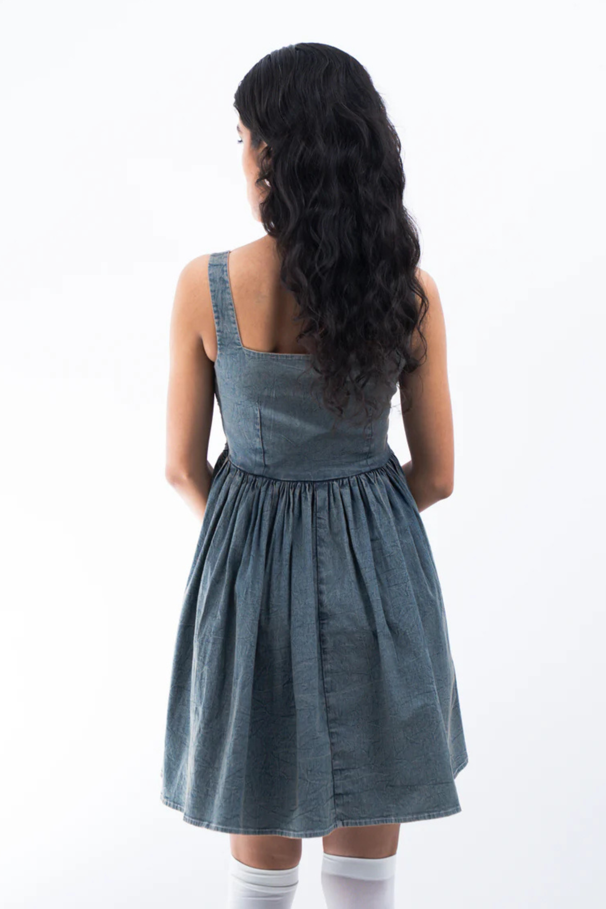 Crafted from lightweight, flowy denim, this dress drapes beautifully while sculpting the body in all the right places. Delicate pintucked panelling at the bust blends seamlessly into soft Victorian-inspired gathers that cascade from the sides to the back. A corset-style front with structured panelling and an adjustable drawstring detail adds both edge and romance. Finished with a discreet side zipper for ease and functionality.