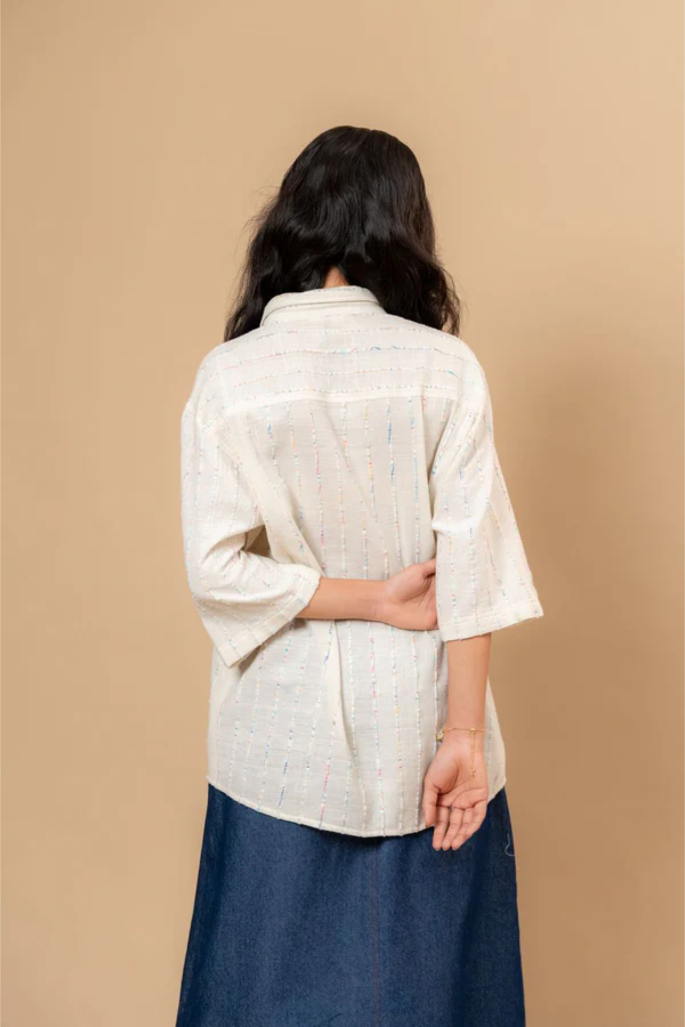 Oversized unisex shirt made from handwoven upcycled fabric, featuring a double collar and human embroidery.
