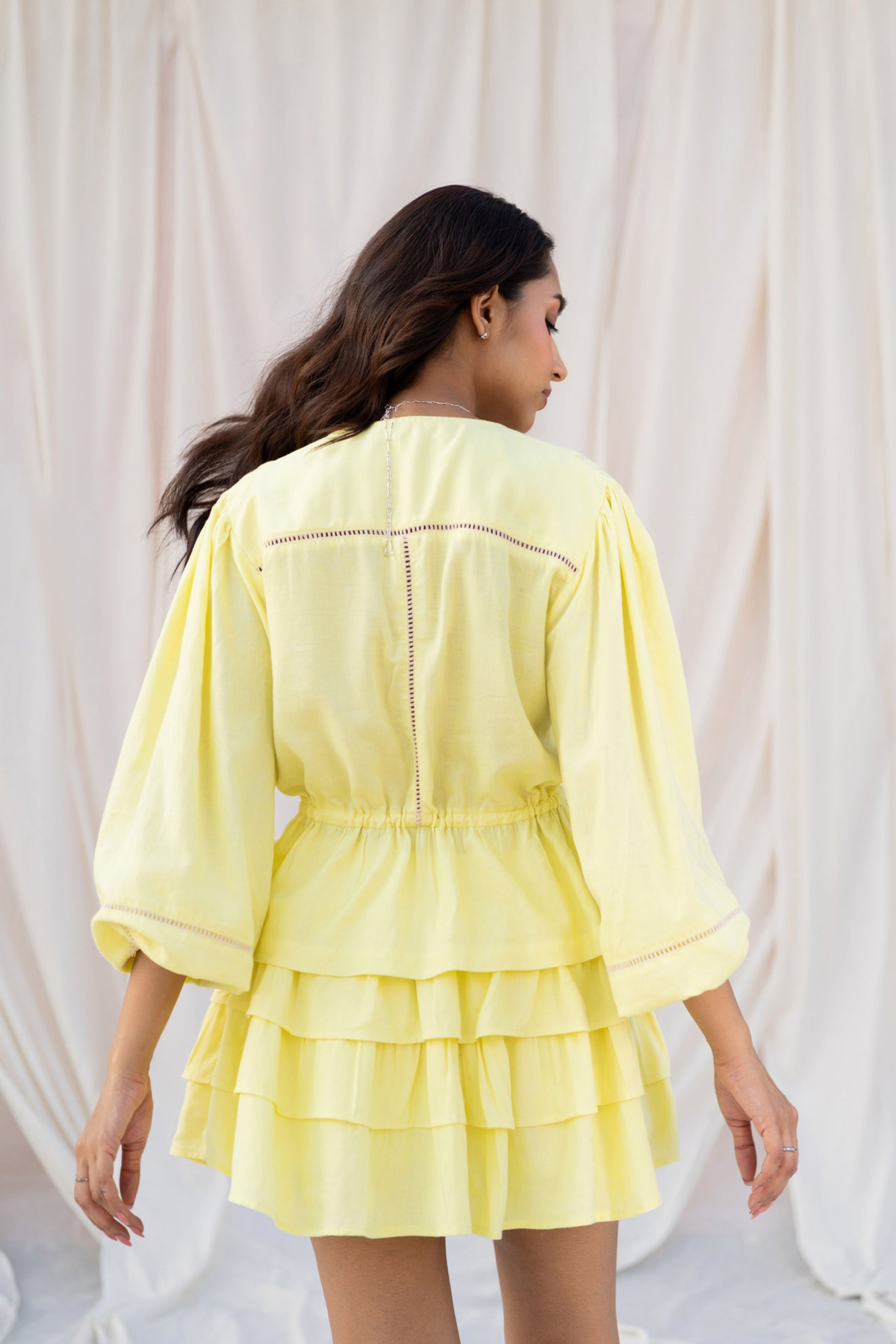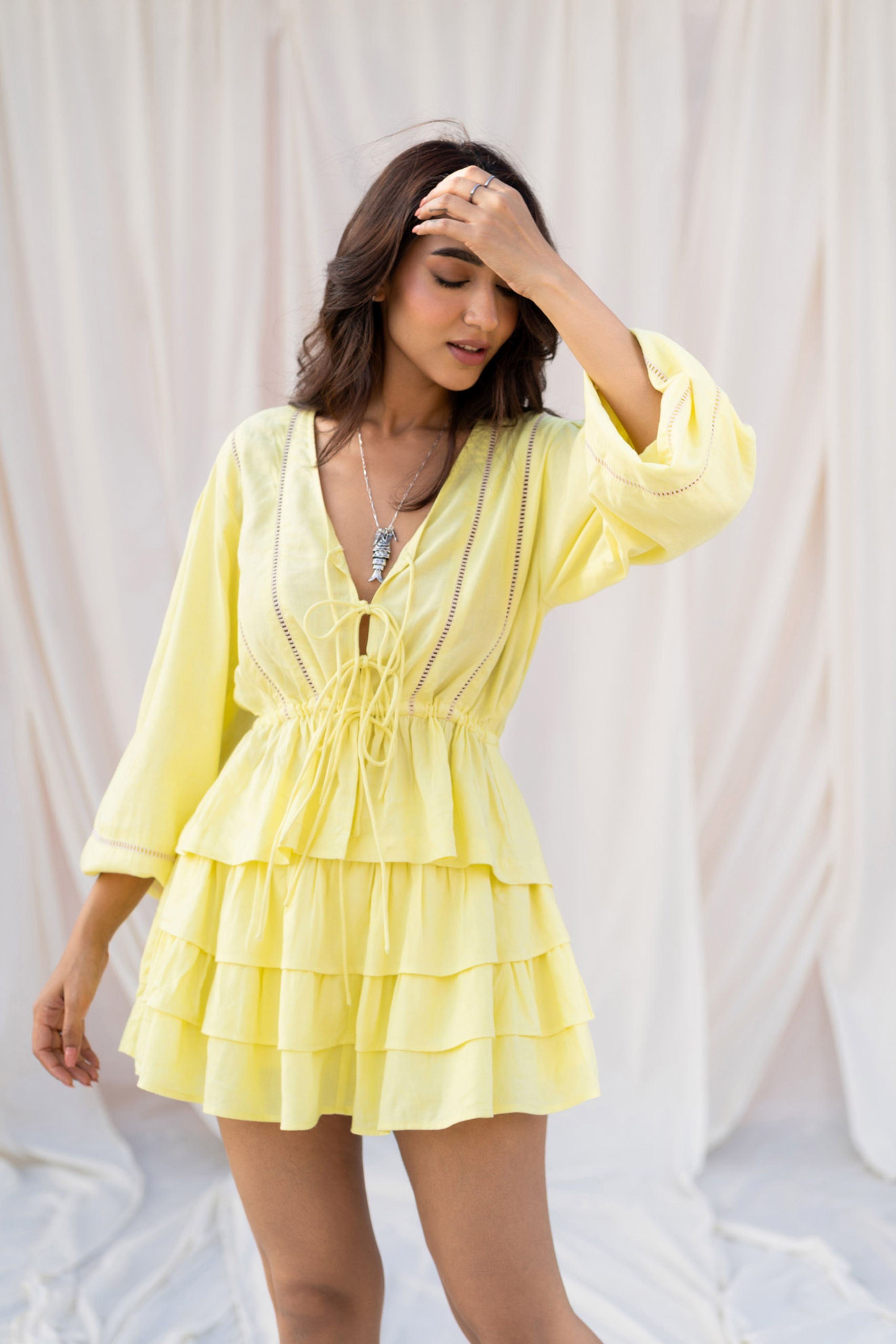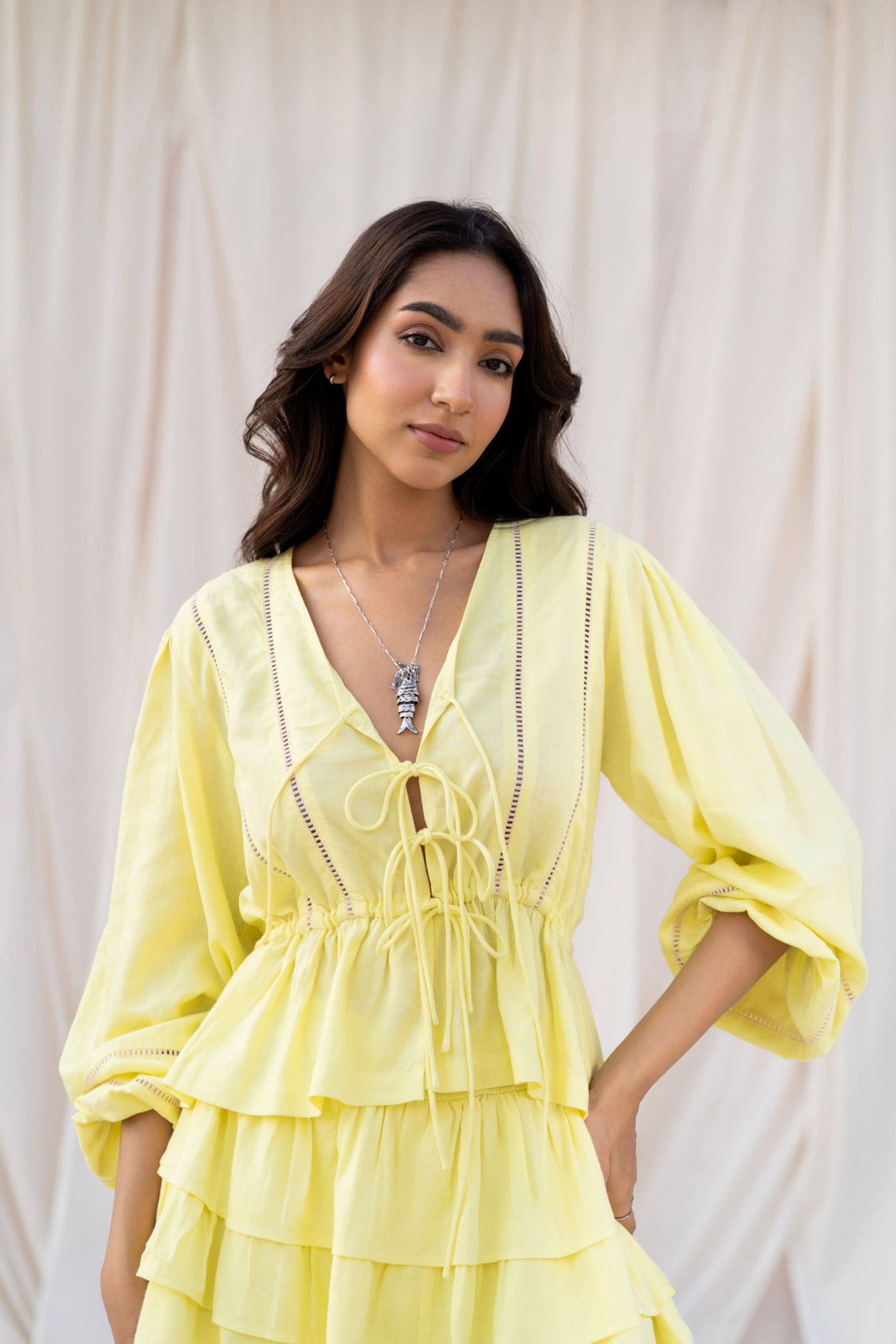 V-neck with front tie-up detail.