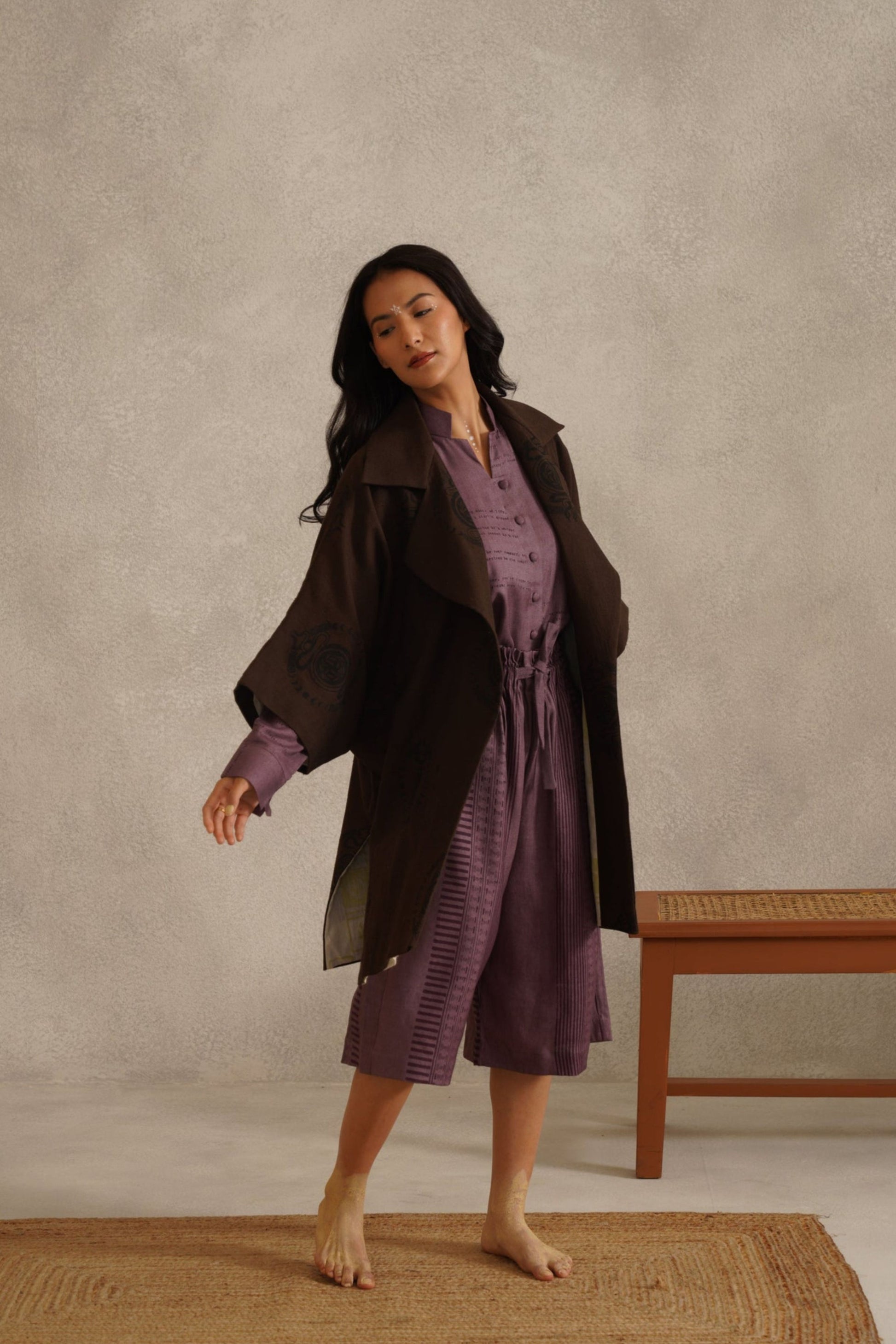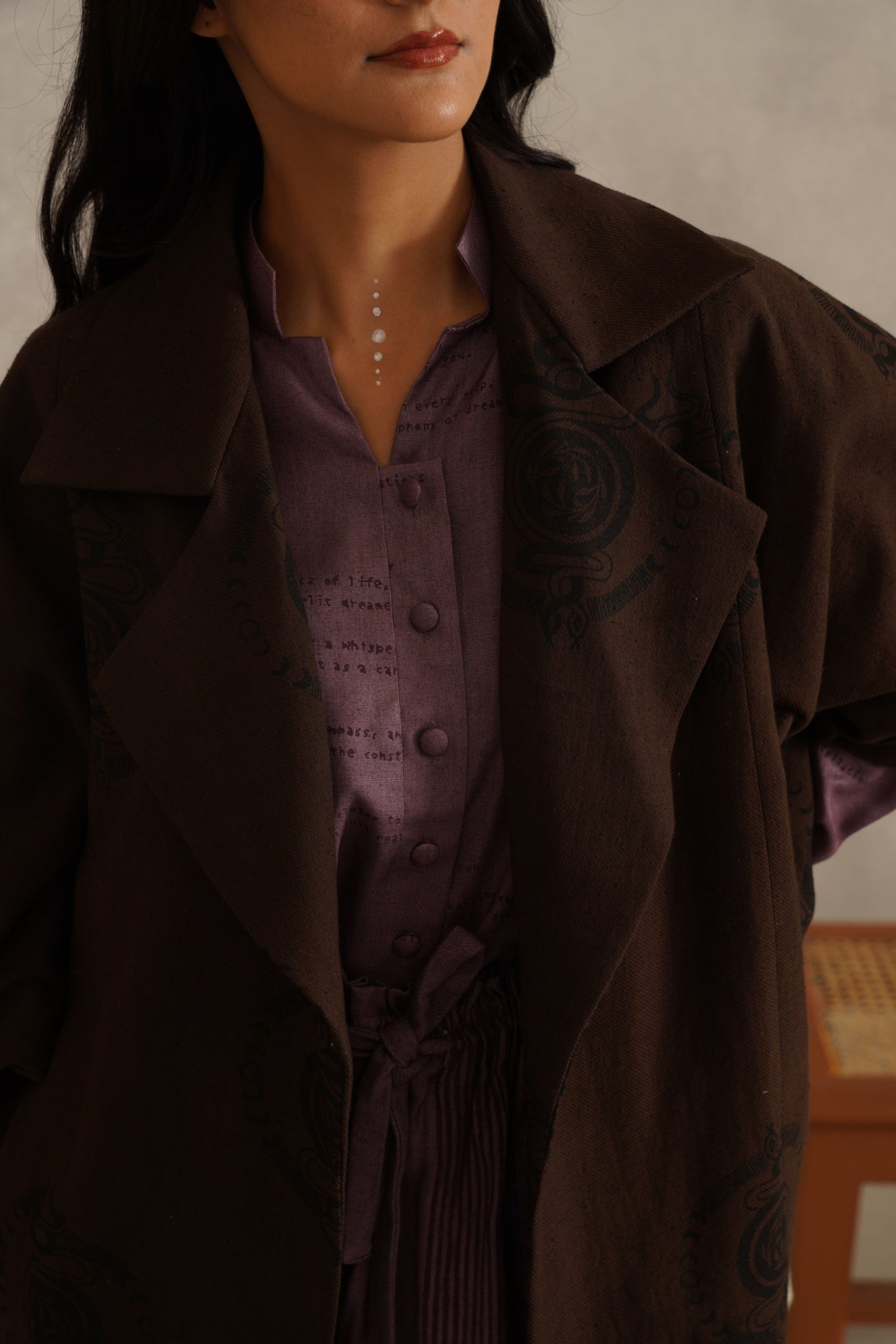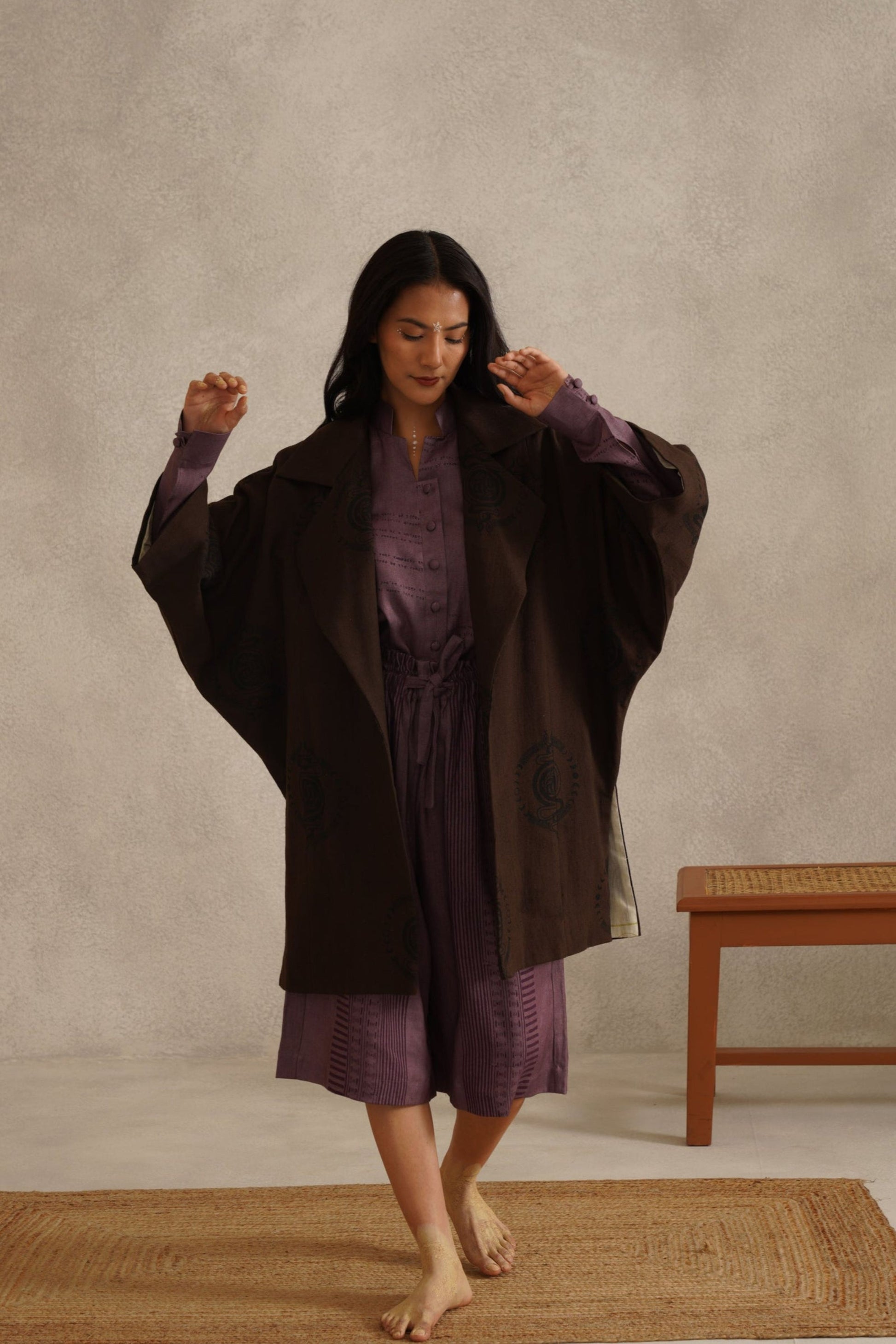 A jacket that sees and soothes — crafted in handwoven Kala Cotton, its batwing form drapes like a gentle spell. The block-printed moons and intuitive snakes speak of your unique power and inner knowing. Wear it as armor for slow days, moonlit strolls, or conscious celebration.